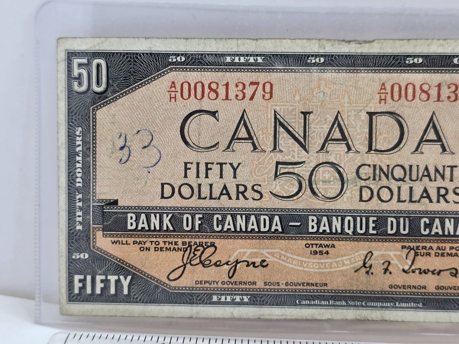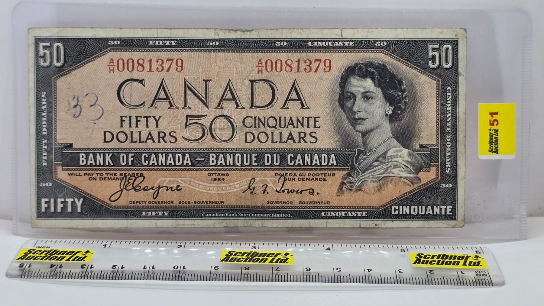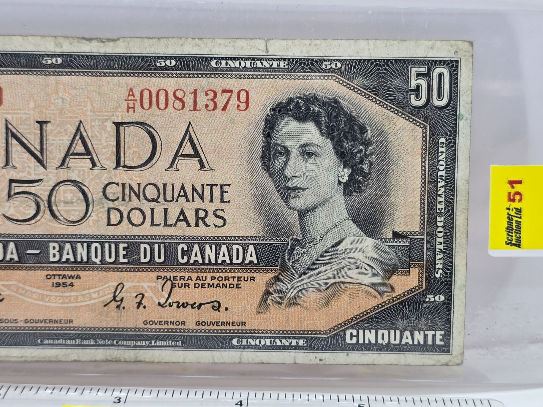 Canada $50 Bill 1954DF "Devil's Face" : Coyne/Towers #AH0081379 (See Pics for Varieties, Conditions, Serial Numbers, Printing Dates & Signatures) (Listing & Descriptions are a GUIDE ONLY and are subject to changes, errors, additions or deletions. Please use the provided pictures to satisfy yourself to the Condition and/or Grades. Please Read & Understand All Terms & Conditions for this Auction Sale.)