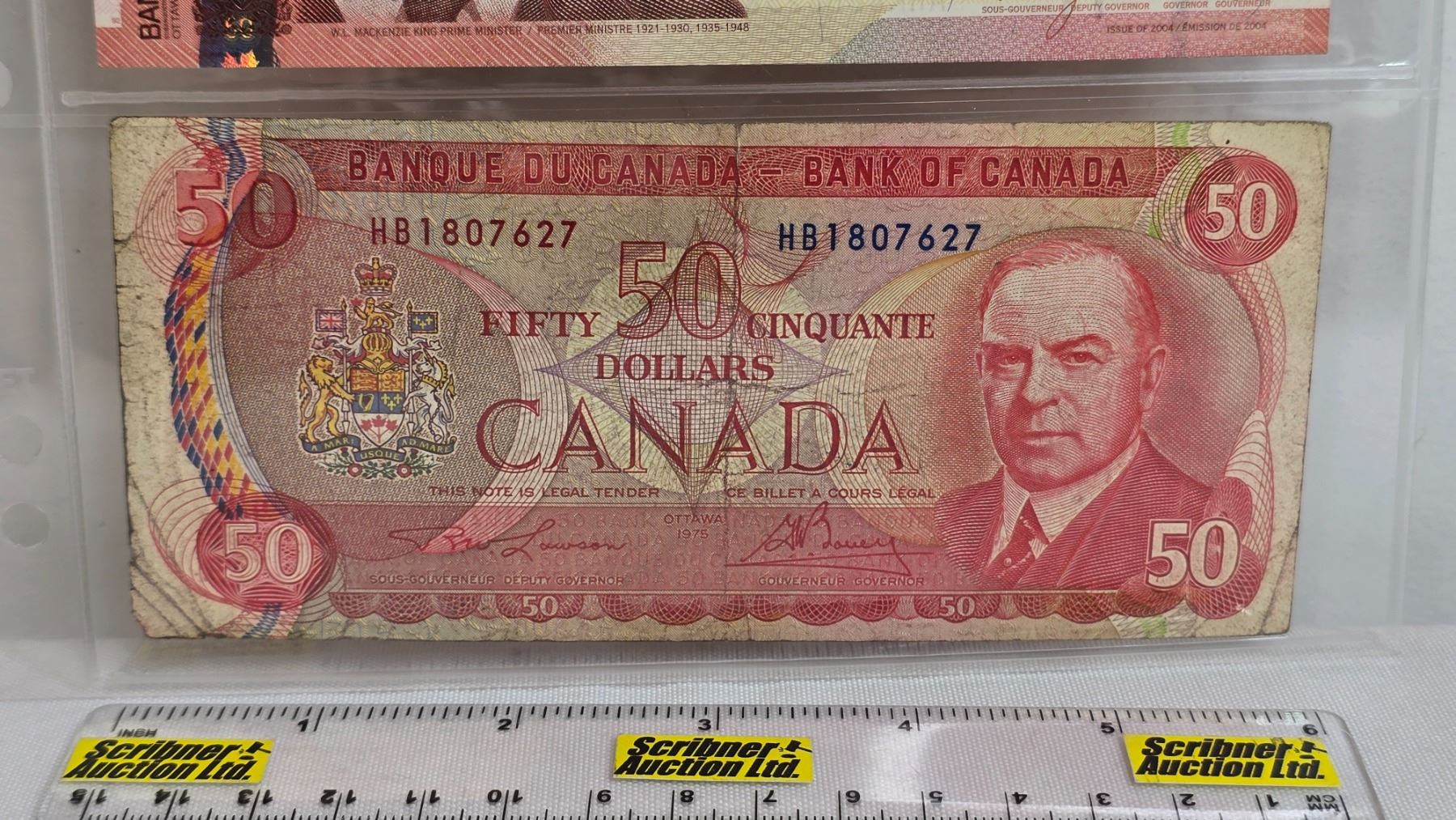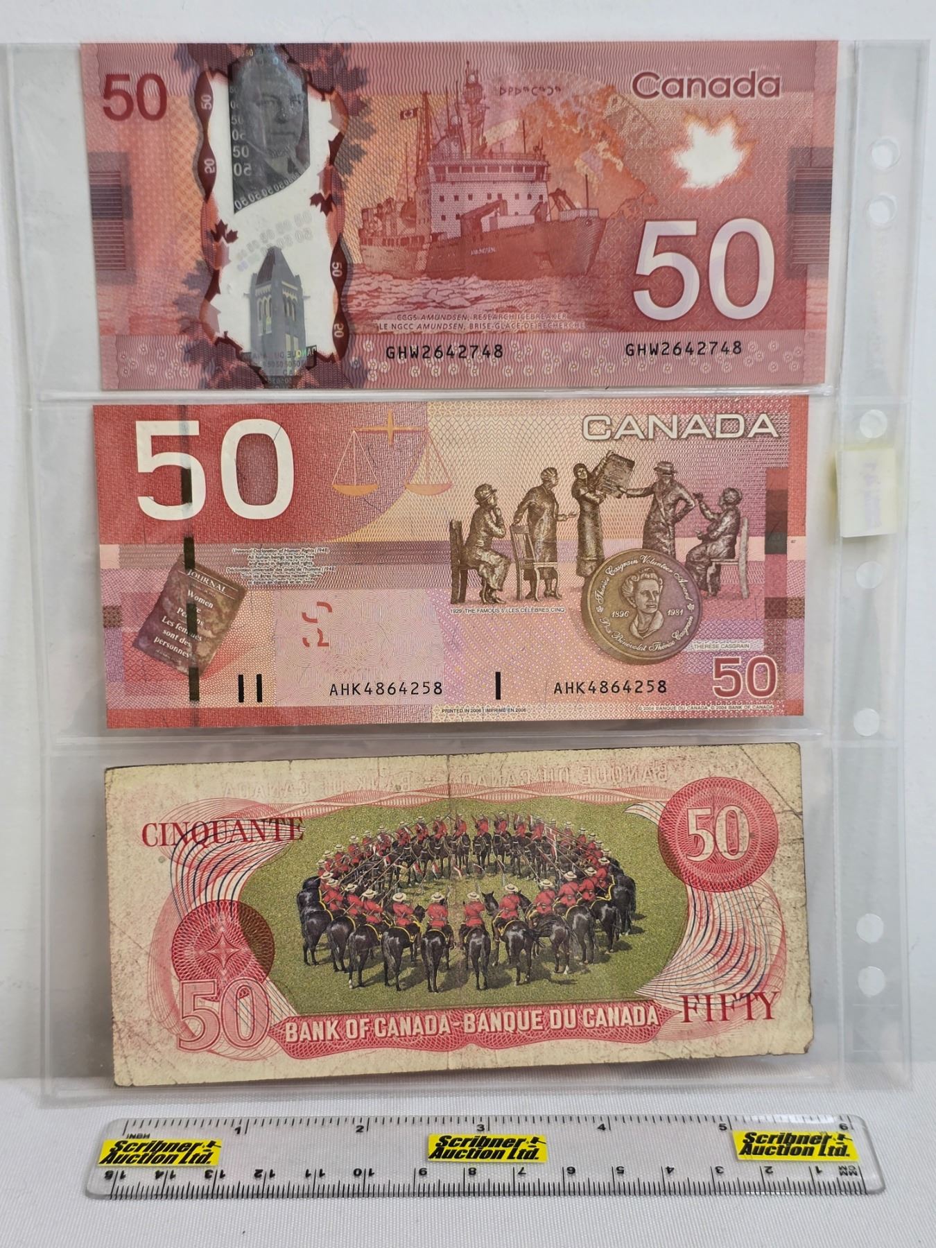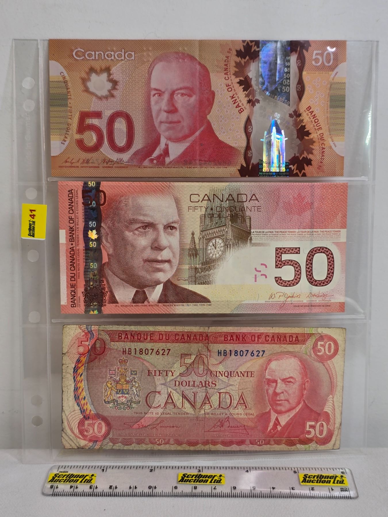Canada $50 Bills (3): - 1975 Lawson/Bouey #HB1807627 - 2004 Jenkins/Dodge #AHK4864258 - 2012 Wilkins/Poloz #GHW2642748 (See Pics for Varieties, Conditions, Serial Numbers, Printing Dates & Signatures) (Listing & Descriptions are a GUIDE ONLY and are subject to changes, errors, additions or deletions. Please use the provided pictures to satisfy yourself to the Condition and/or Grades. Please Read & Understand All Terms & Conditions for this Auction Sale.)