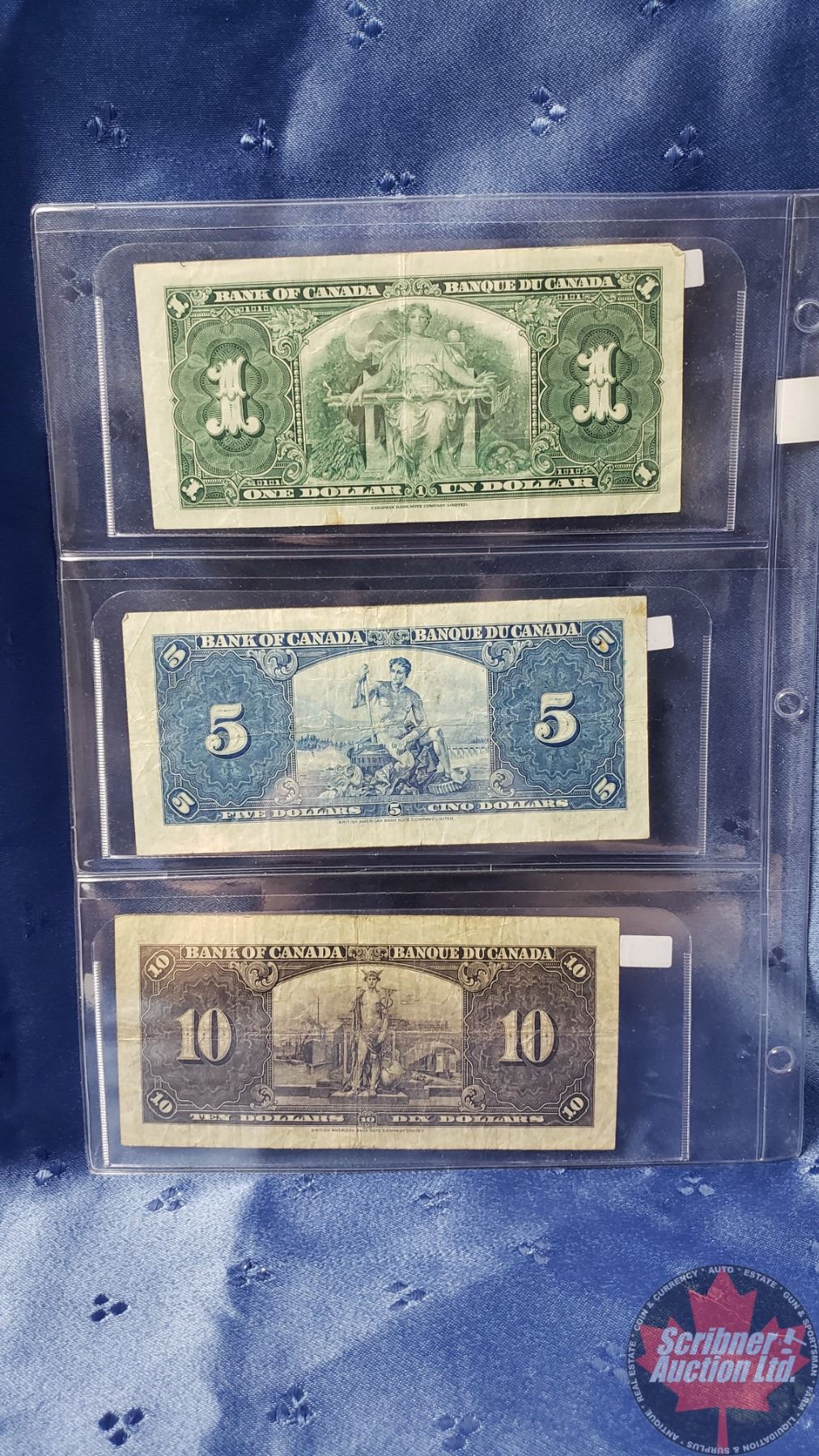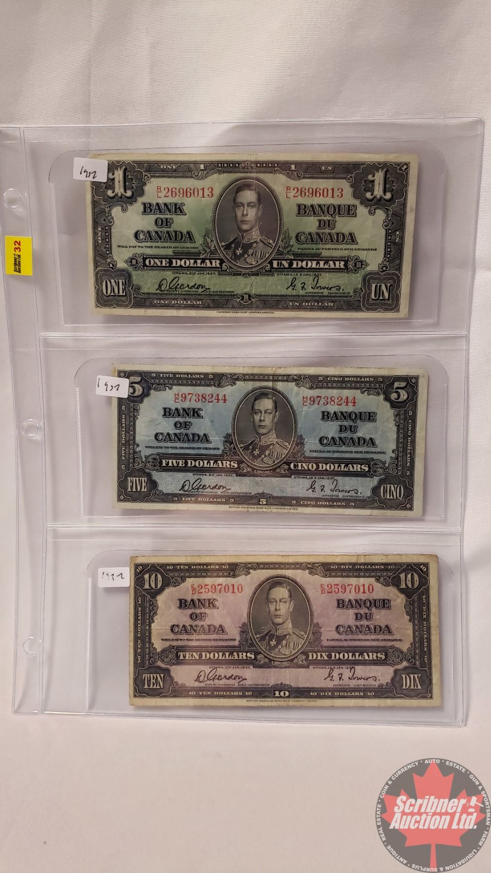 Canada Bills 1937 (3) Gordon/Towers : $1 ; $5 ; $10 (See Pics for Signatures/Serial Numbers)