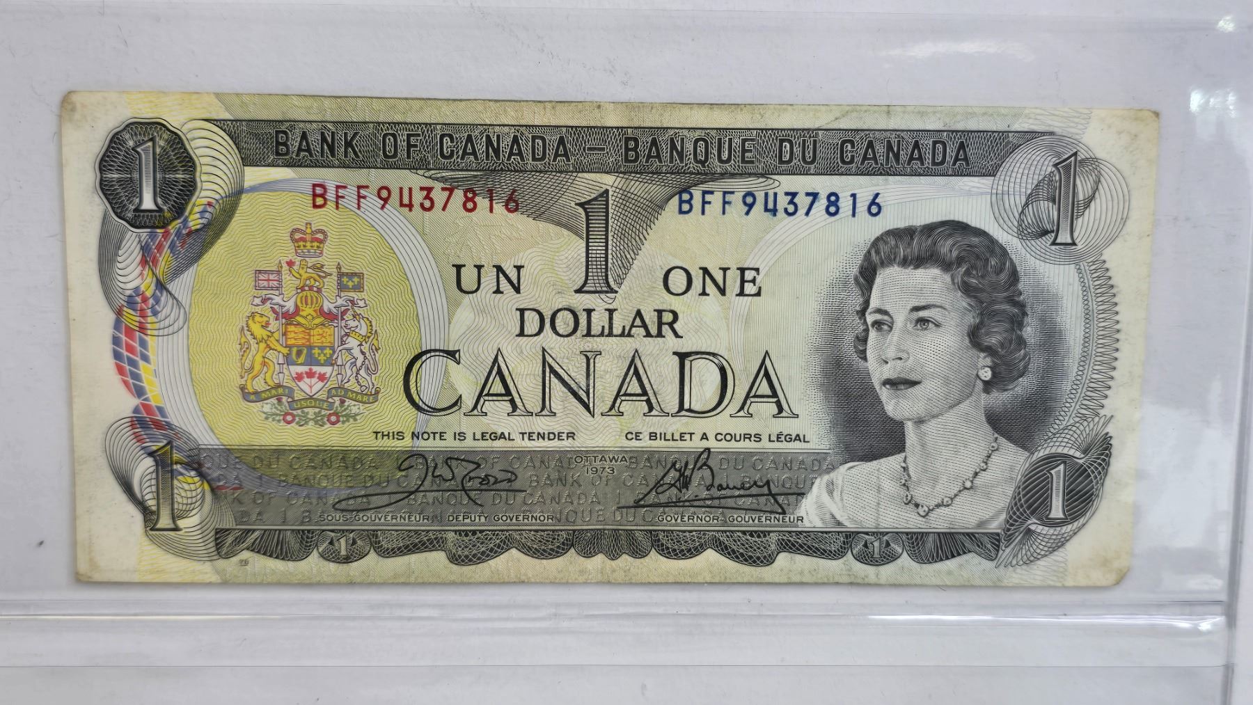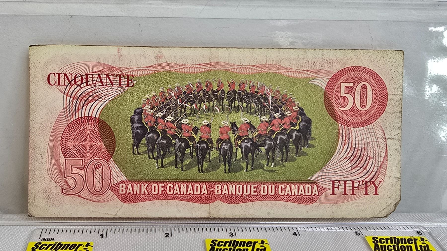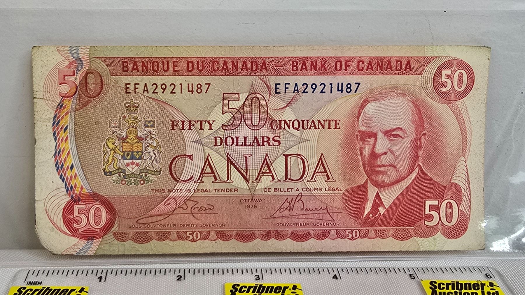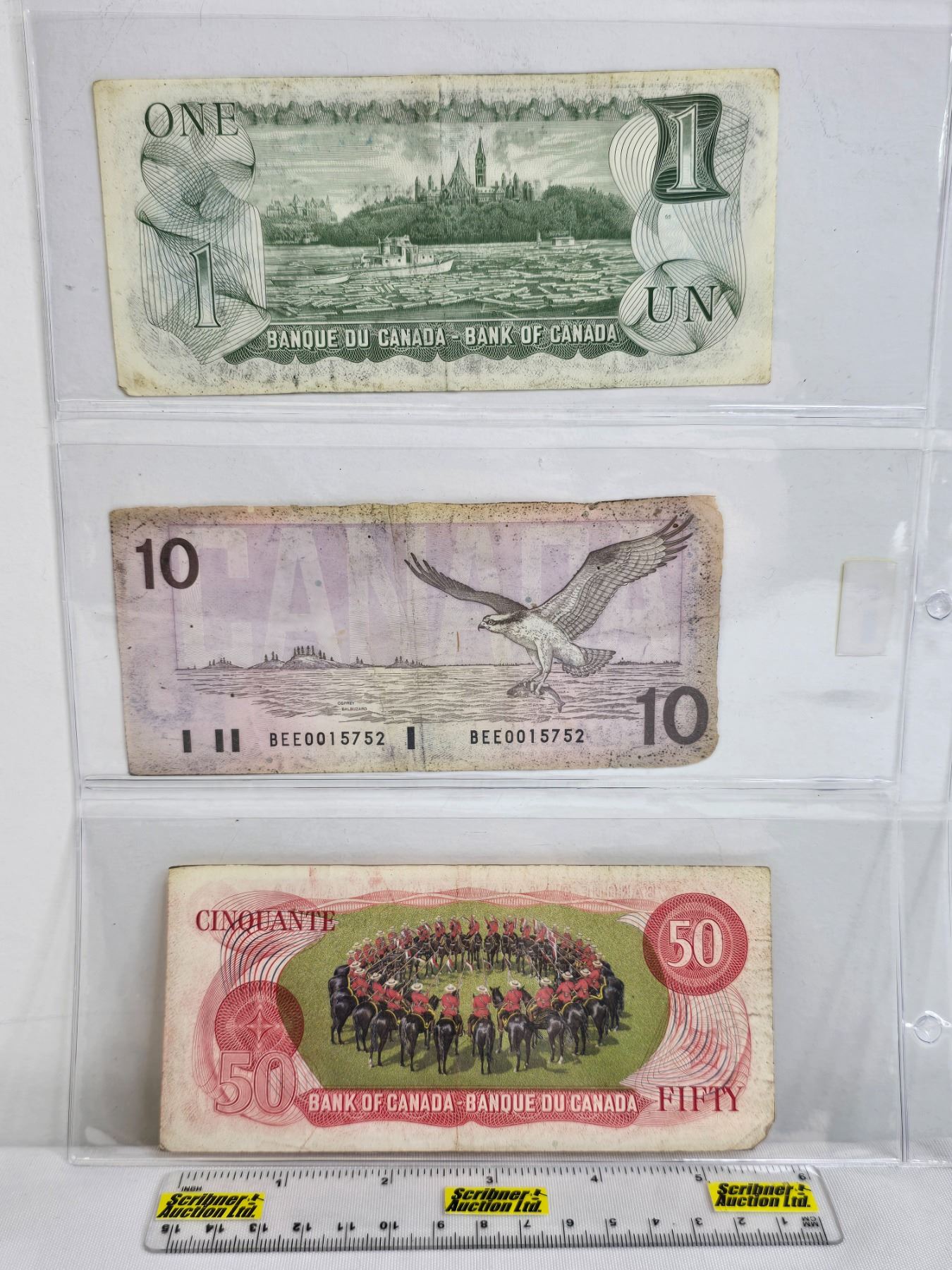 Canada Bills (3): - 1973 $1 : Crow/Bouey #BFF9437816 - 1989 $10 : Bonin/Thiessen #BEE0015752 - 1975 $50 : Crow/Bouey #EFA2921487 (See Pics for Varieties, Conditions, Serial Numbers, Printing Dates & Signatures) (Listing & Descriptions are a GUIDE ONLY and are subject to changes, errors, additions or deletions. Please use the provided pictures to satisfy yourself to the Condition and/or Grades. Please Read & Understand All Terms & Conditions for this Auction Sale.)