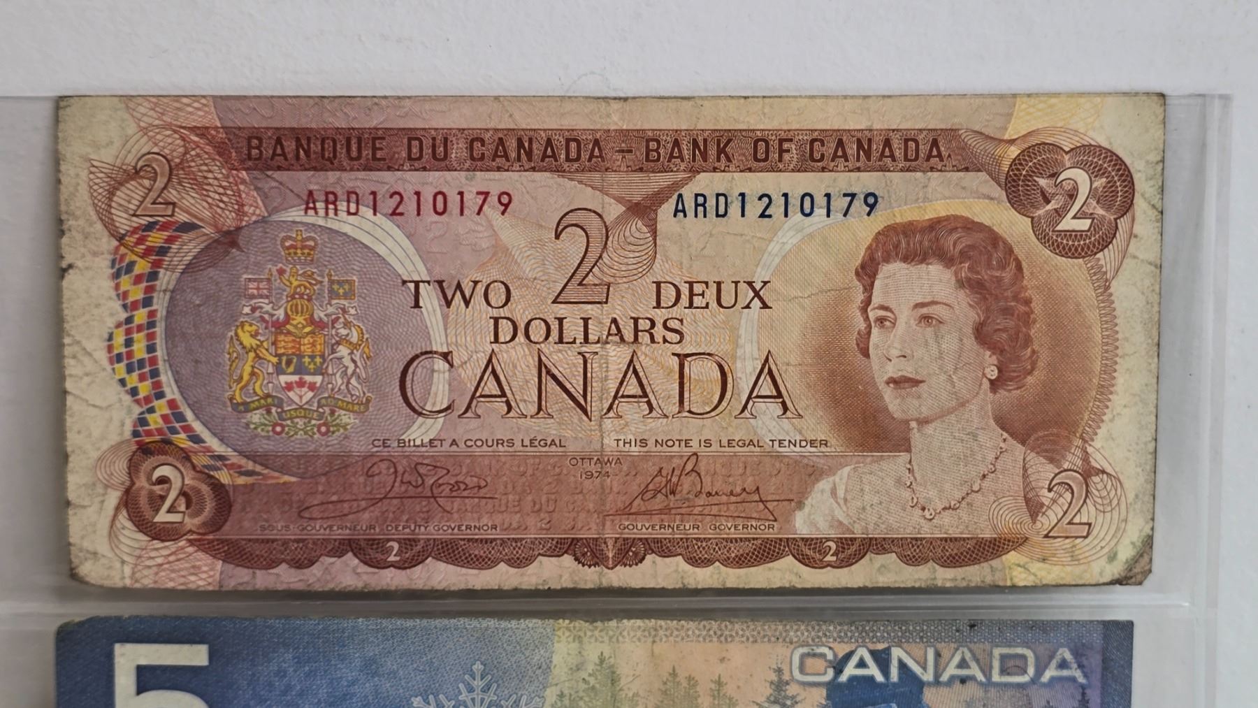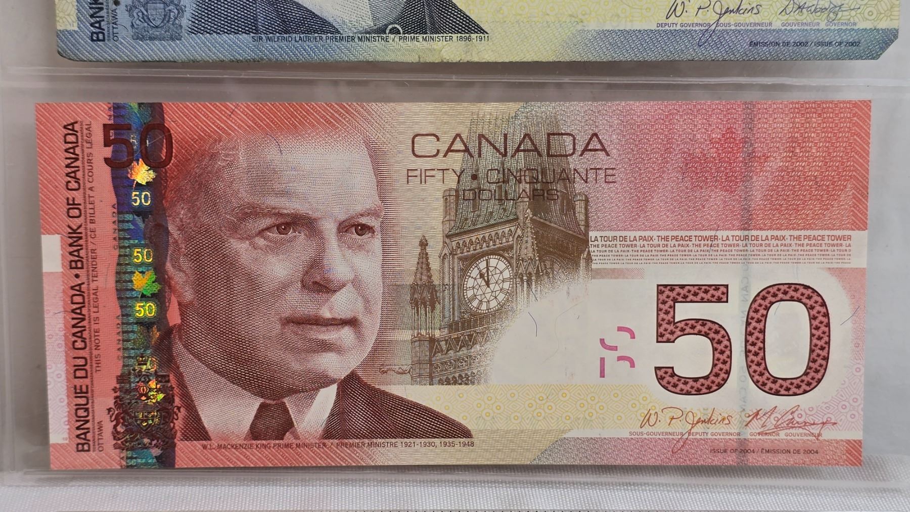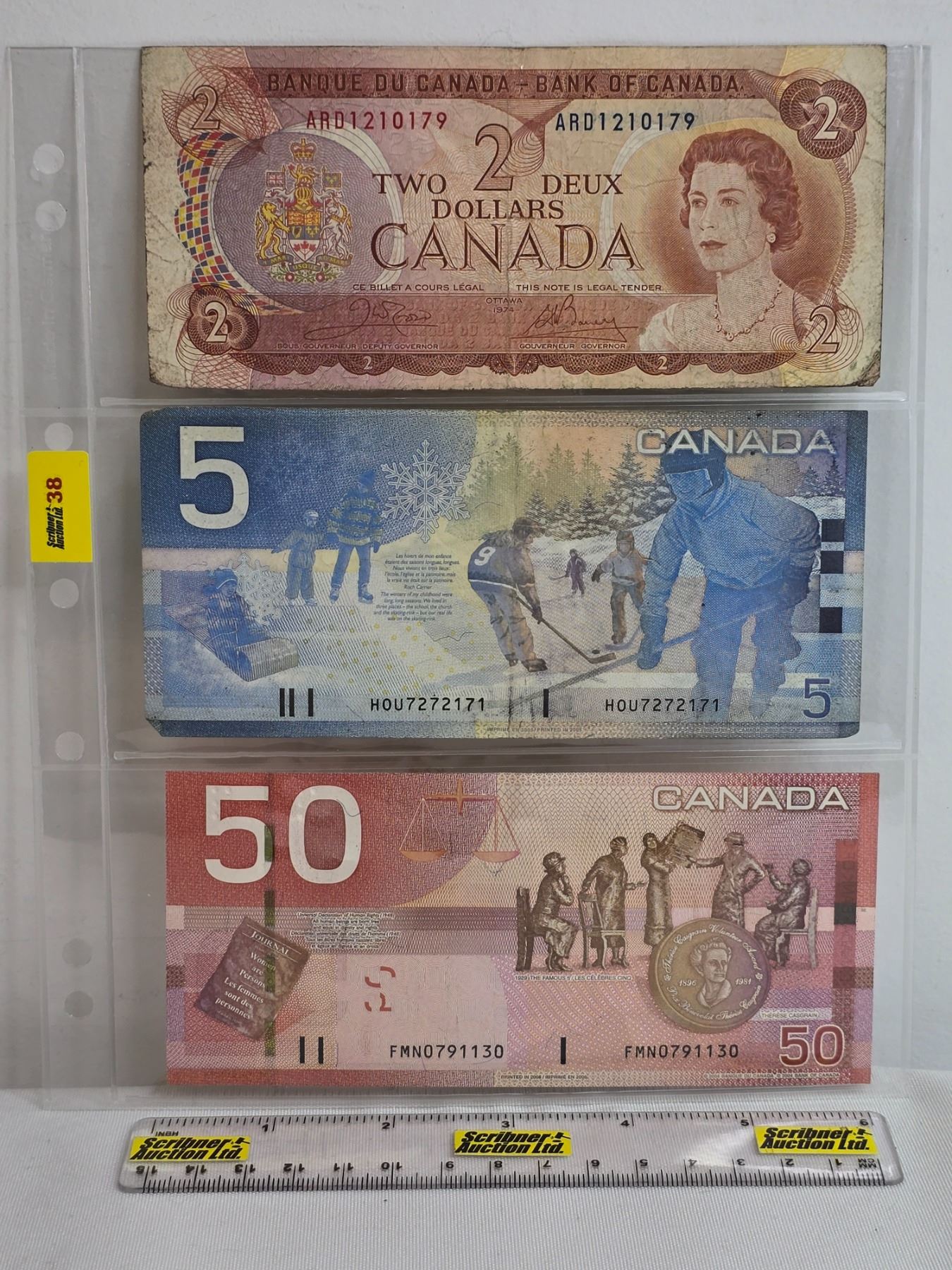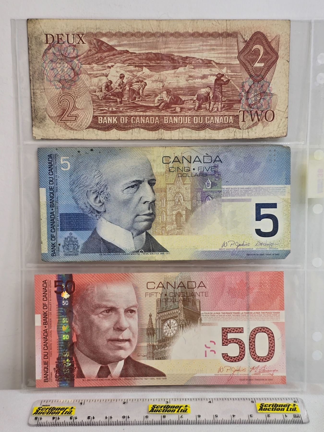 Canada Bills (3): - 1974 $2 : Crow/Bouey #ARD1210179 - 2002 $5 : Jenkins/Dodge #HOU7272171 - 2004 $50 : Jenkins/Carney #FMN0791130 (See Pics for Varieties, Conditions, Serial Numbers, Printing Dates & Signatures) (Listing & Descriptions are a GUIDE ONLY and are subject to changes, errors, additions or deletions. Please use the provided pictures to satisfy yourself to the Condition and/or Grades. Please Read & Understand All Terms & Conditions for this Auction Sale.)