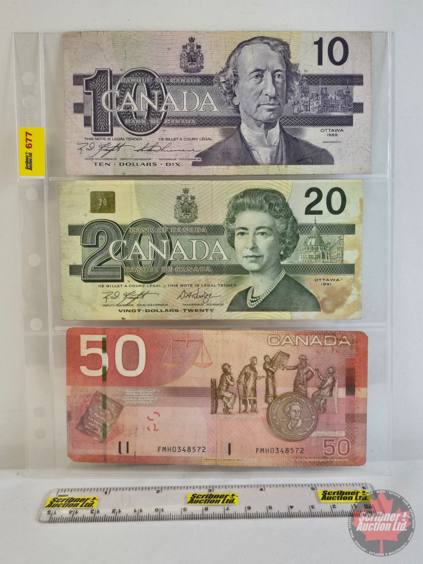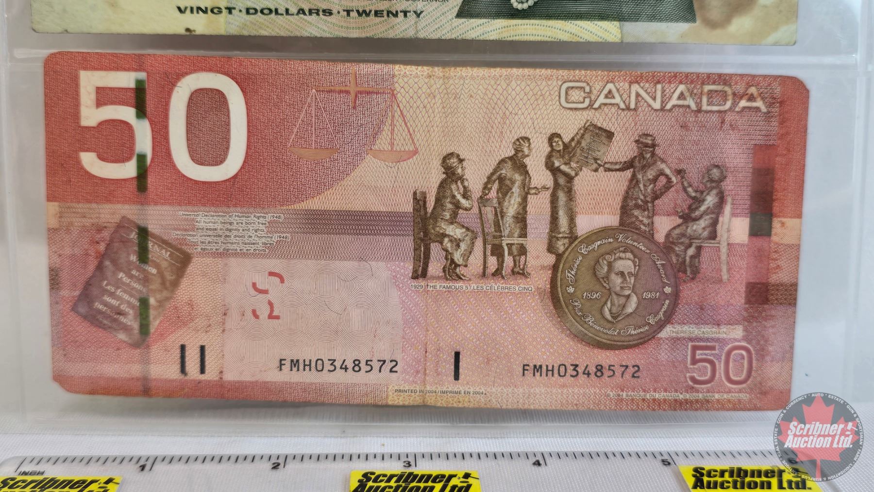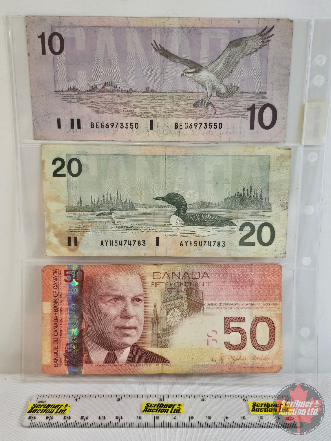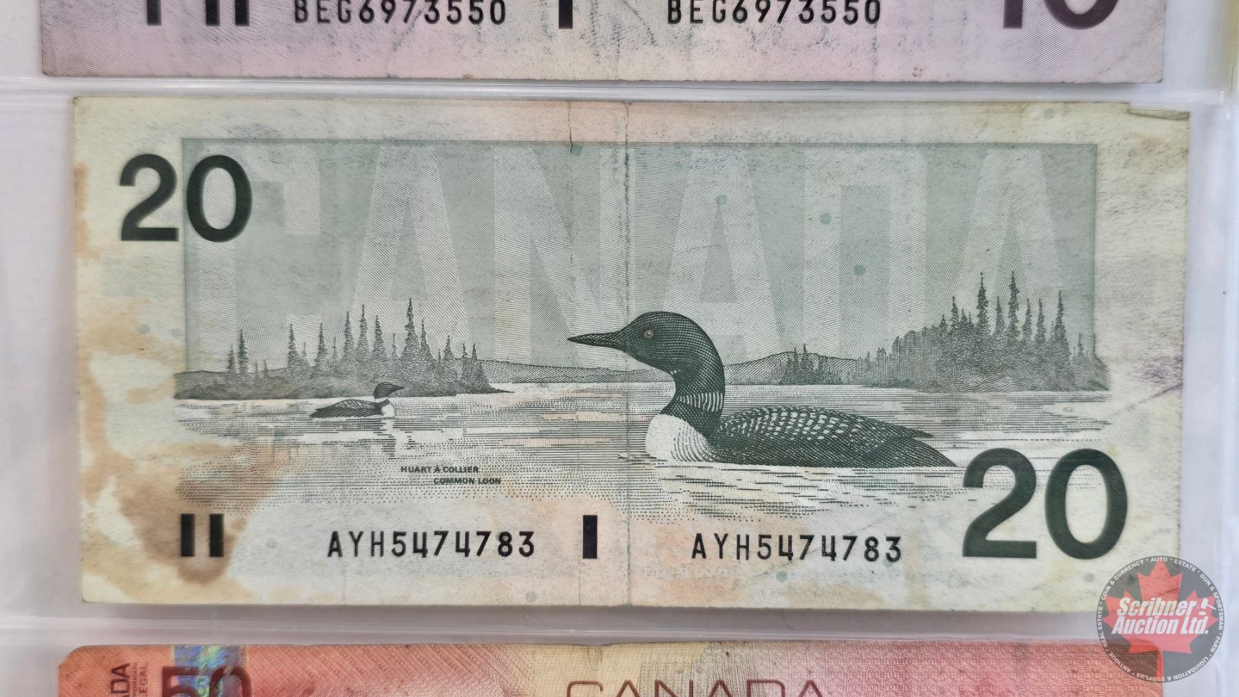 Canada Bills (3): - 1989 $10 : Knight/Thiessen #BEG6973550 - 1991 $20 : Knight/Dodge #AYH5474783 - 2004 $50 : Jenkins/Dodge #FMH0348572 (See Pics for Varieties, Conditions, Serial Numbers, Printing Dates & Signatures) (Listing & Descriptions are a GUIDE ONLY and are subject to changes, errors, additions or deletions. Please use the provided pictures to satisfy yourself to the Condition and/or Grades. Please Read & Understand All Terms & Conditions for this Auction Sale.)