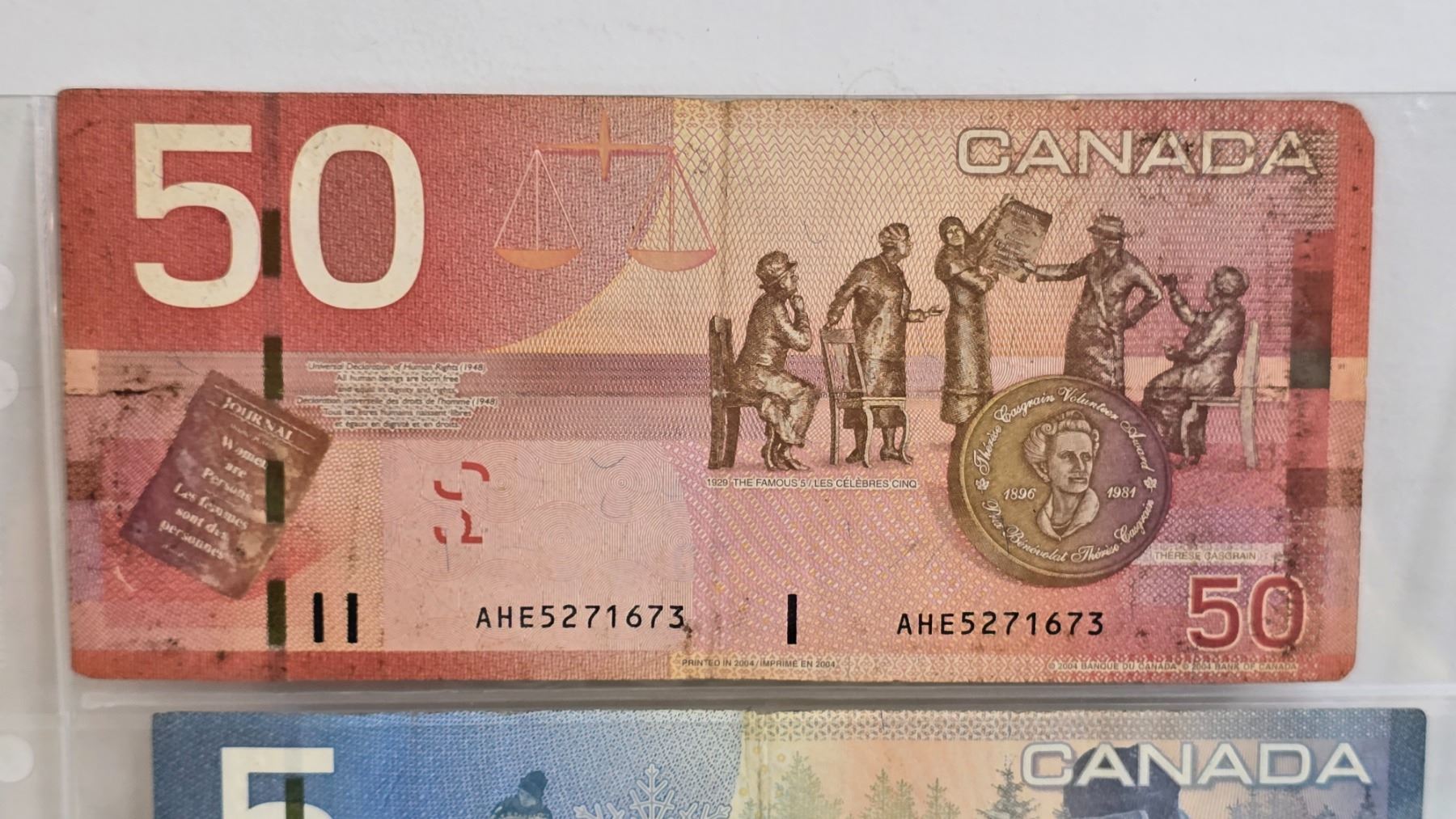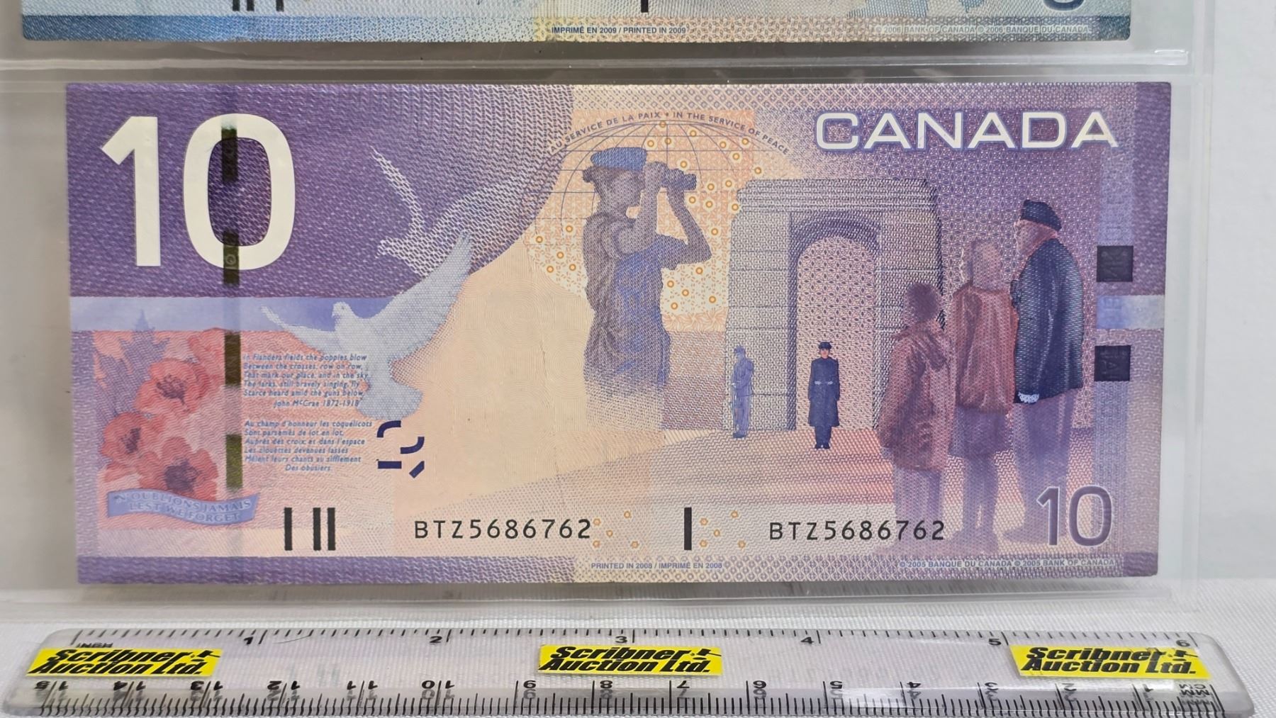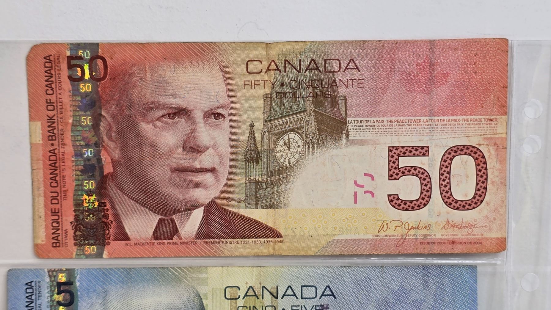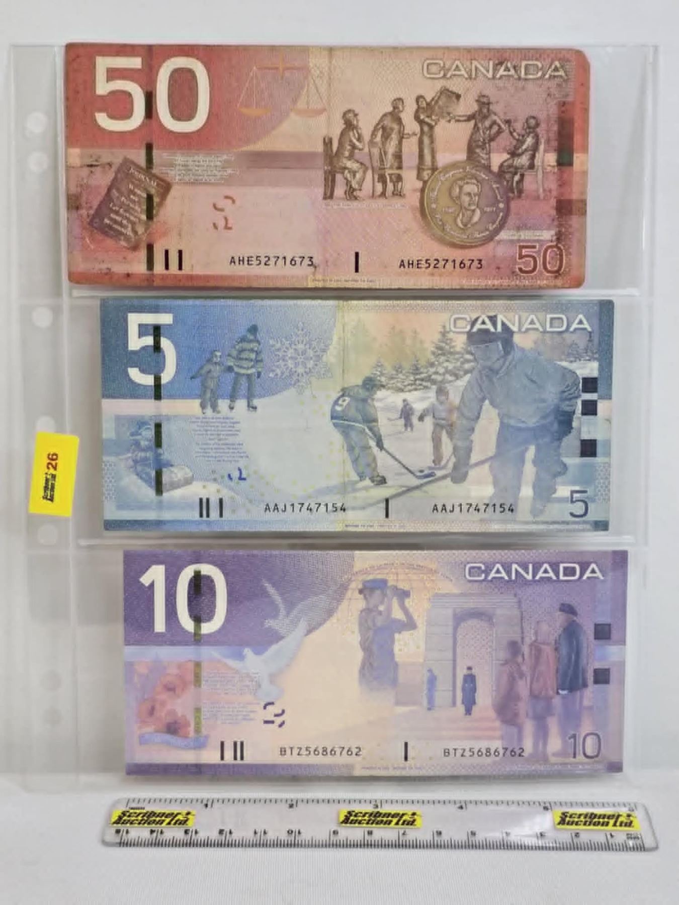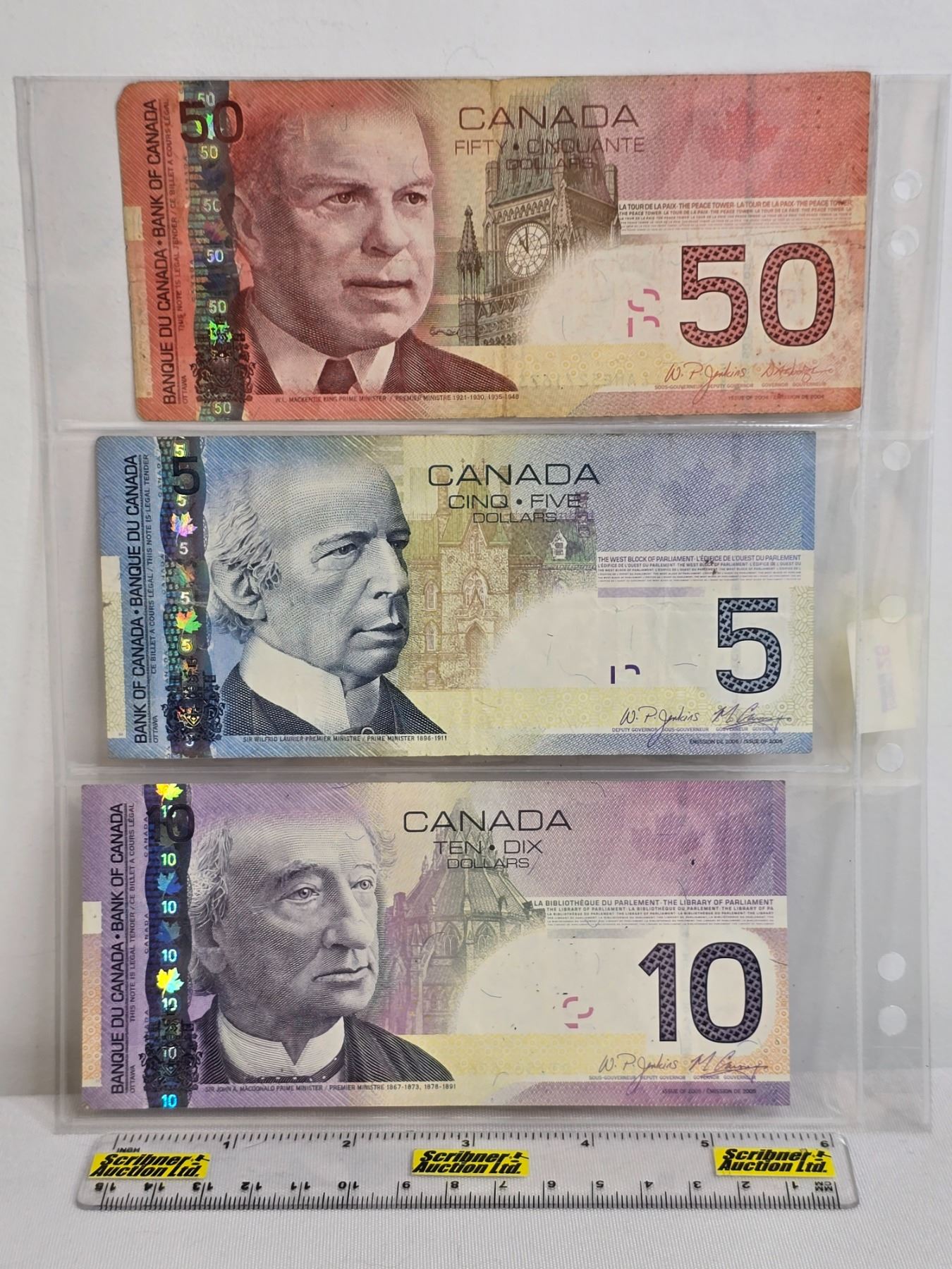 Canada Bills (3): - 2004 $50 : Jenkins/Dodge : #AHE5271673 - 2006 $5 : Jenkins/Carney : #AAJ17447154 - 2005 $10 : Jenkins/Carney: #BTZ5686762 (See Pics for Varieties, Conditions, Serial Numbers, Printing Dates & Signatures) (Listing & Descriptions are a GUIDE ONLY and are subject to changes, errors, additions or deletions. Please use the provided pictures to satisfy yourself to the Condition and/or Grades. Please Read & Understand All Terms & Conditions for this Auction Sale.)