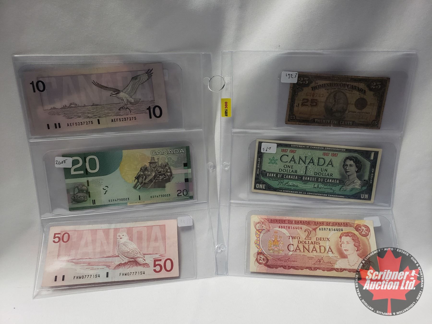 Canada Bills Variety (6): Twenty Five Cent "Shinplaster" 1923 ; $1 Bill 1867-1967 ; $2 Bill 1974 ; $10 Bill 1989 ; $20 Bill 2004 ; $50 Bill 1988 (See Pics for Signatures/Serial Numbers)