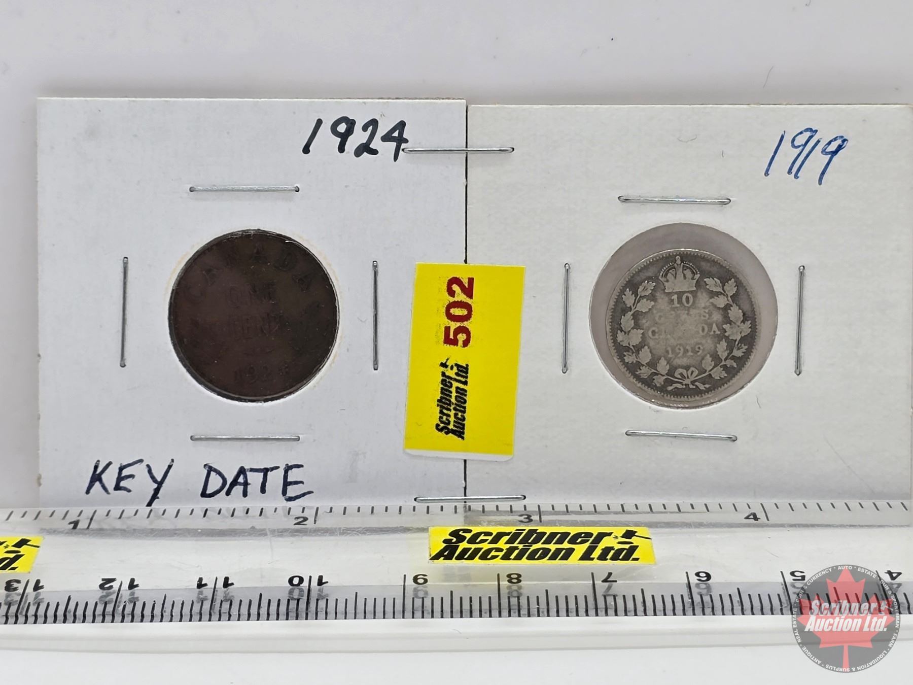 Canada Coins (2): - One Cent 1924 - Ten Cent 1919 (SEE PICS!) (Listing & Descriptions are a GUIDE ONLY and are subject to changes, errors, additions or deletions. Please use the provided pictures to satisfy yourself to the Condition and/or Grades. Please Read & Understand All Terms & Conditions for this Auction Sale.)