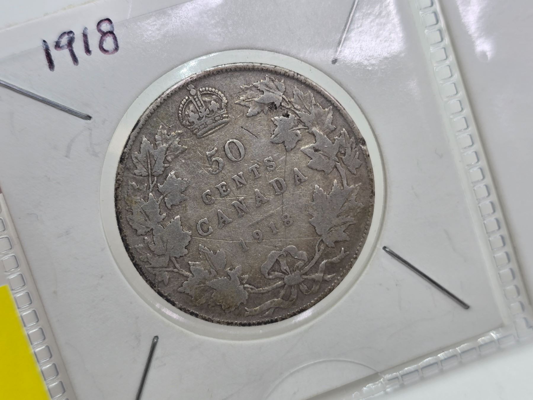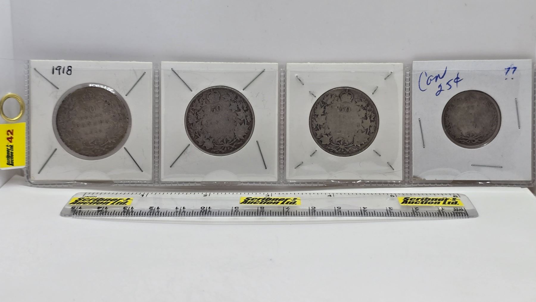 Canada Coins (4): ~ Fifty Cent (3): 1918; 19??; 19?? ~ Twenty Five Cent (1): 19?? (SEE PICS!) (Listing & Descriptions are a GUIDE ONLY and are subject to changes, errors, additions or deletions. Please use the provided pictures to satisfy yourself to the Condition and/or Grades. Please Read & Understand All Terms & Conditions for this Auction Sale.)