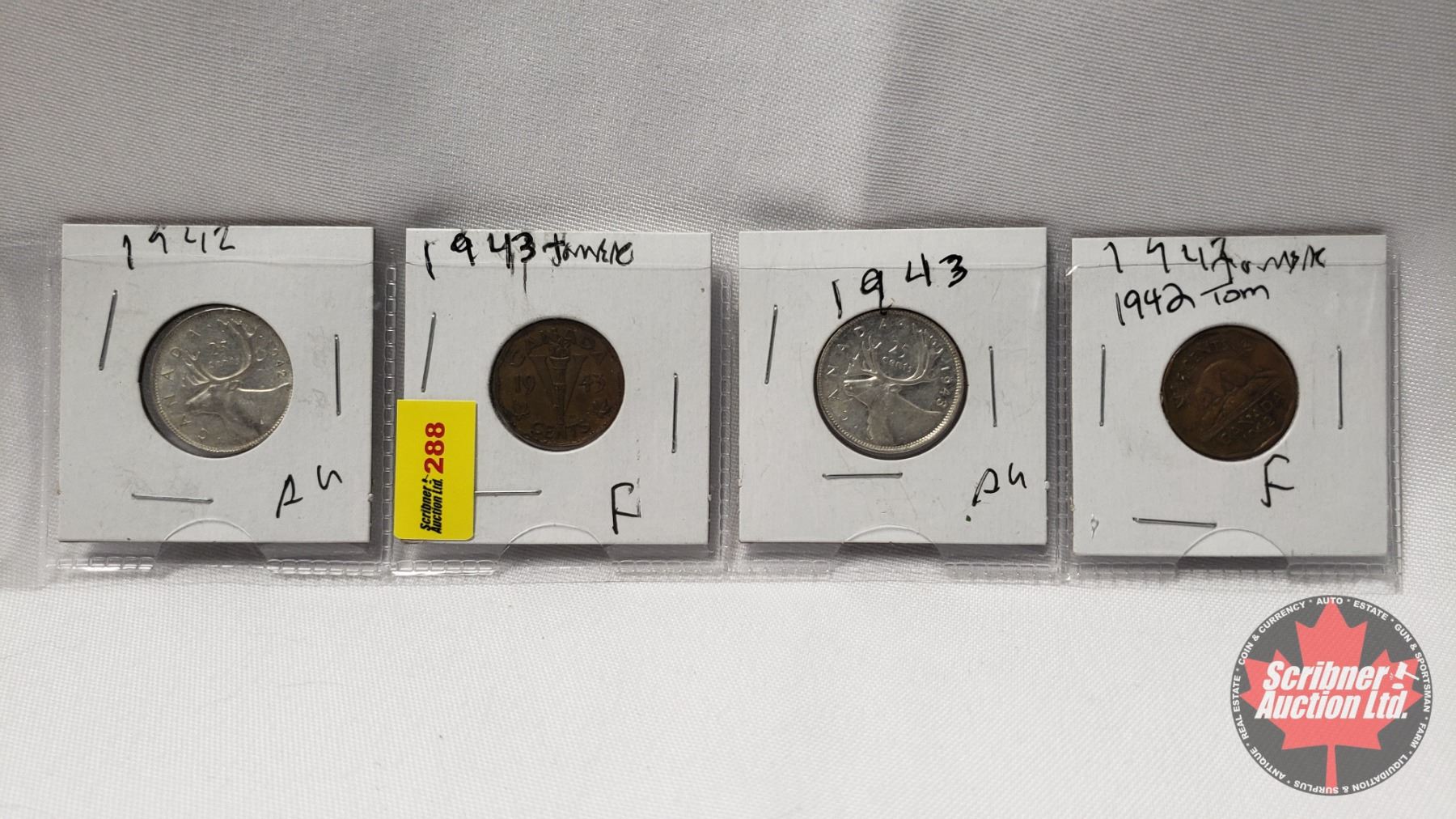 Canada Coins (4): Five Cent 1942Tom; Five Cent 1943Tom; Twenty Five Cent 1942; Twenty Five Cent 1943