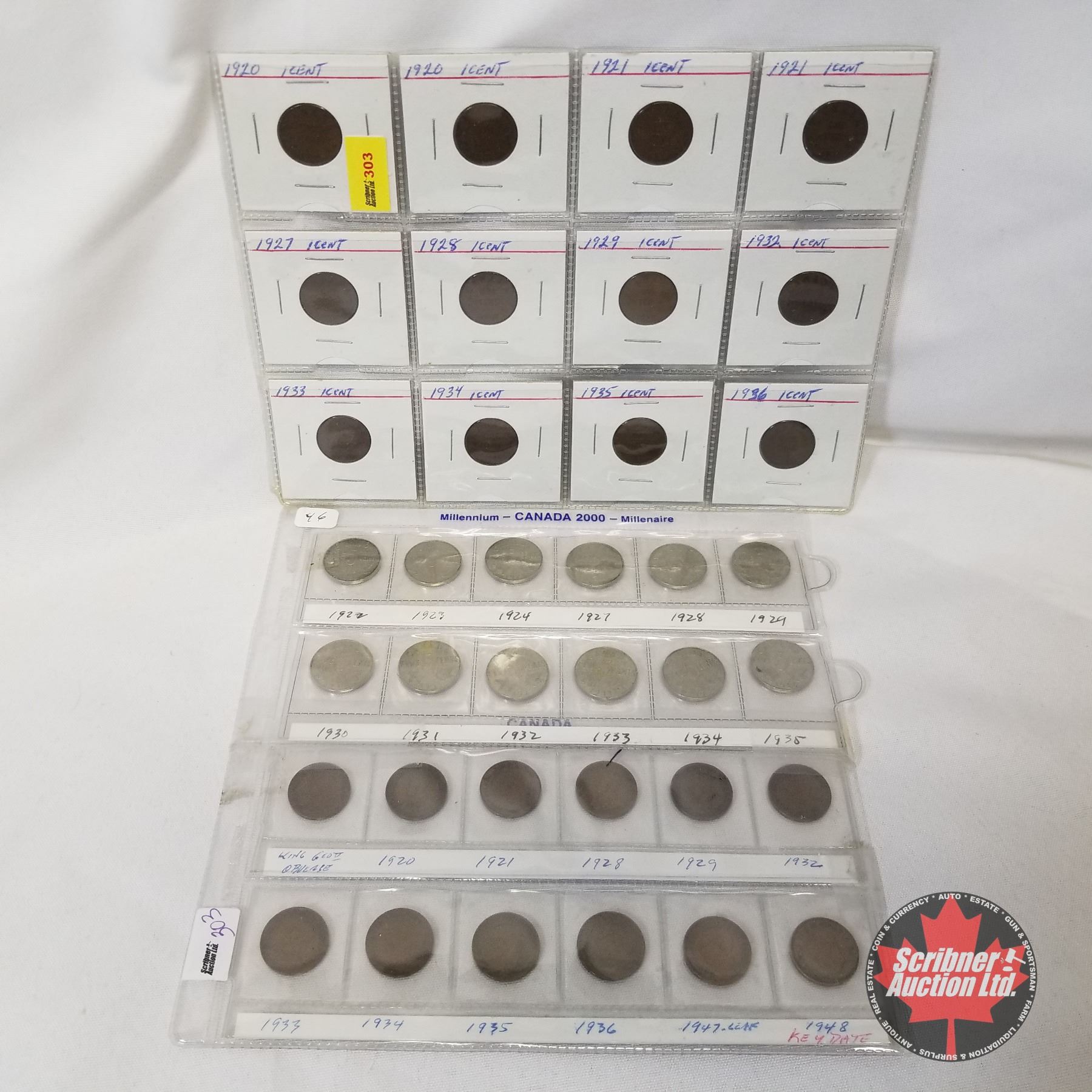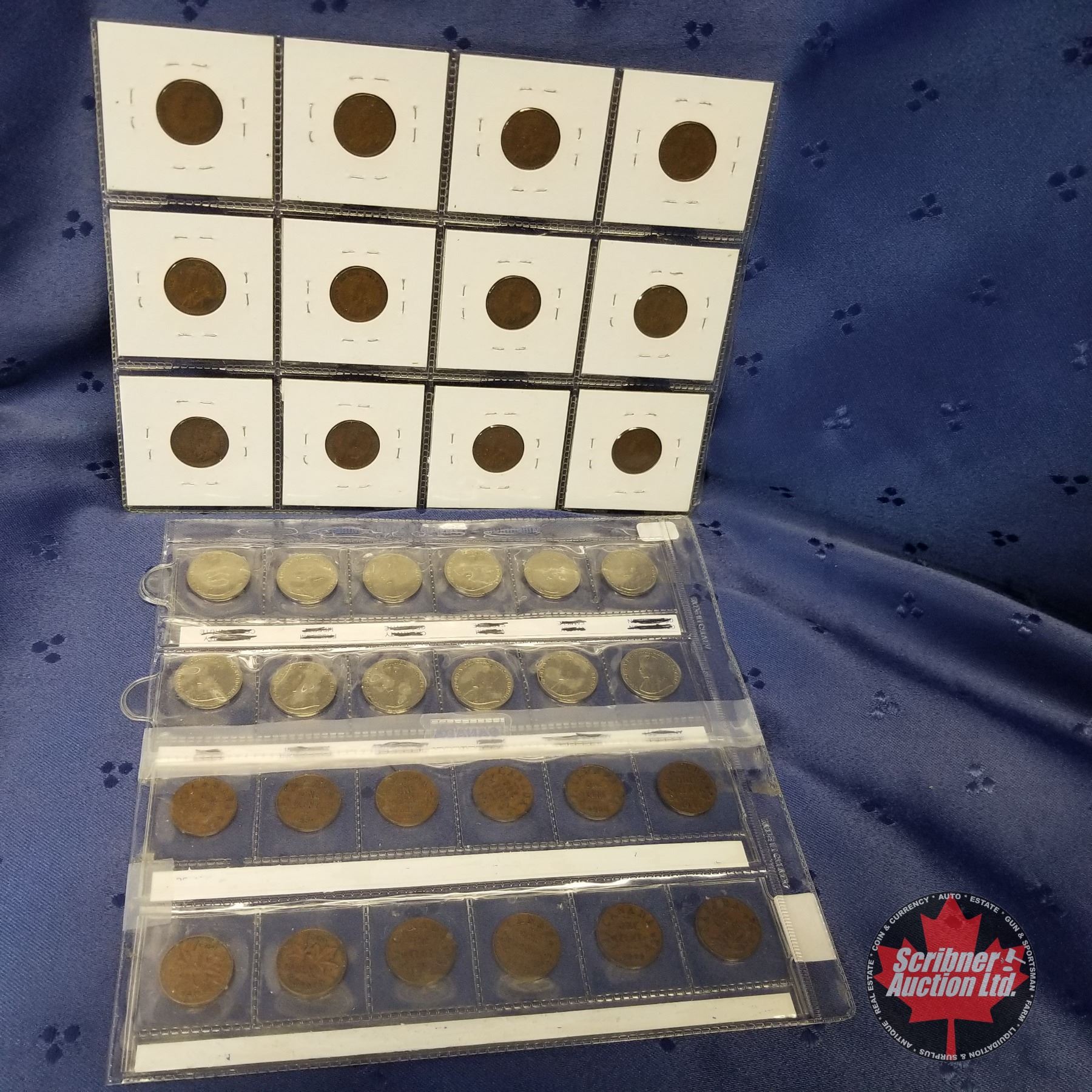 Canada Coins Grouping: (1¢: 1920; 1920; 1921; 1921; 1927; 1928; 1929; 1932; 1933; 1934; 1935; 1936; 1932; 1920; 1928; 1921; 1920; 1932; 1948; 1947ml; 1936; 1935; 1934; 1933) (5¢: 1922; 1923; 1924; 1927; 1928; 1929; 1930; 1931; 1932; 1933; 1934; 1935)