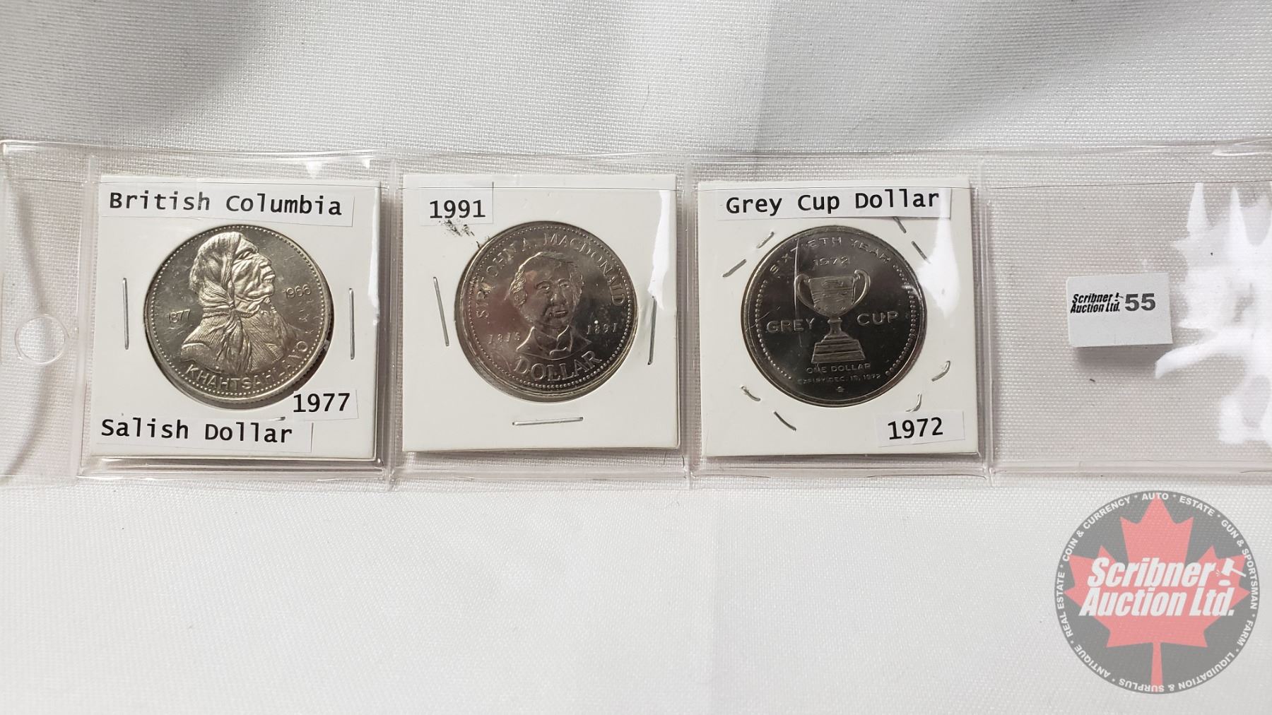Canada Coins/Tokens - Group of 3: British Columbia Salish Dollar 1977; Sir John A MacDonald Dollar 1991 ; Grey Cup One Dollar 1972