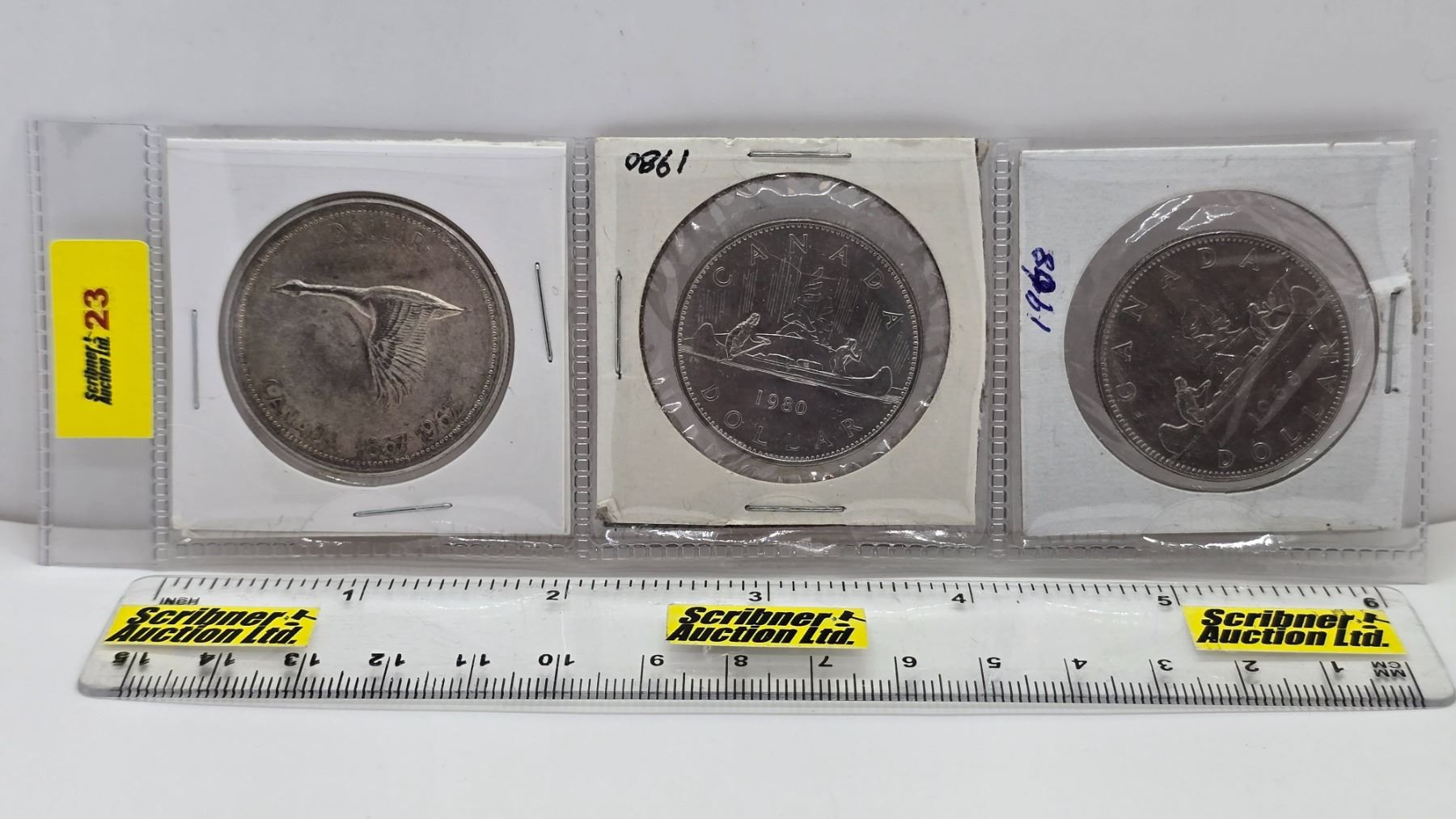 Canada Dollars (3): 1867-1967; 1968; 1980 (SEE PICS!) (Listing & Descriptions are a GUIDE ONLY and are subject to changes, errors, additions or deletions. Please use the provided pictures to satisfy yourself to the Condition and/or Grades. Please Read & Understand All Terms & Conditions for this Auction Sale.)