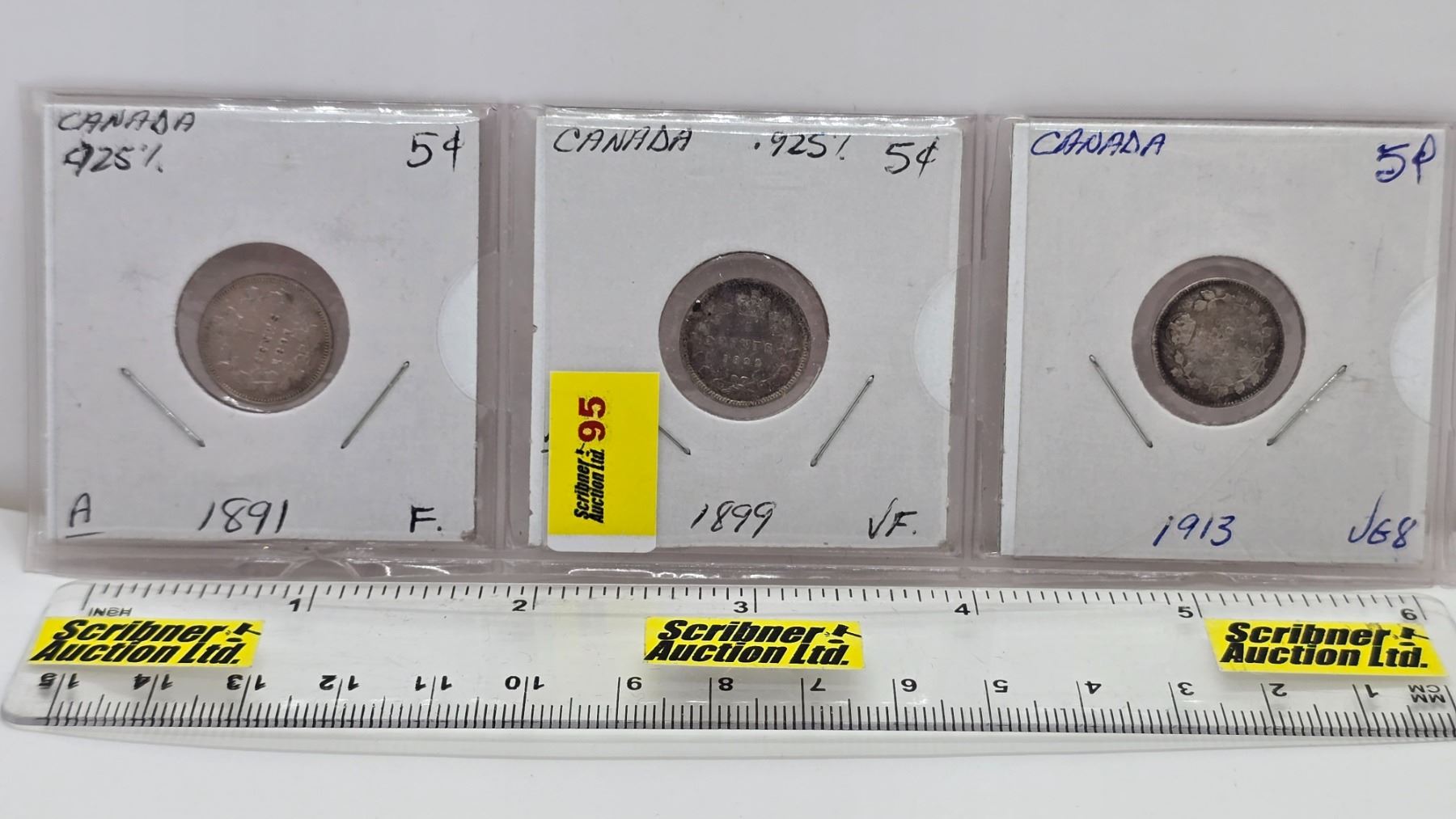 Canada Five Cent (3): 1891; 1899; 1913 (SEE PICS!) (Listing & Descriptions are a GUIDE ONLY and are subject to changes, errors, additions or deletions. Please use the provided pictures to satisfy yourself to the Condition and/or Grades. Please Read & Understand All Terms & Conditions for this Auction Sale.)