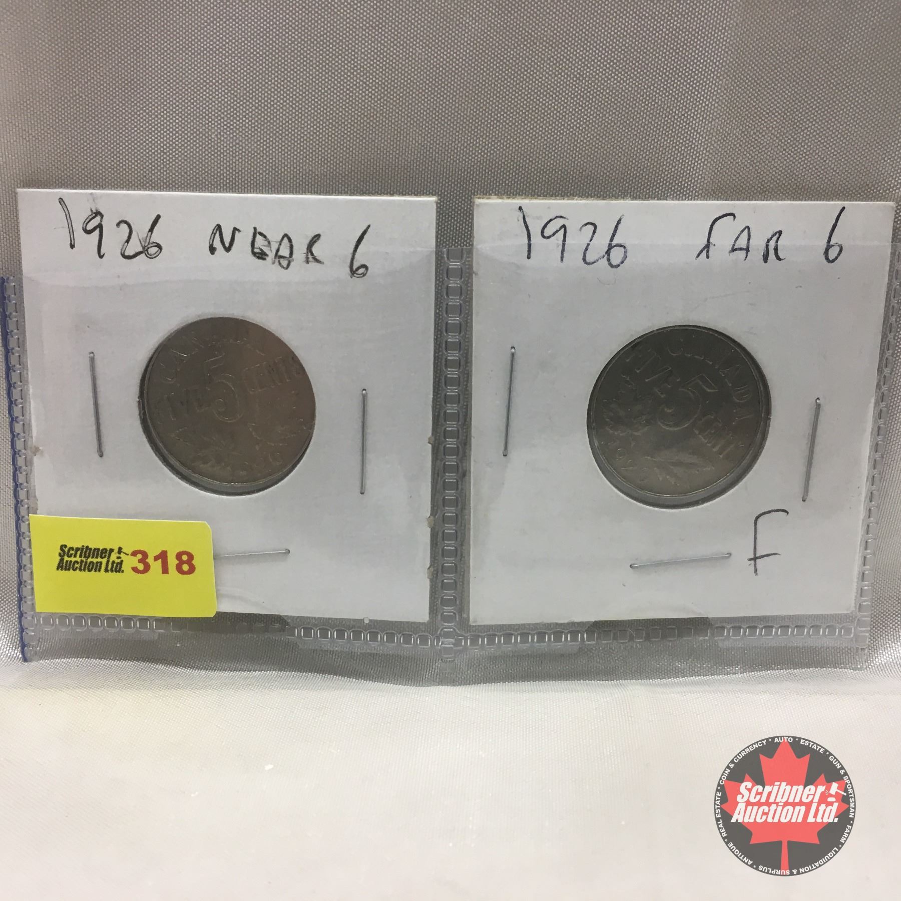 Canada Five Cent - Strip of 2: 1926 Near 6; 1926 Far 6