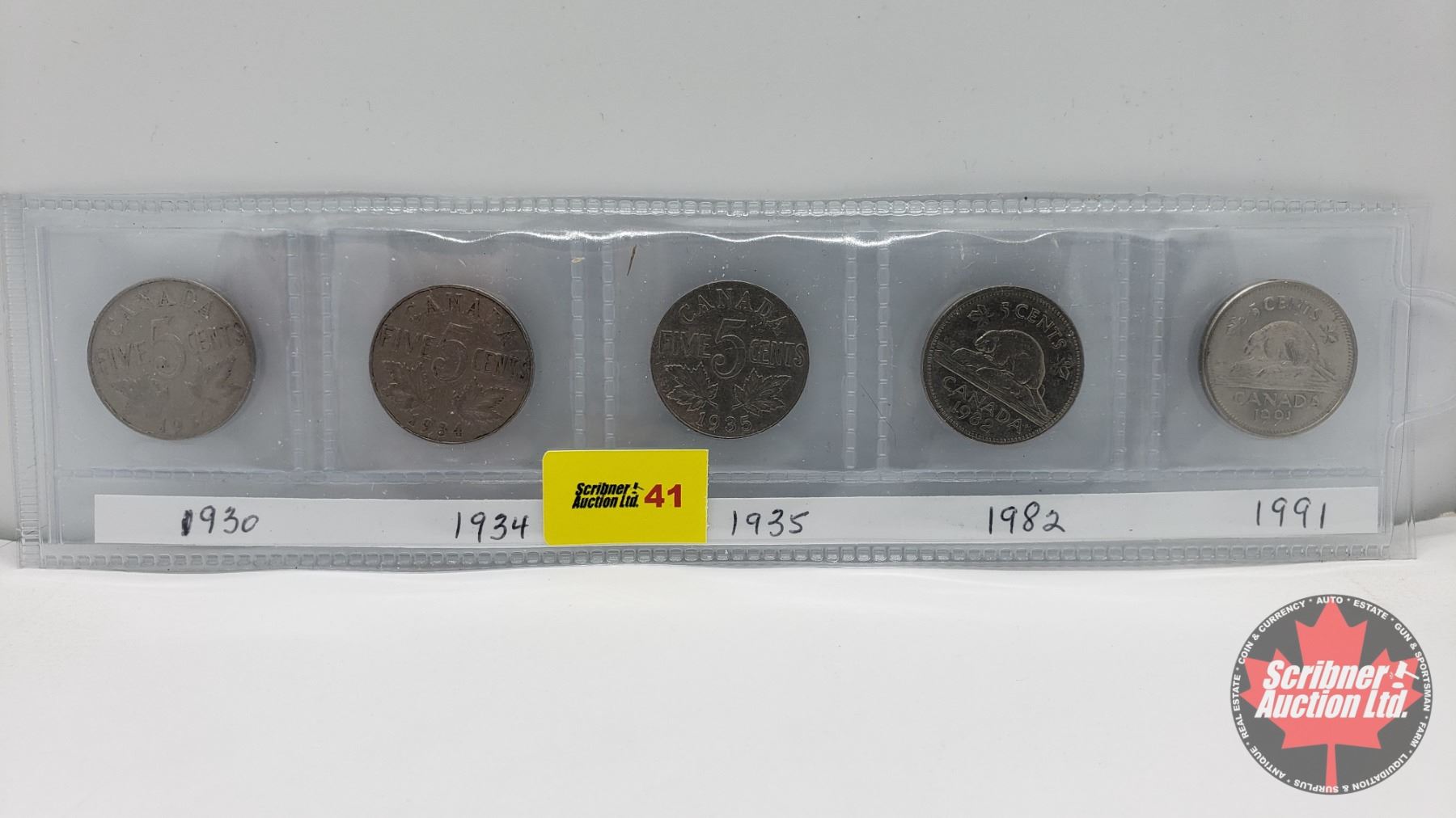 Canada Five Cent - Strip of 5: 1930; 1934; 1935; 1982; 1991