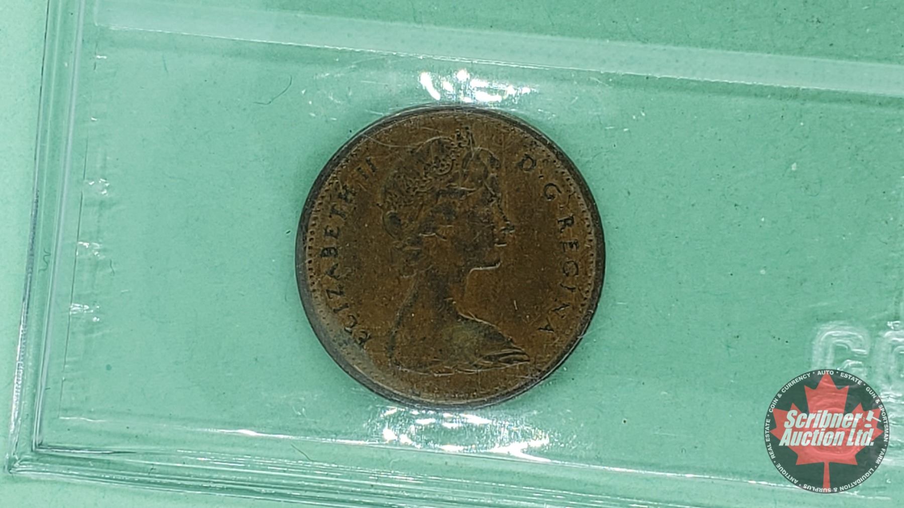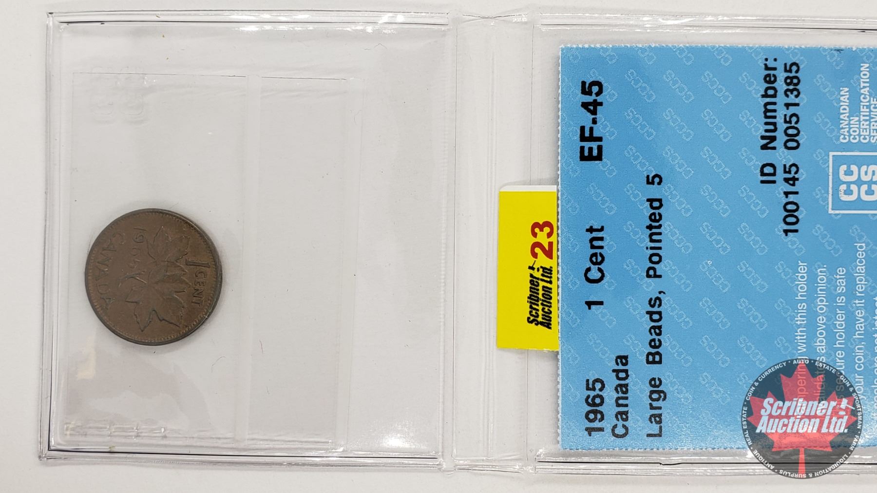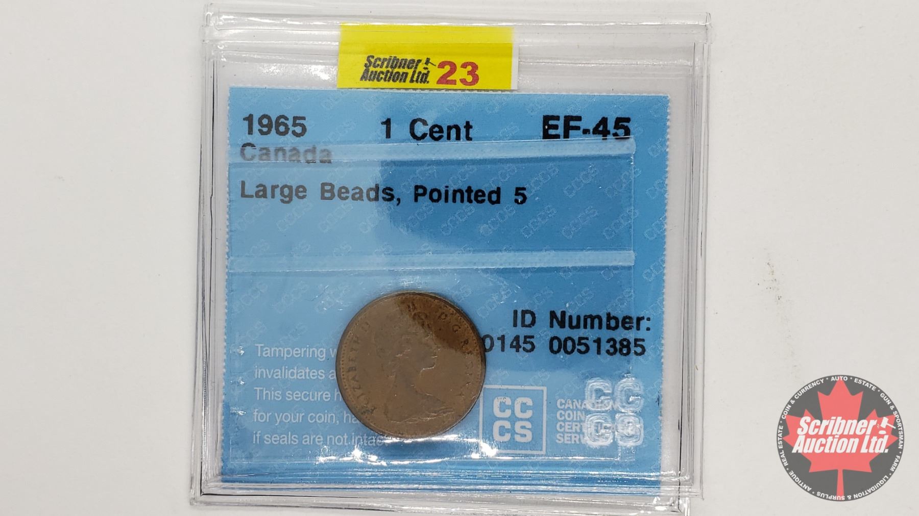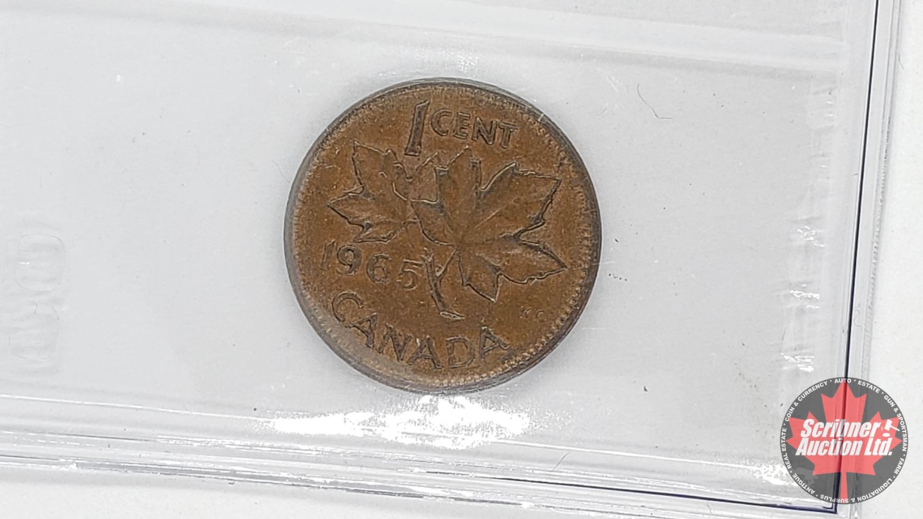 Canada One Cent 1965 "Large Beads, Pointed 5" (CCCS Cert: EF-45)