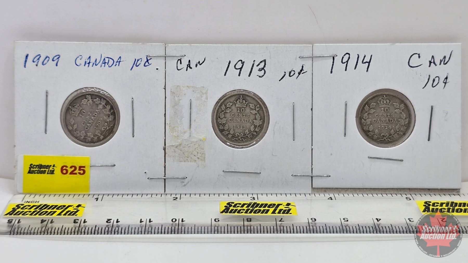Canada Ten Cent (3) : 1909; 1913; 1914 (SEE PICS!) (Listing & Descriptions are a GUIDE ONLY and are subject to changes, errors, additions or deletions. Please use the provided pictures to satisfy yourself to the Condition and/or Grades. Please Read & Understand All Terms & Conditions for this Auction Sale.)