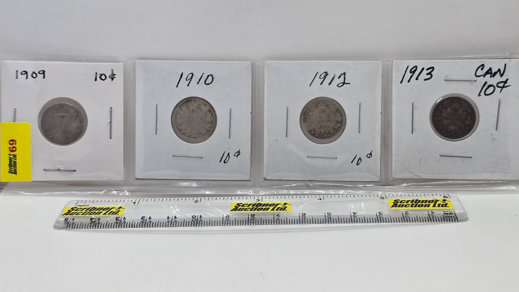 Canada Ten Cent (4): 1909; 1910; 1912; 1913 (SEE PICS!) (Listing & Descriptions are a GUIDE ONLY and are subject to changes, errors, additions or deletions. Please use the provided pictures to satisfy yourself to the Condition and/or Grades. Please Read & Understand All Terms & Conditions for this Auction Sale.)