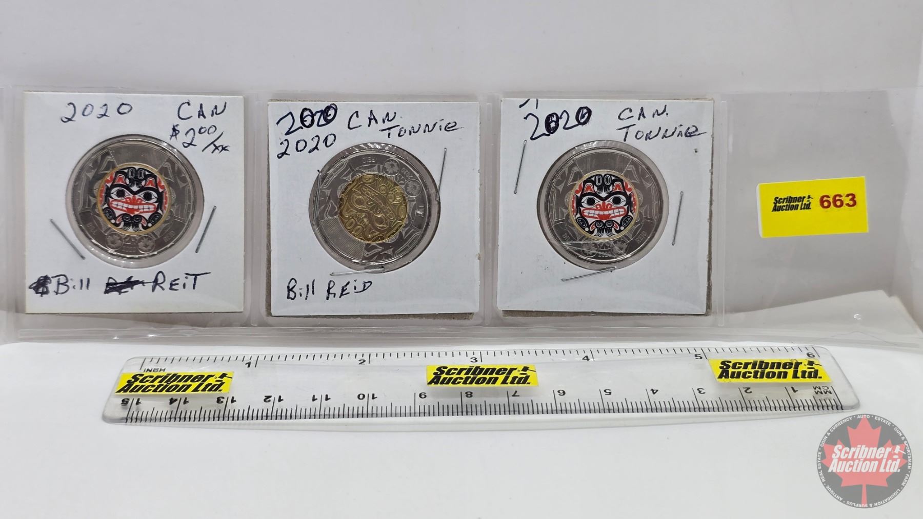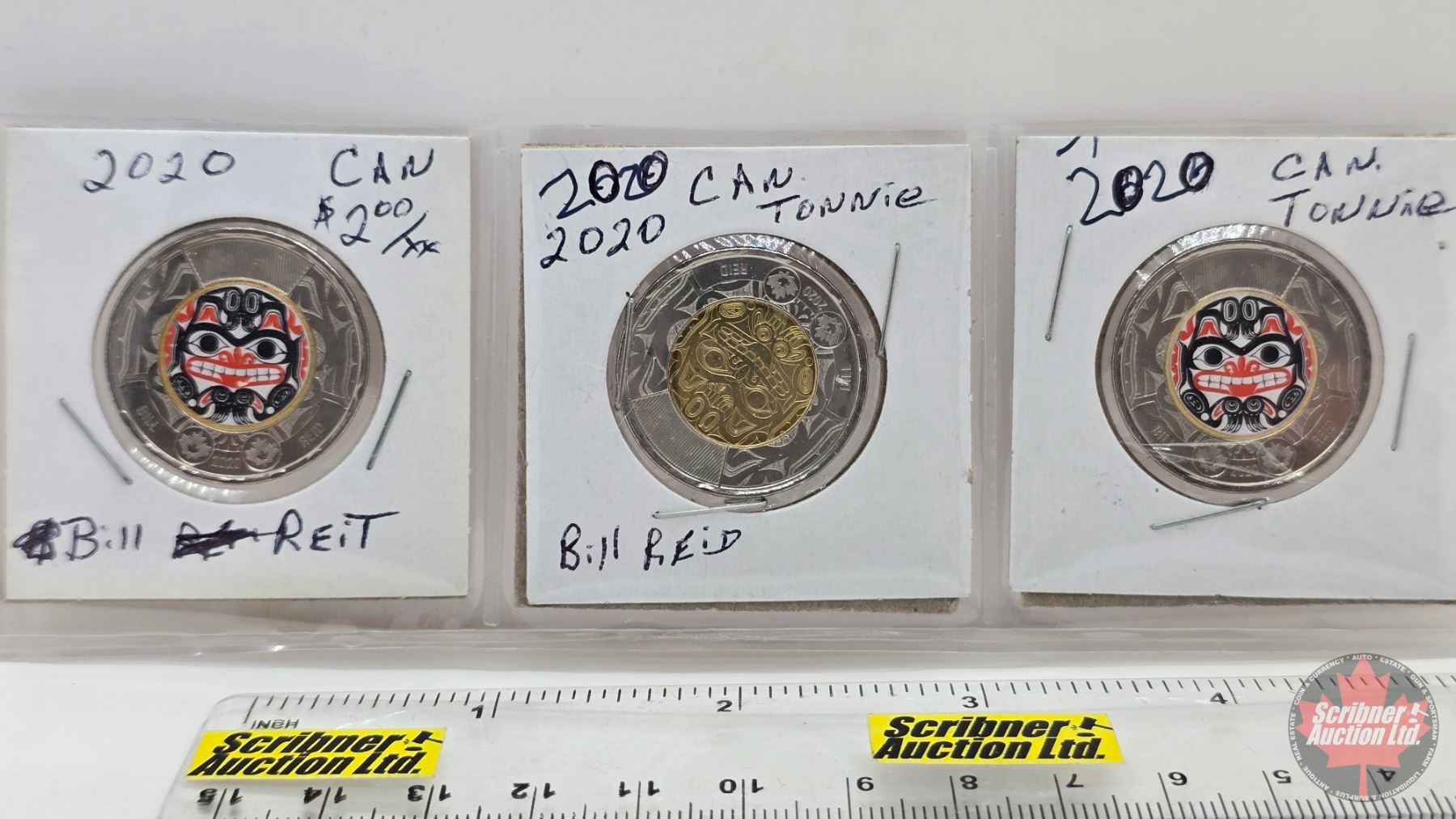 Canada Toonies (3): 2020 Bill Reid ~ Colorized (2); 2020 Bill Reid ~ Non-Colorized (SEE PICS!) (Listing & Descriptions are a GUIDE ONLY and are subject to changes, errors, additions or deletions. Please use the provided pictures to satisfy yourself to the Condition and/or Grades. Please Read & Understand All Terms & Conditions for this Auction Sale.)