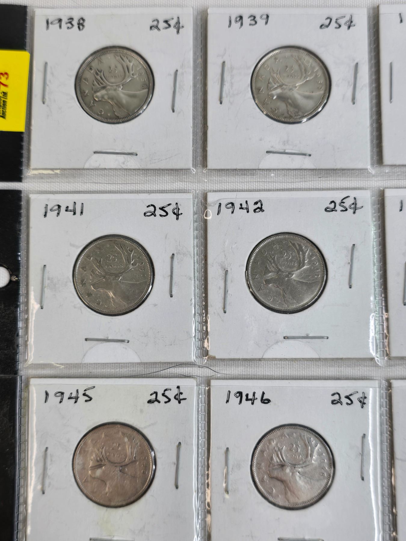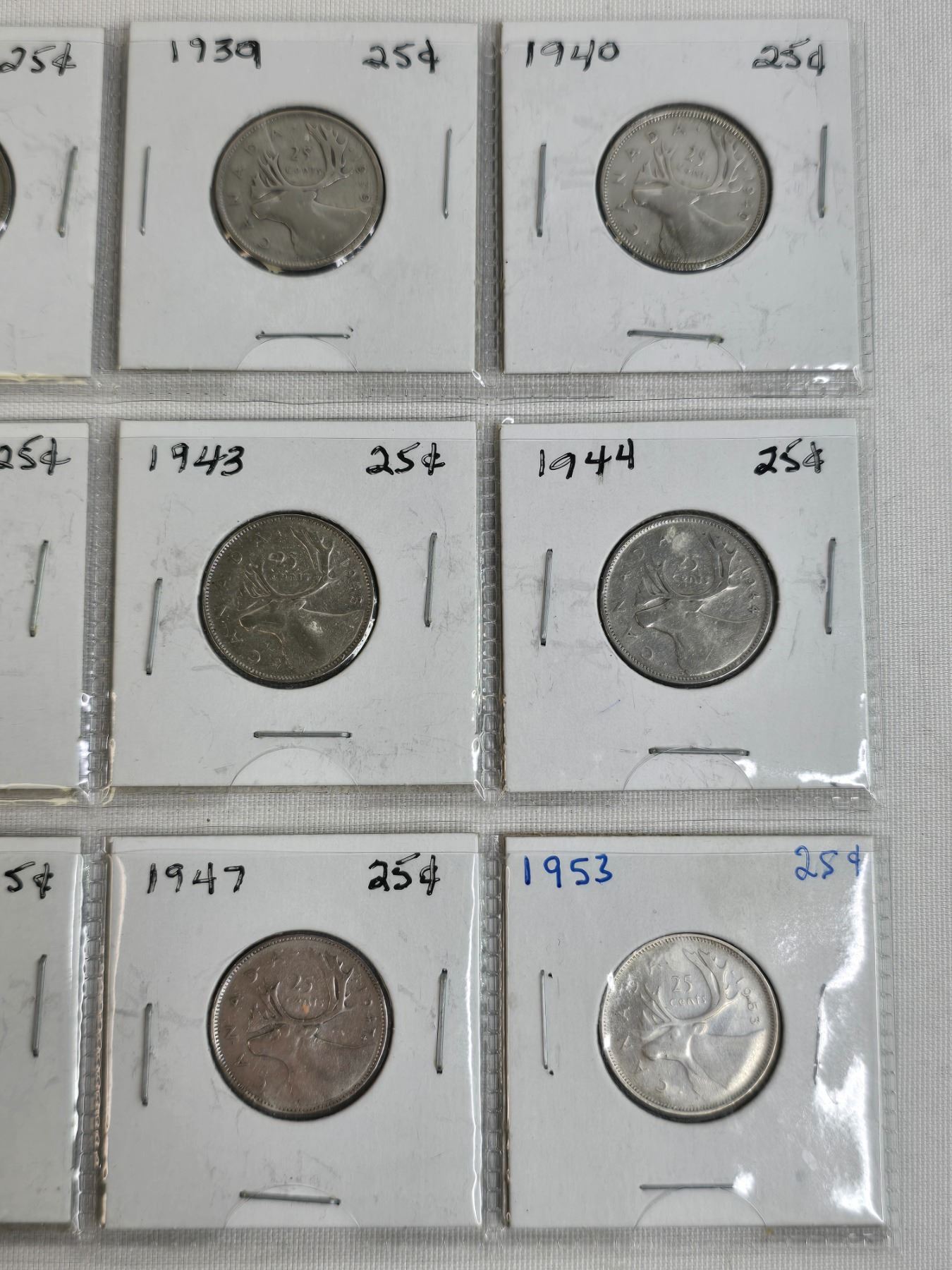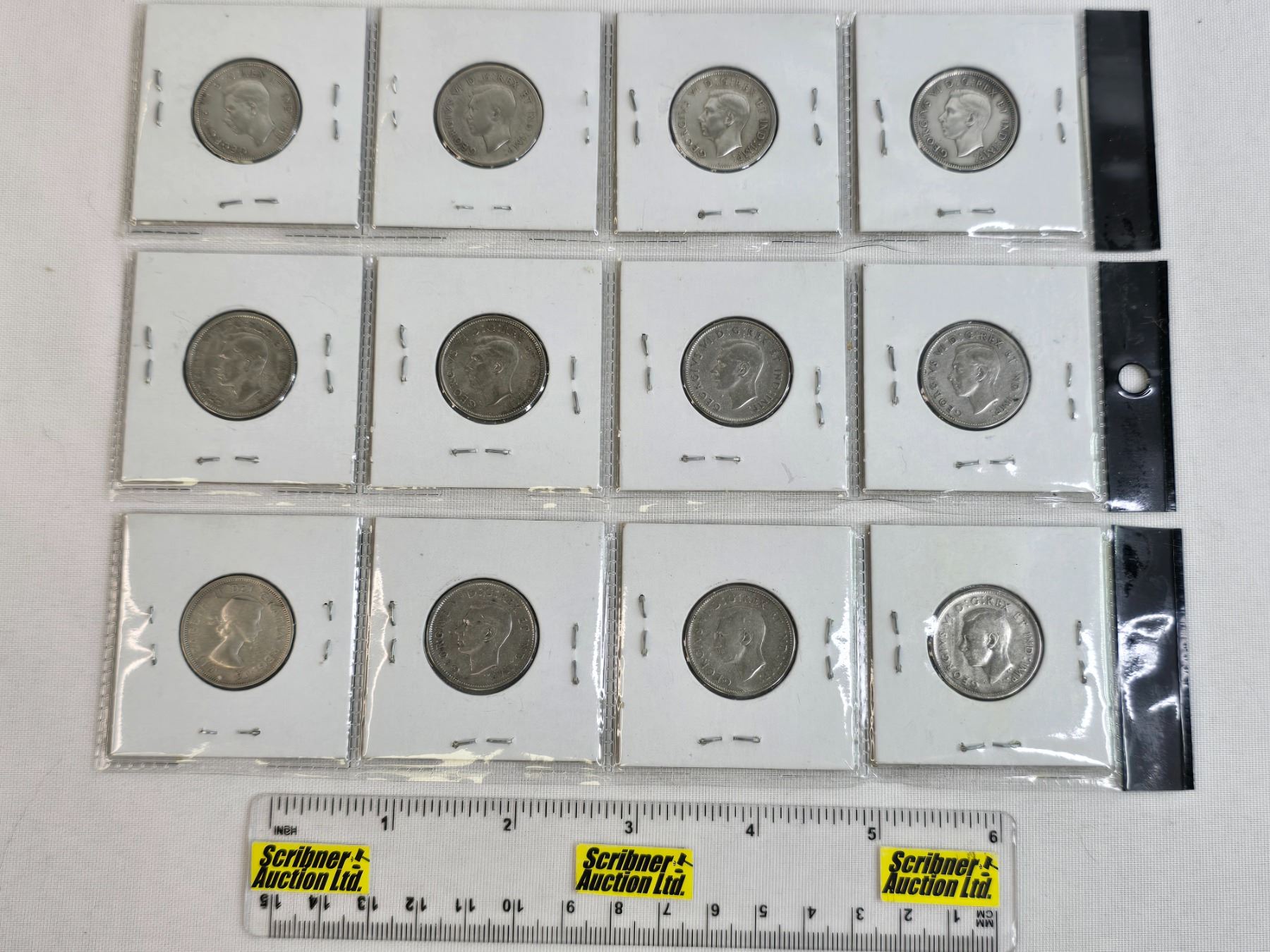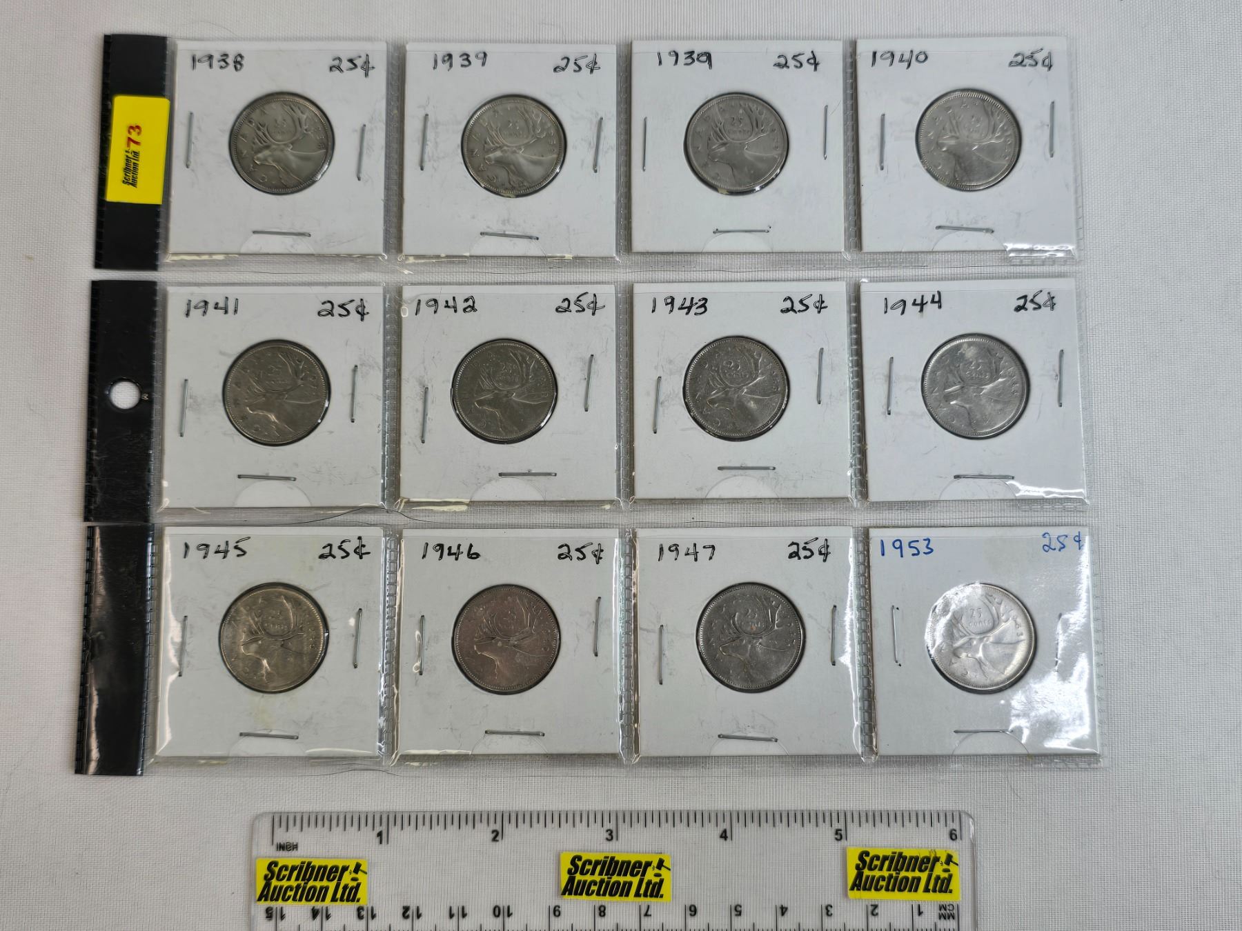 Canada Twenty Five Cent (12): 1938; 1939; 1939; 1940; 1941; 1942; 1943; 1944; 1945; 1946; 1947ML; 1953 (SEE PICS!) (Listing & Descriptions are a GUIDE ONLY and are subject to changes, errors, additions or deletions. Please use the provided pictures to satisfy yourself to the Condition and/or Grades. Please Read & Understand All Terms & Conditions for this Auction Sale.)