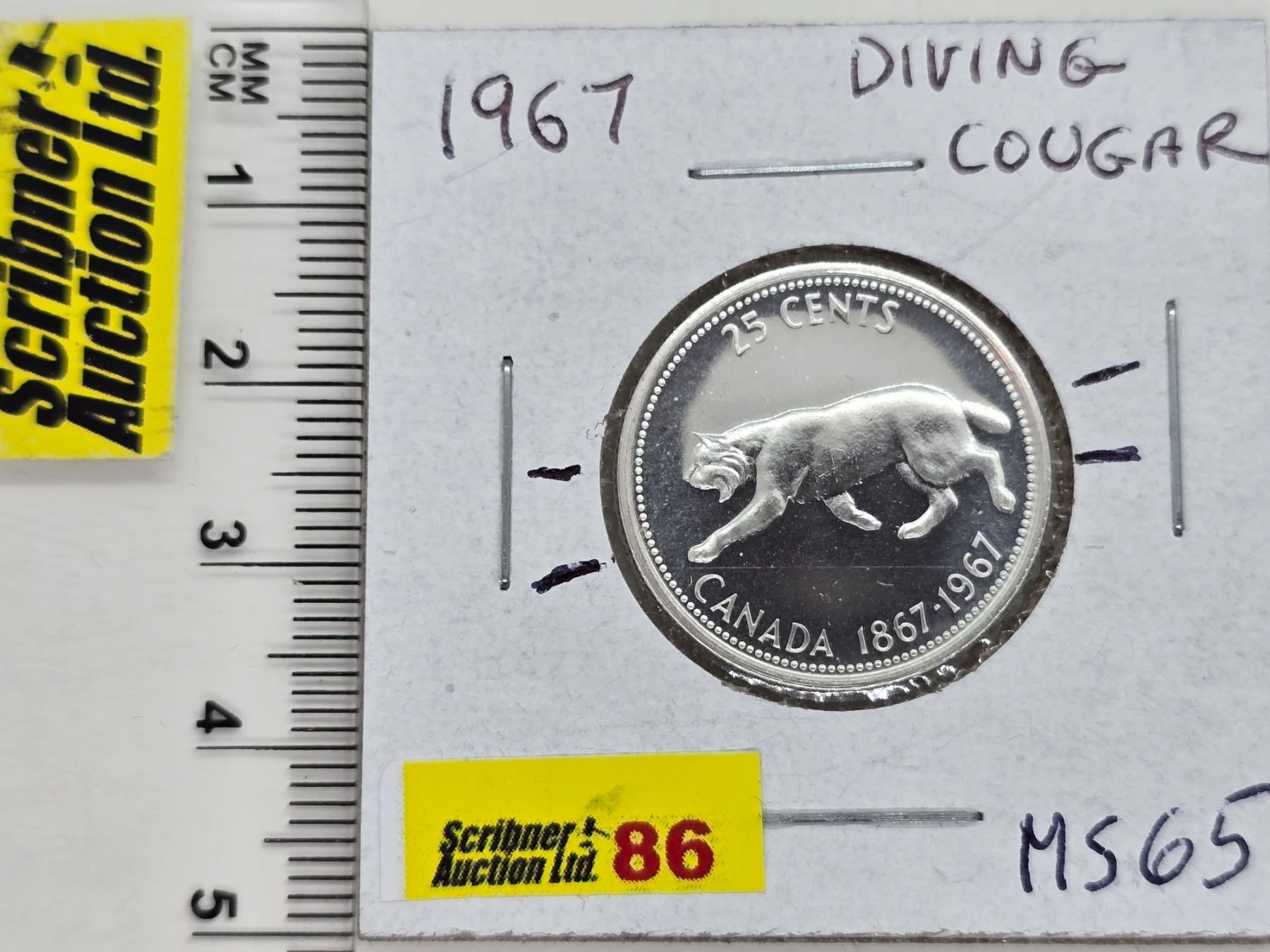 Canada Twenty Five Cent : 1867-1967 "DIVING COUGAR" (SEE PICS!) (Listing & Descriptions are a GUIDE ONLY and are subject to changes, errors, additions or deletions. Please use the provided pictures to satisfy yourself to the Condition and/or Grades. Please Read & Understand All Terms & Conditions for this Auction Sale.)