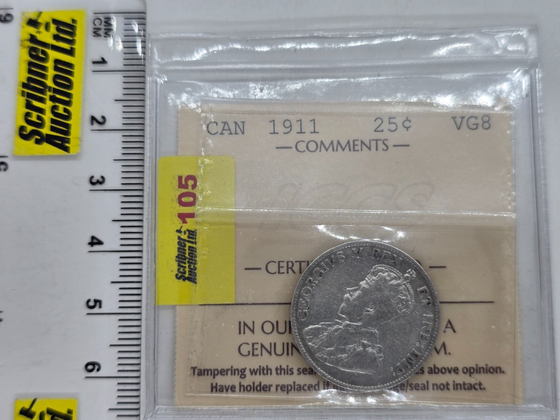Canada Twenty Five Cent 1911 (ICCS Cert: VG8) (SEE PICS!) (Listing & Descriptions are a GUIDE ONLY and are subject to changes, errors, additions or deletions. Please use the provided pictures to satisfy yourself to the Condition and/or Grades. Please Read & Understand All Terms & Conditions for this Auction Sale.)