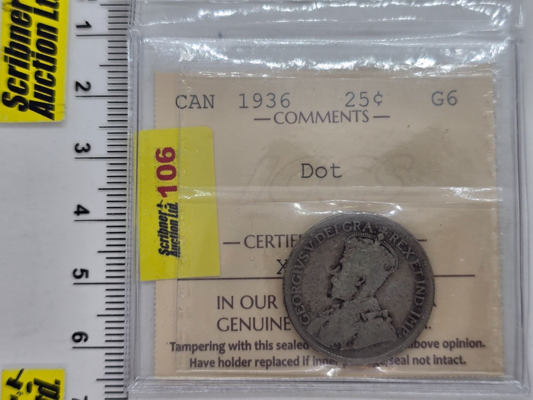 Canada Twenty Five Cent 1936 Dot (ICCS Cert: G6) (SEE PICS!) (Listing & Descriptions are a GUIDE ONLY and are subject to changes, errors, additions or deletions. Please use the provided pictures to satisfy yourself to the Condition and/or Grades. Please Read & Understand All Terms & Conditions for this Auction Sale.)