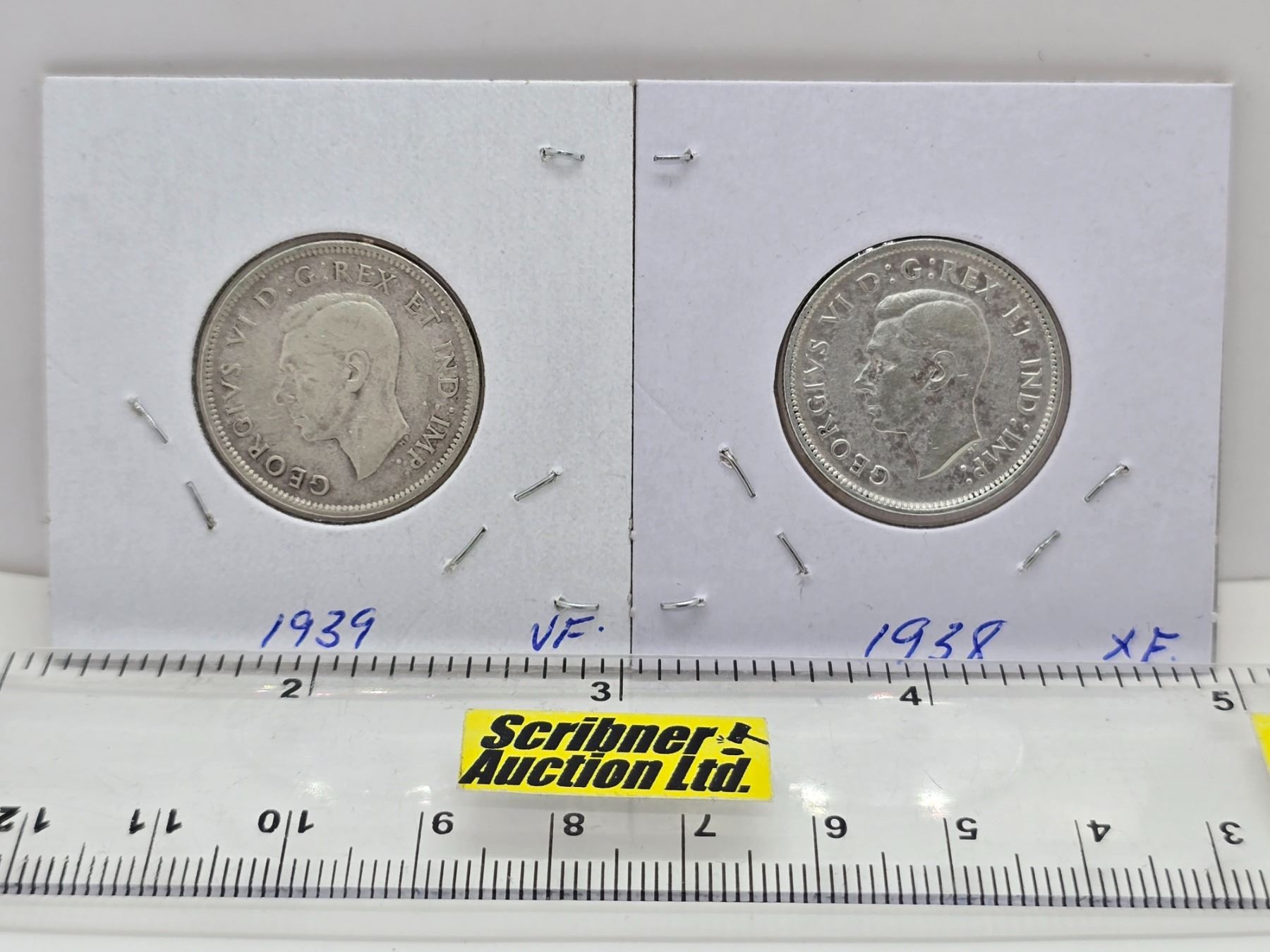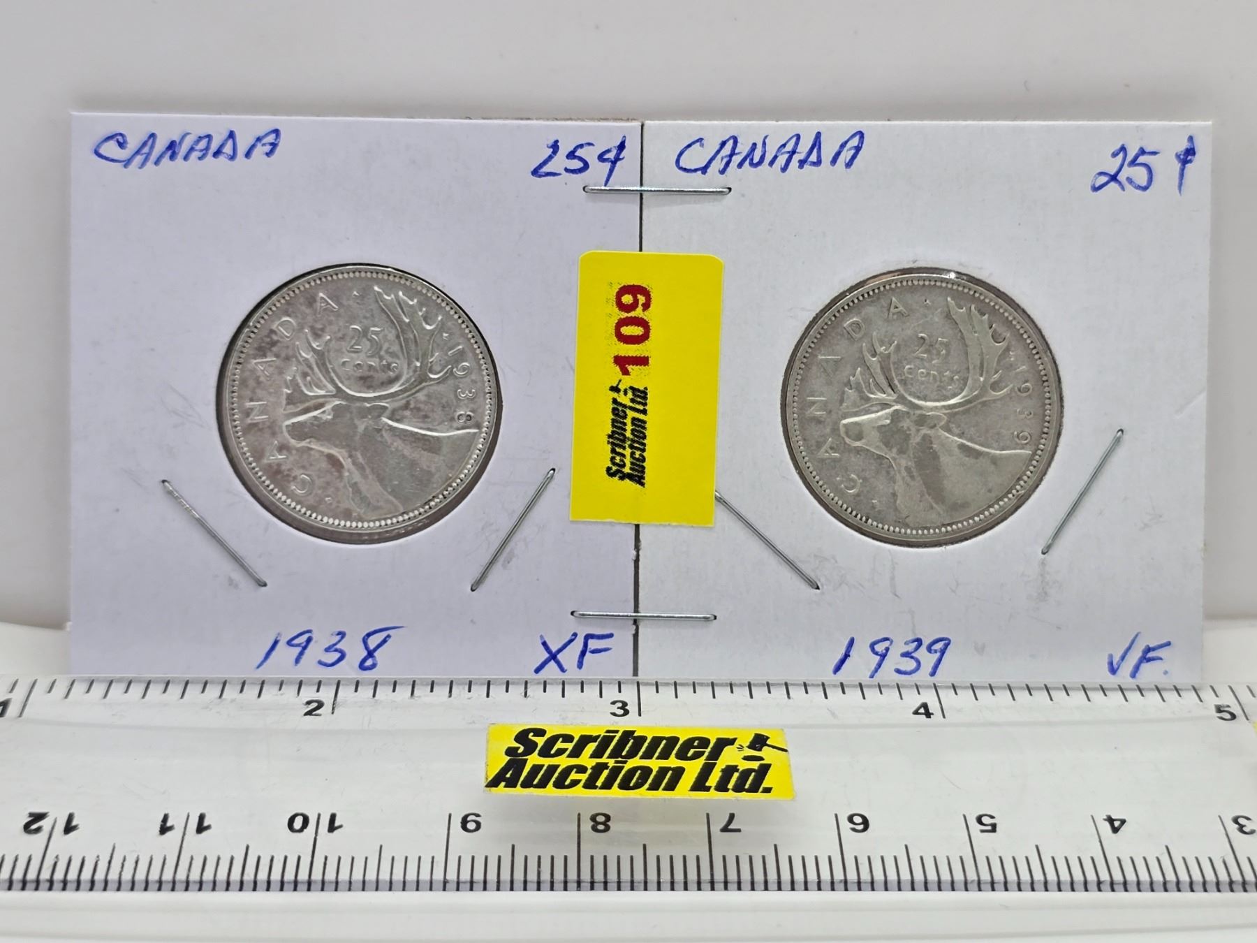 Canada Twenty Five Cent (2): 1938; 1939 (SEE PICS!) (Listing & Descriptions are a GUIDE ONLY and are subject to changes, errors, additions or deletions. Please use the provided pictures to satisfy yourself to the Condition and/or Grades. Please Read & Understand All Terms & Conditions for this Auction Sale.)