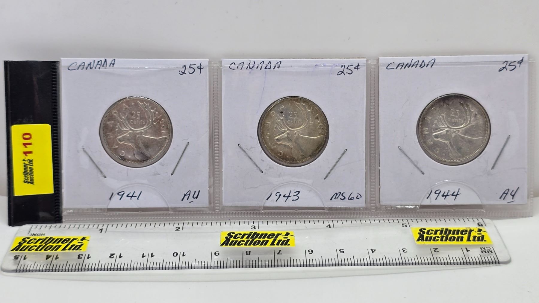 Canada Twenty Five Cent (3): 1941; 1943; 1944 (SEE PICS!) (Listing & Descriptions are a GUIDE ONLY and are subject to changes, errors, additions or deletions. Please use the provided pictures to satisfy yourself to the Condition and/or Grades. Please Read & Understand All Terms & Conditions for this Auction Sale.)