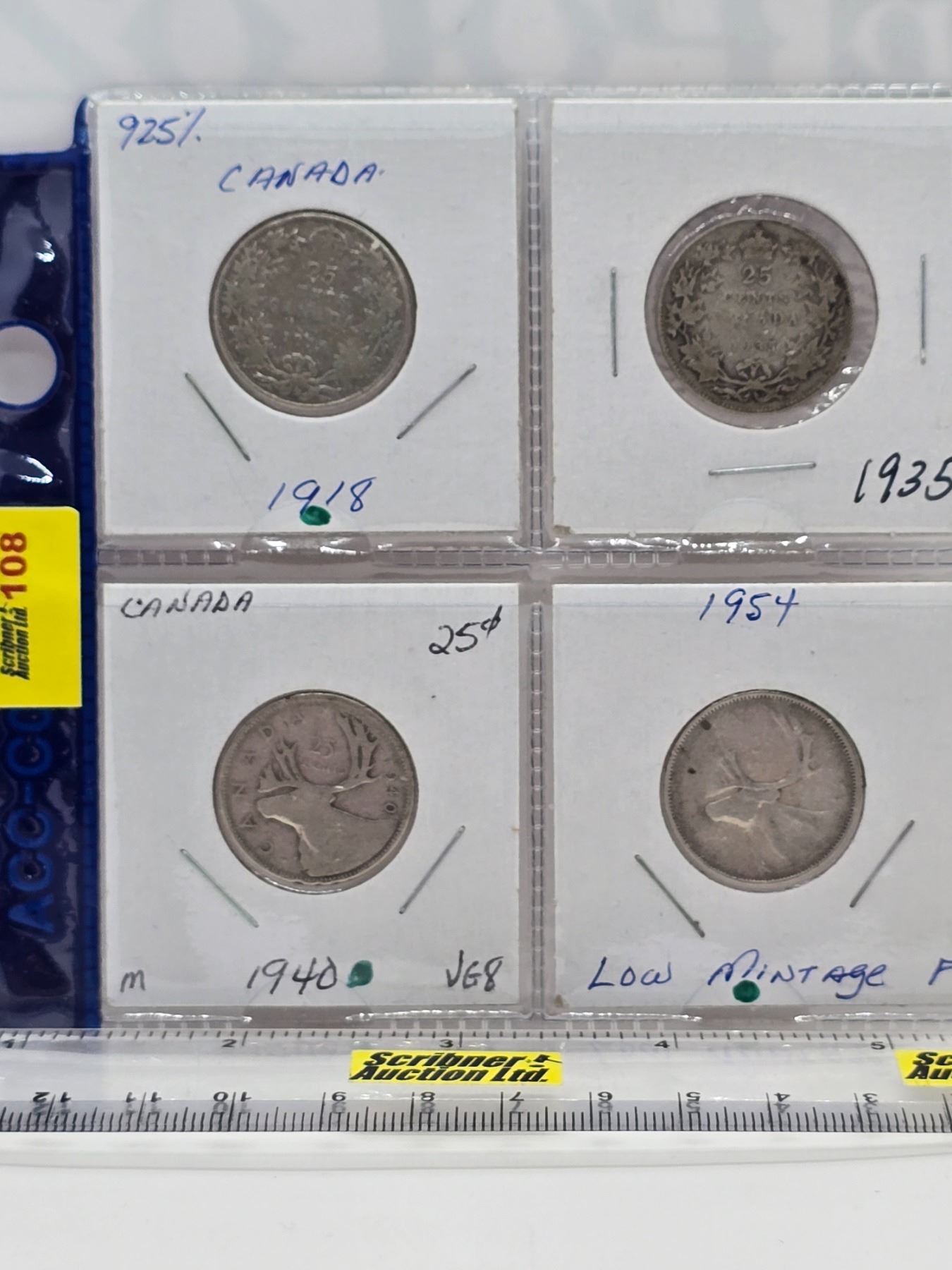 Canada Twenty Five Cent (4): 1918; 1935; 1940; 1954 (SEE PICS!) (Listing & Descriptions are a GUIDE ONLY and are subject to changes, errors, additions or deletions. Please use the provided pictures to satisfy yourself to the Condition and/or Grades. Please Read & Understand All Terms & Conditions for this Auction Sale.)