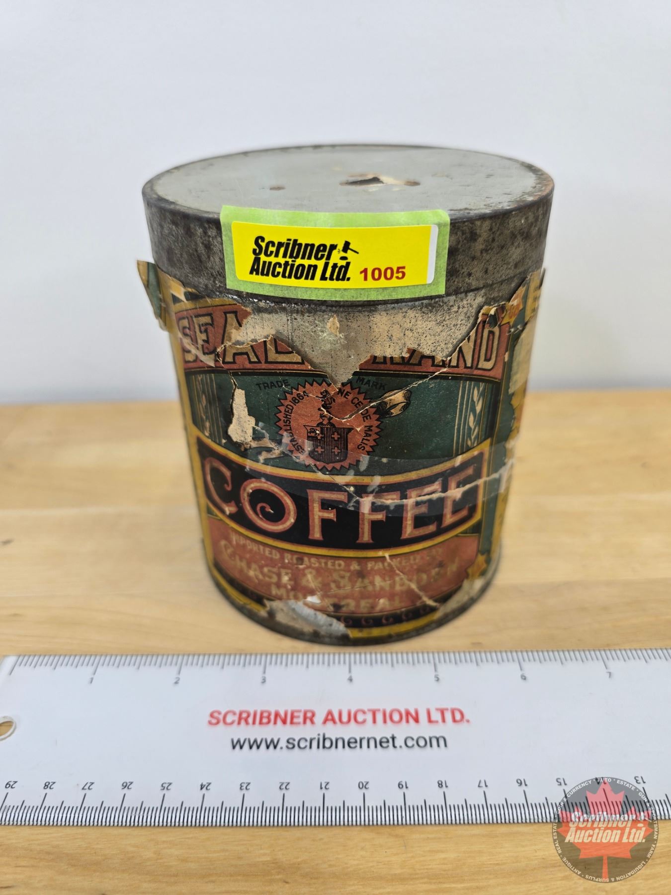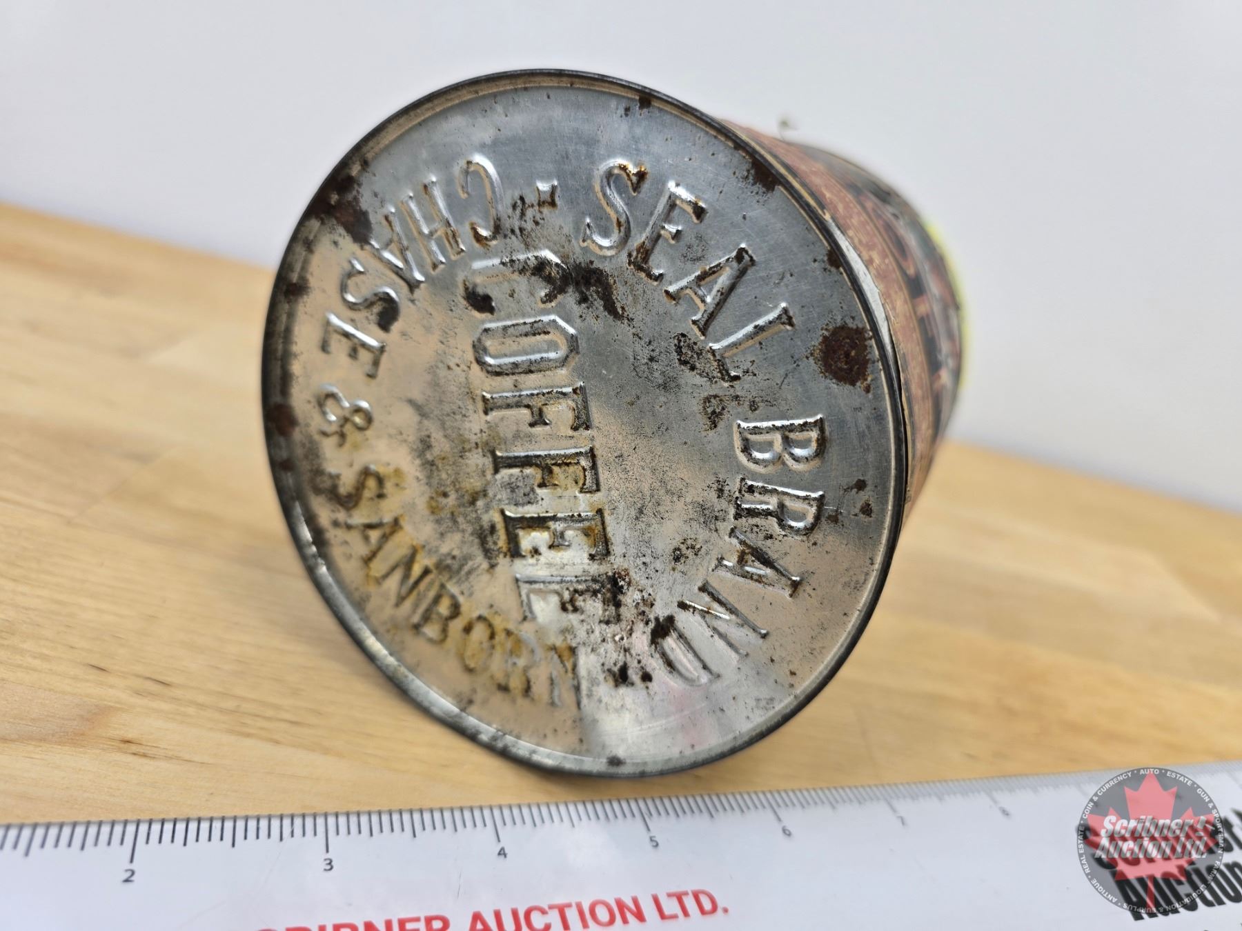 Chase & Sanborn SEAL BRAND Coffee Tin (Paper Label) (Bottom Embossed) (Label Torn) (5"H x 4-1/4"Dia)(SEE PICS!)