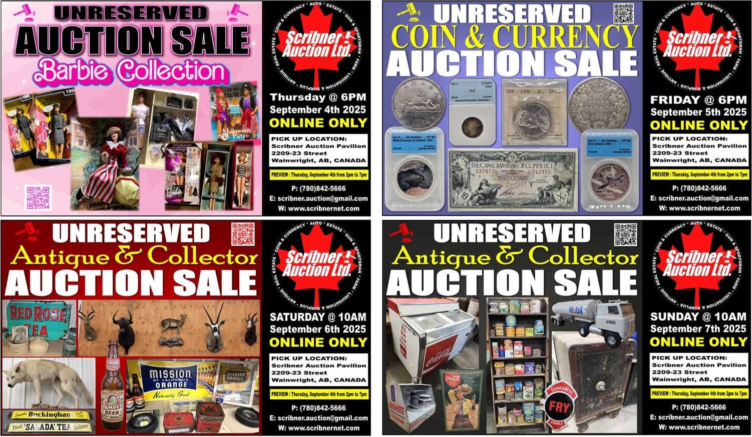 THURSDAY - FRIDAY - SATURDAY - SUNDAY : Purchases will be packaged up after the auction and shipped via Canada Post or PUROLATOR (please let us know which of those 2 Couriers you prefer) within 12-16 days of the auction sale. Please contact us via email (reception.scribnerauction@gmail.com) or call 780-842-5666 prior to the auction if you wish to arrange alternate shipping. Shipping & Handling Charges will be charged to your credit card at the time of shipping. Most packages shipped via Canada Post come with $100 insurance. Please review Canada Post Terms & Conditions & Purolator Terms & Conditions for their respective Insurance Policies. If you want EXTRA Insurance from the carrier, you must instruct our office to purchase additional insurance! Scribner Auction Ltd. will not be responsible for any damage or breakage to any item for any reason (shipping, handling or otherwise). If you wish to arrange for Pick Up at our Wainwright, AB location, please call our office to make an appointment 780-842-5666. You MUST schedule an appointment (NO DROP INS PLEASE!)