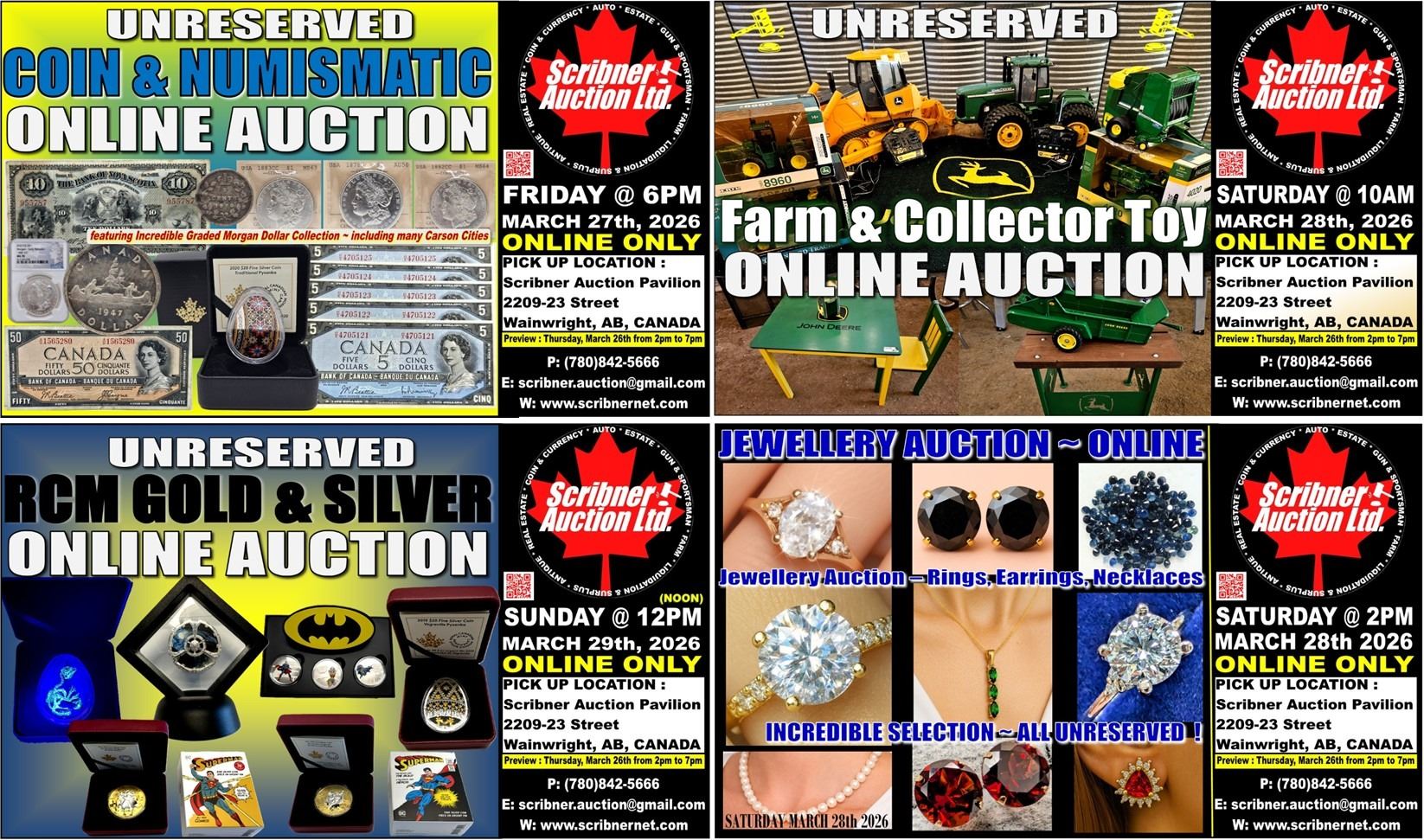 FRIDAY - SATURDAY - SUNDAY : Purchases will be packaged up after the auction and shipped via Canada Post or PUROLATOR (please let us know which of those 2 Couriers you prefer) within 12-16 days of the auction sale. IF CANADA POST IS ON STRIKE we will be using Purolator. Purolator has offered us great rates competitive with Canada Post in some cases even better depending on location. Please contact us via email (reception.scribnerauction@gmail.com) or call 780-842-5666 prior to the auction if you wish to arrange alternate shipping. Shipping & Handling Charges will be charged to your credit card at the time of shipping. Most packages shipped via Canada Post come with $100 insurance. Please review Canada Post Terms & Conditions & Purolator Terms & Conditions for their respective Insurance Policies. If you want EXTRA Insurance from the carrier, you must instruct our office to purchase additional insurance! Scribner Auction Ltd. will not be responsible for any damage or breakage to any item for any reason (shipping, handling or otherwise). If you wish to arrange for Pick Up at our Wainwright, AB location, please call our office to make an appointment 780-842-5666. You MUST schedule an appointment (NO DROP INS PLEASE!)