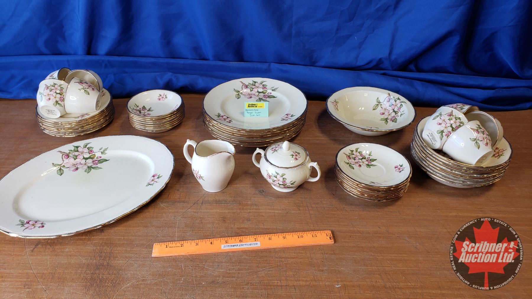 China Set "Blossom Time Royal Swan" : (8 Dinner Plates, 8 Cake Plates, 8 Cups/Saucers, 8 Soup Bowls,