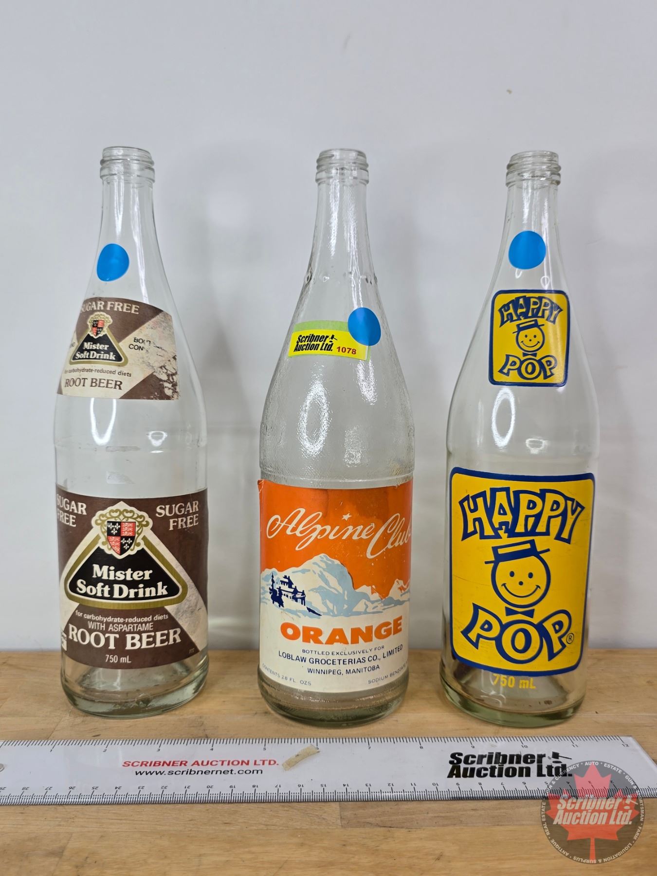 Clear Bottles (3) Mister Soft Drink (Paper Label); Alpine Club Orange (Paper Label) & Happy Pop (ACL) (All 11-1/2"H) (SEE PICS!)