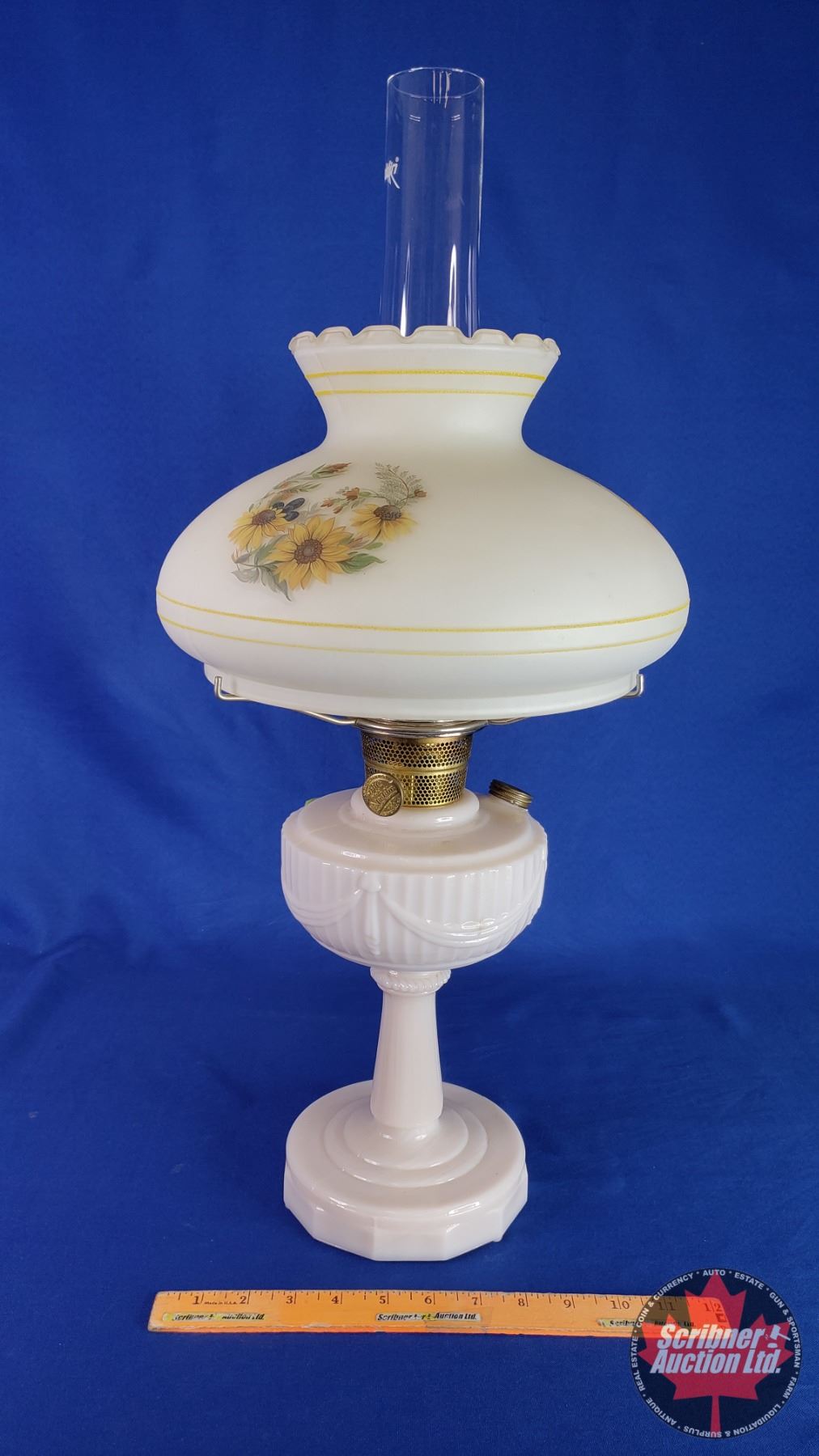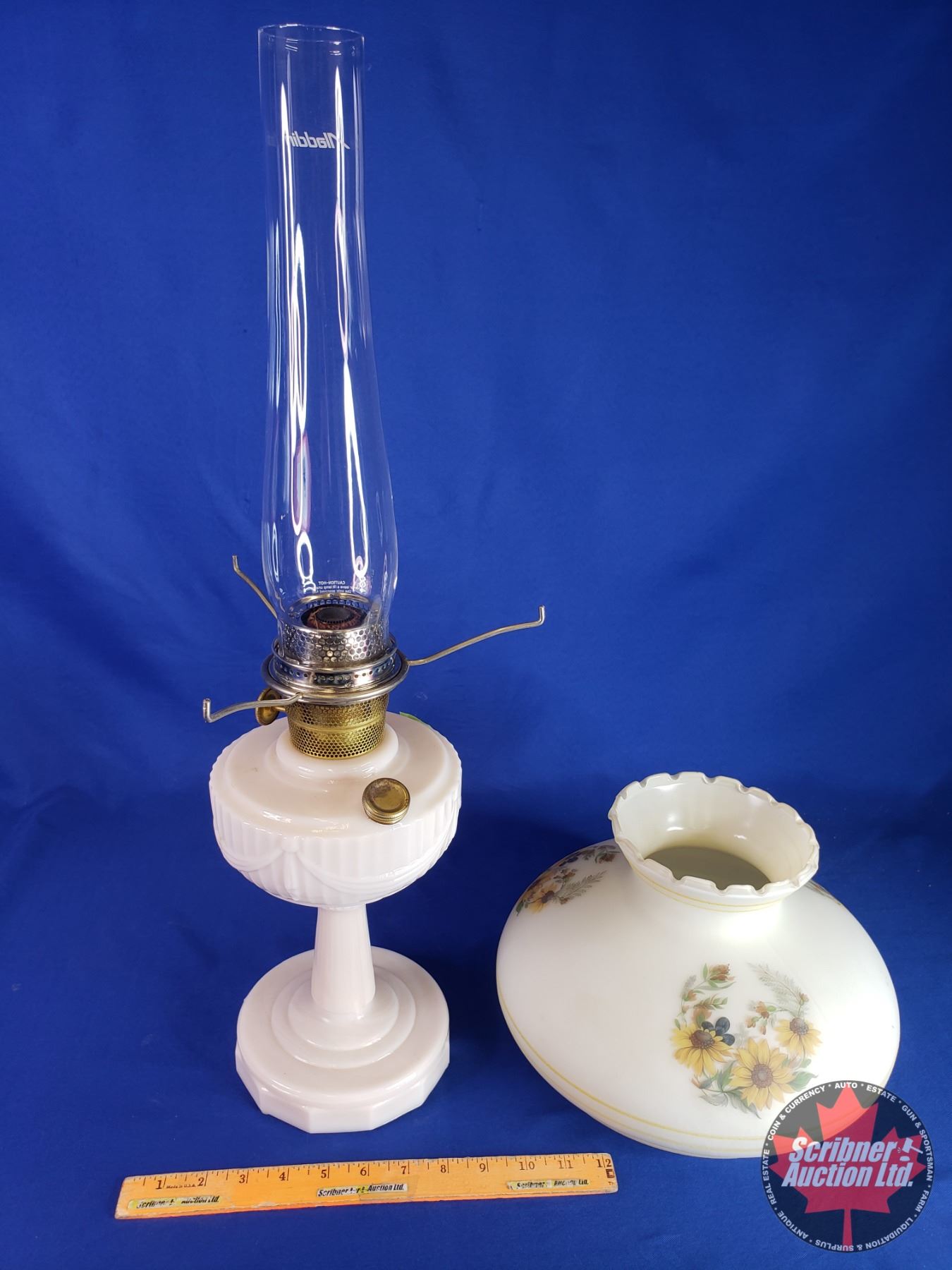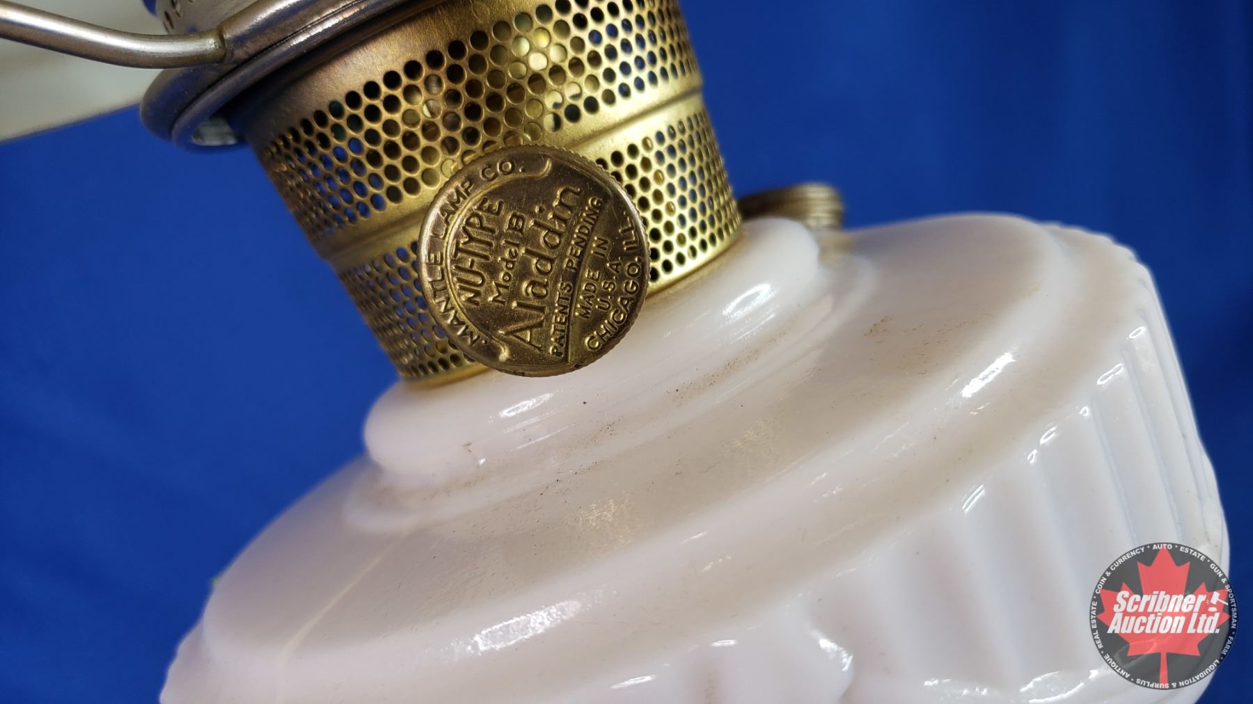 Coal Oil Lamp: Aladdin Lincoln Drape (Pinkish) Floral Shade - Model B Burner (25"H Total with Chimney) (SEE PICS!)