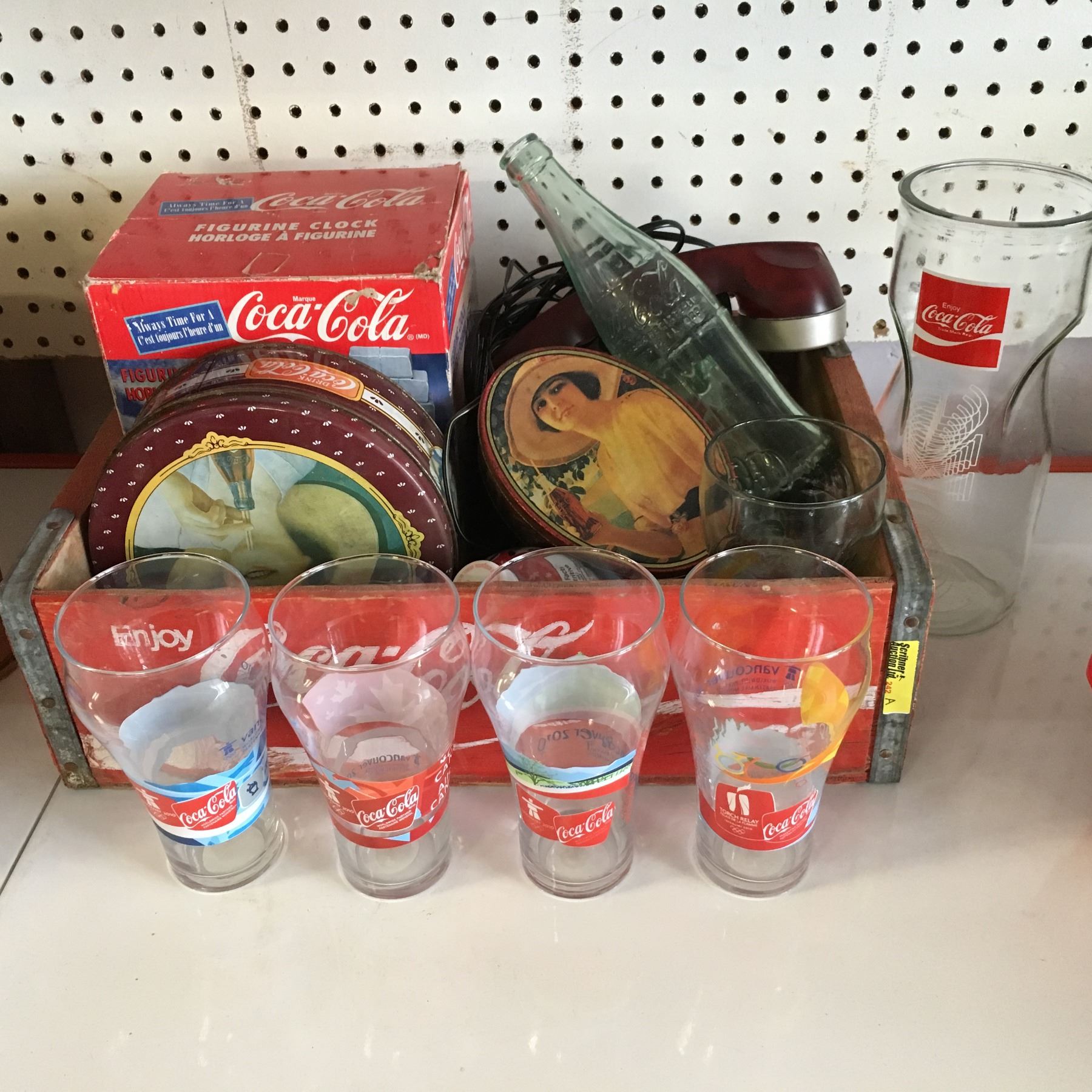 Coca-Cola Wood Tray w/Coca-Cola Collectibles (Bottles, Phone, Clock, etc)