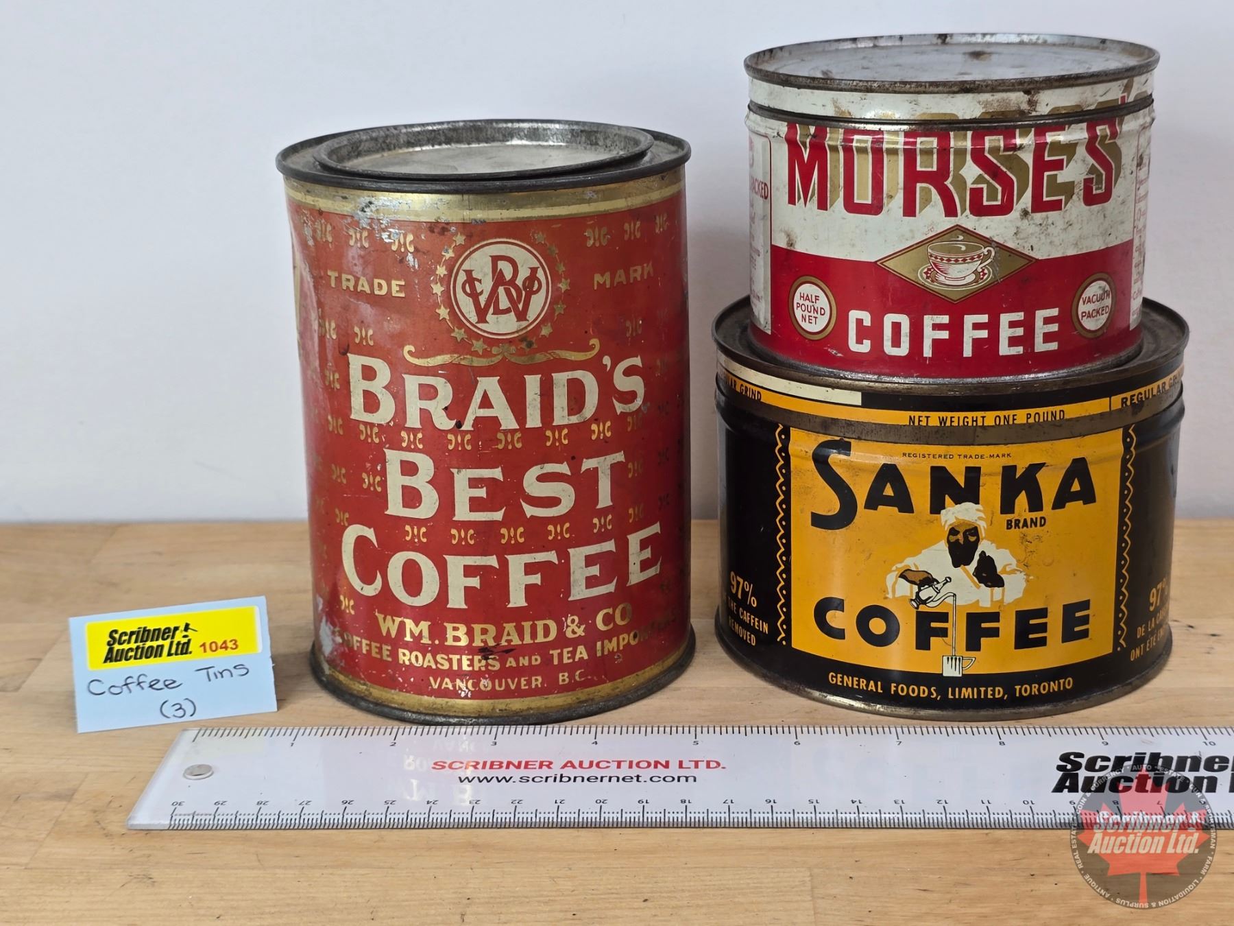 Coffee Tin Combo (3): BRAID'S BEST ; MORSES ; SANKA (Tallest Measures: 5-1/2 H x 4-1/4 Dia)