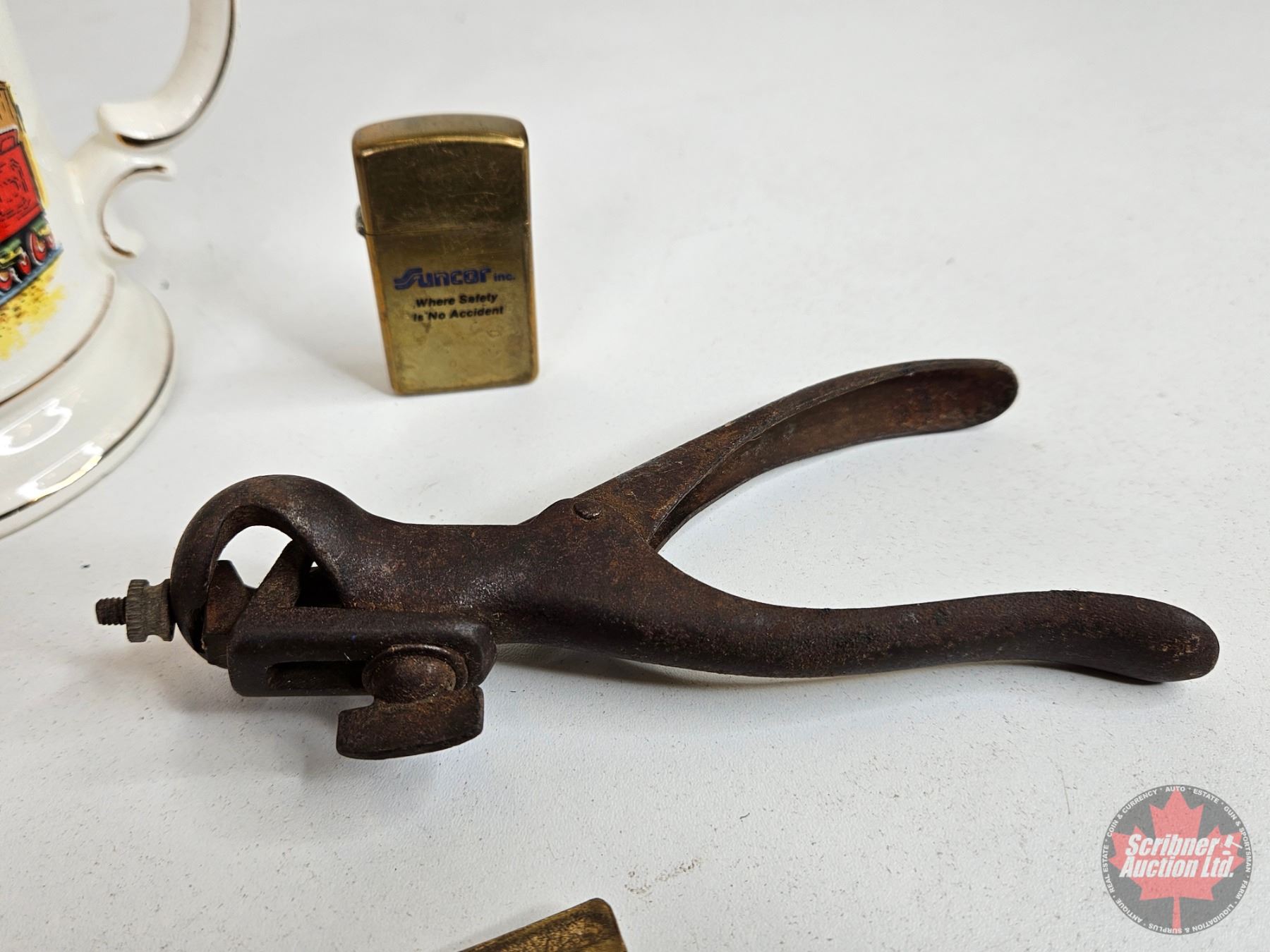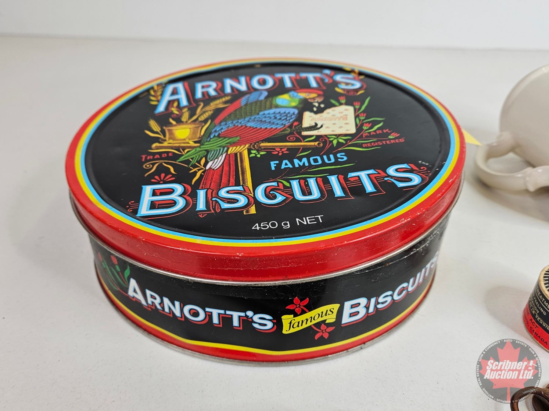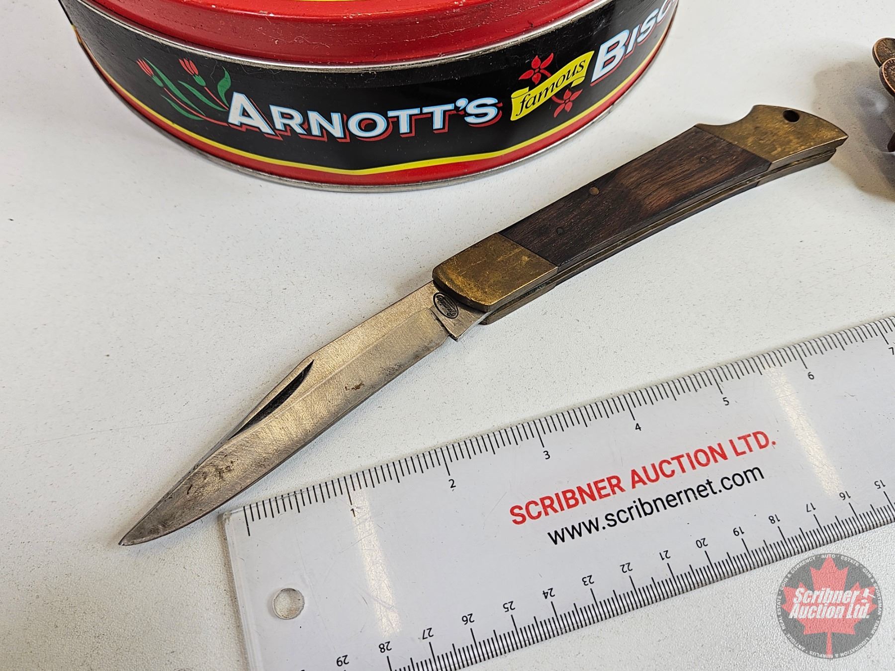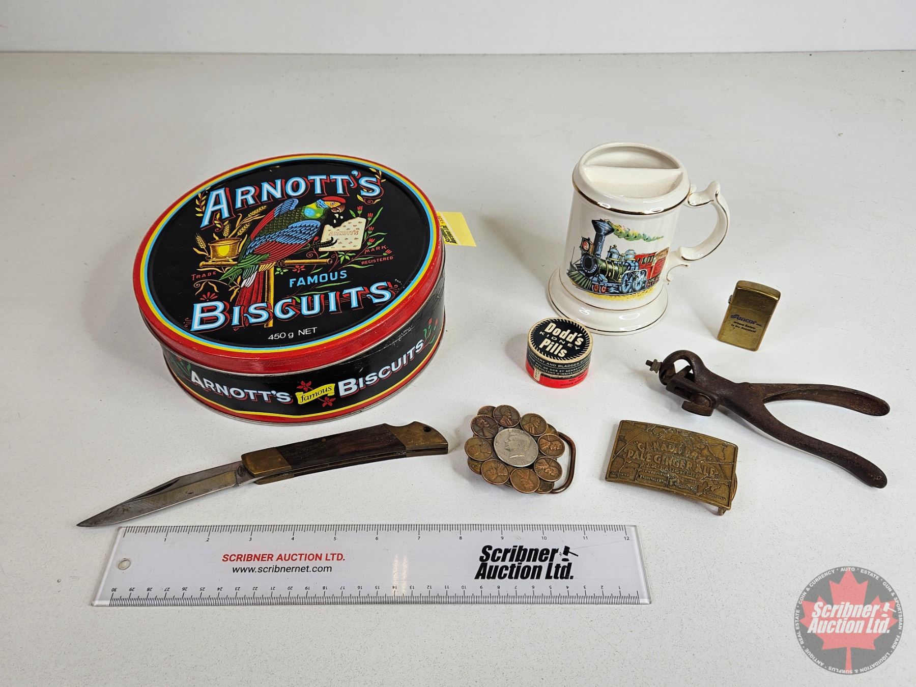 Arnott's Biscuits Tin; Mustache Mug; Pocket Knife; Belt Buckles; LIghter; Saw Set; etc