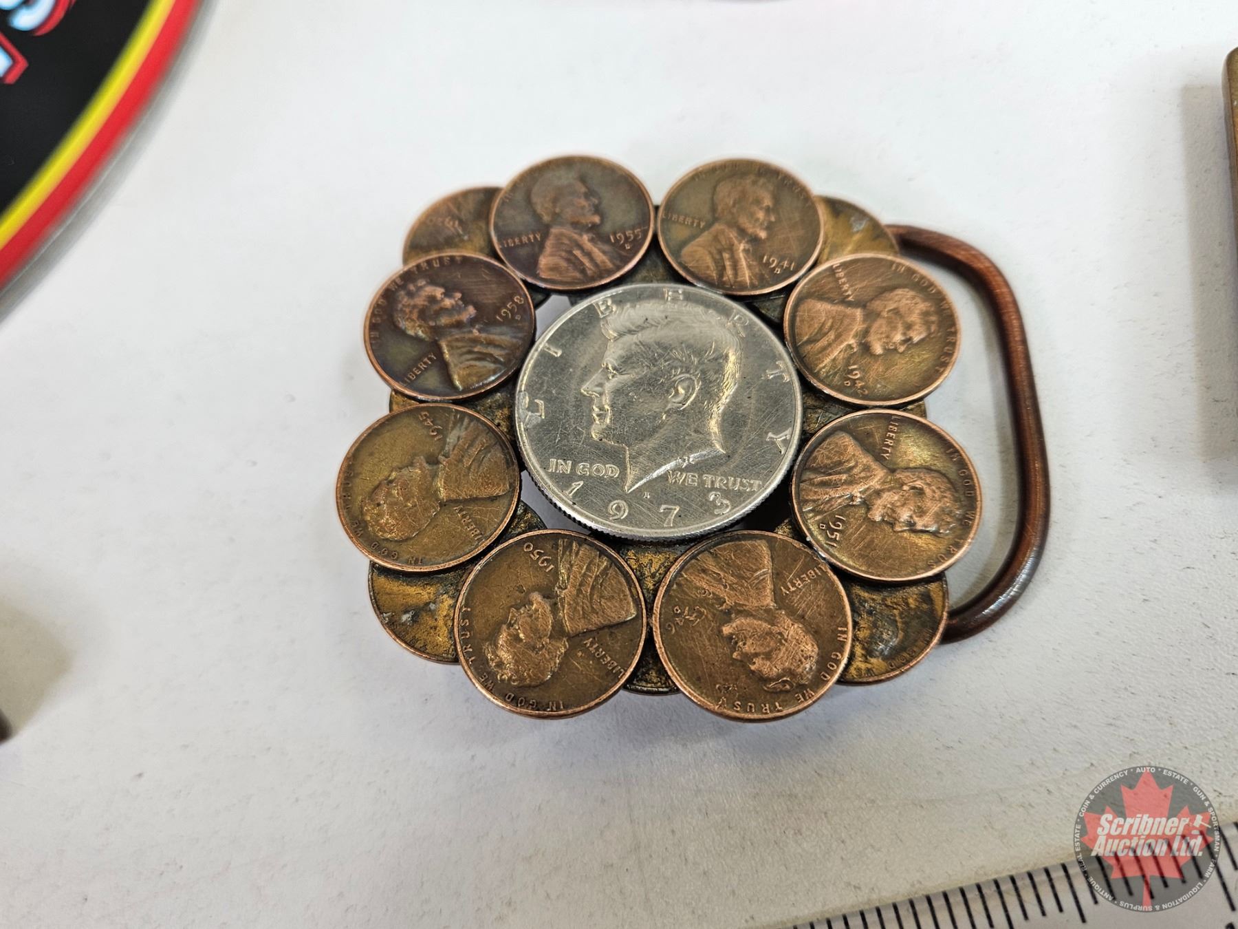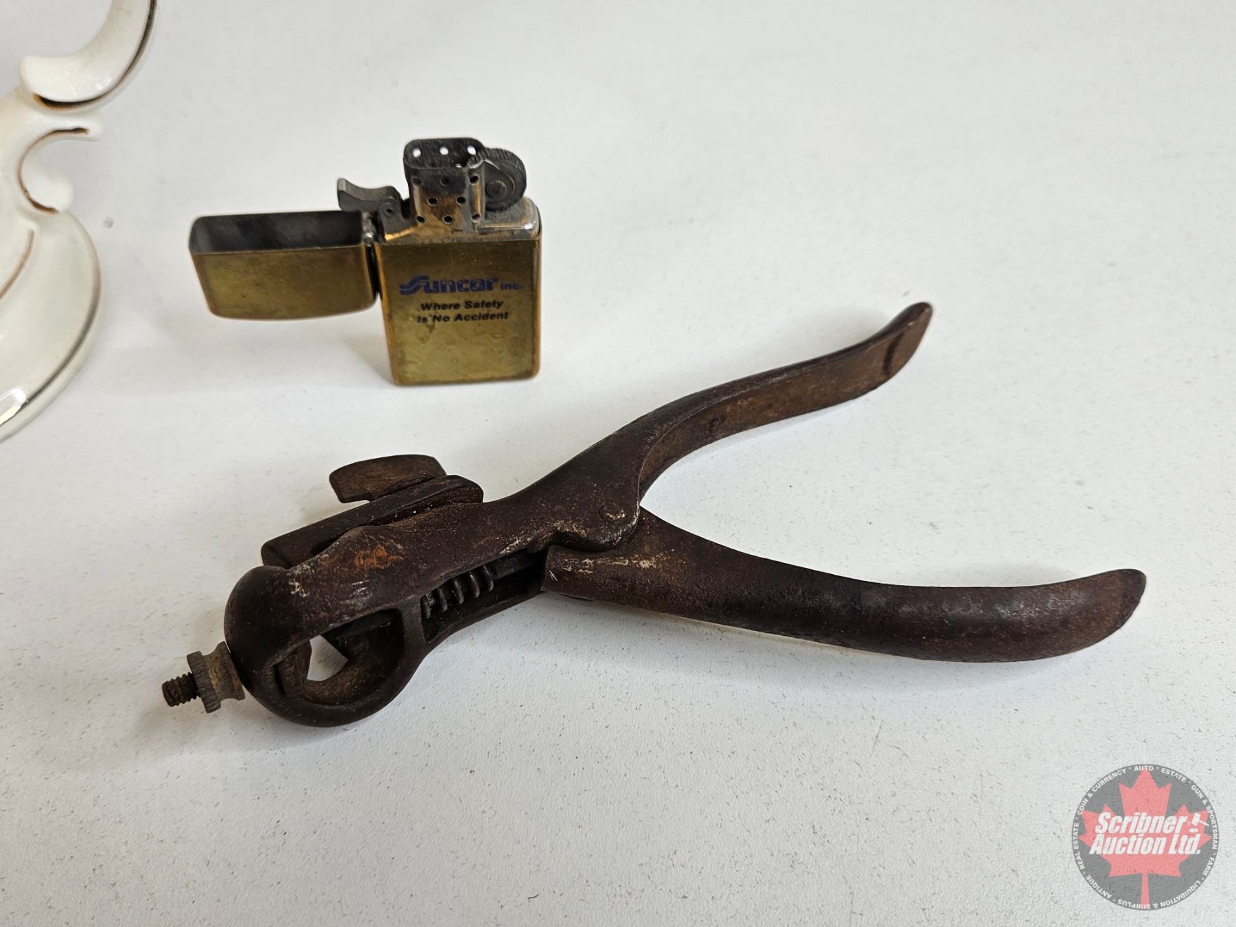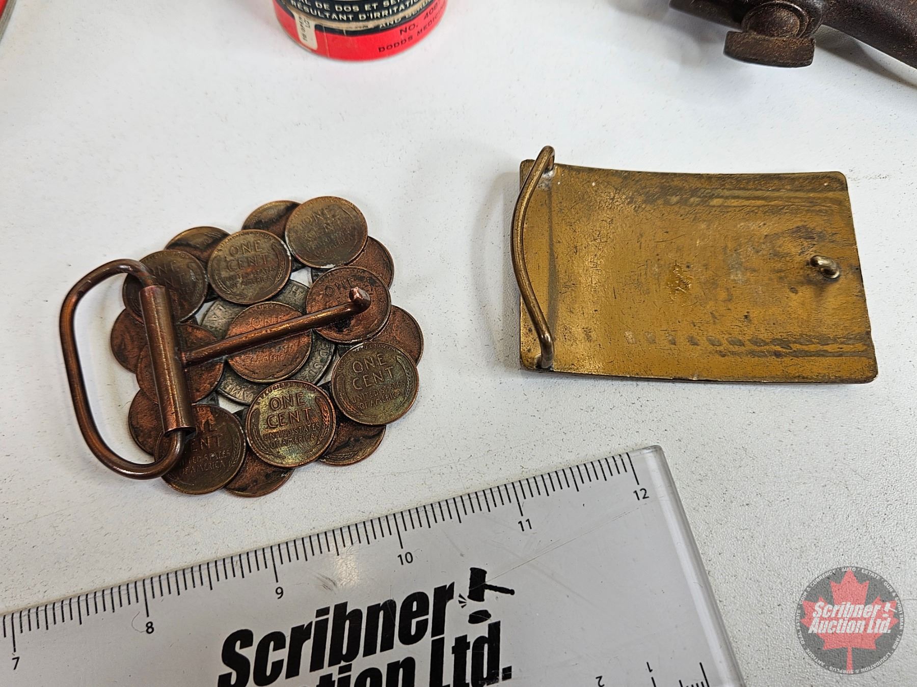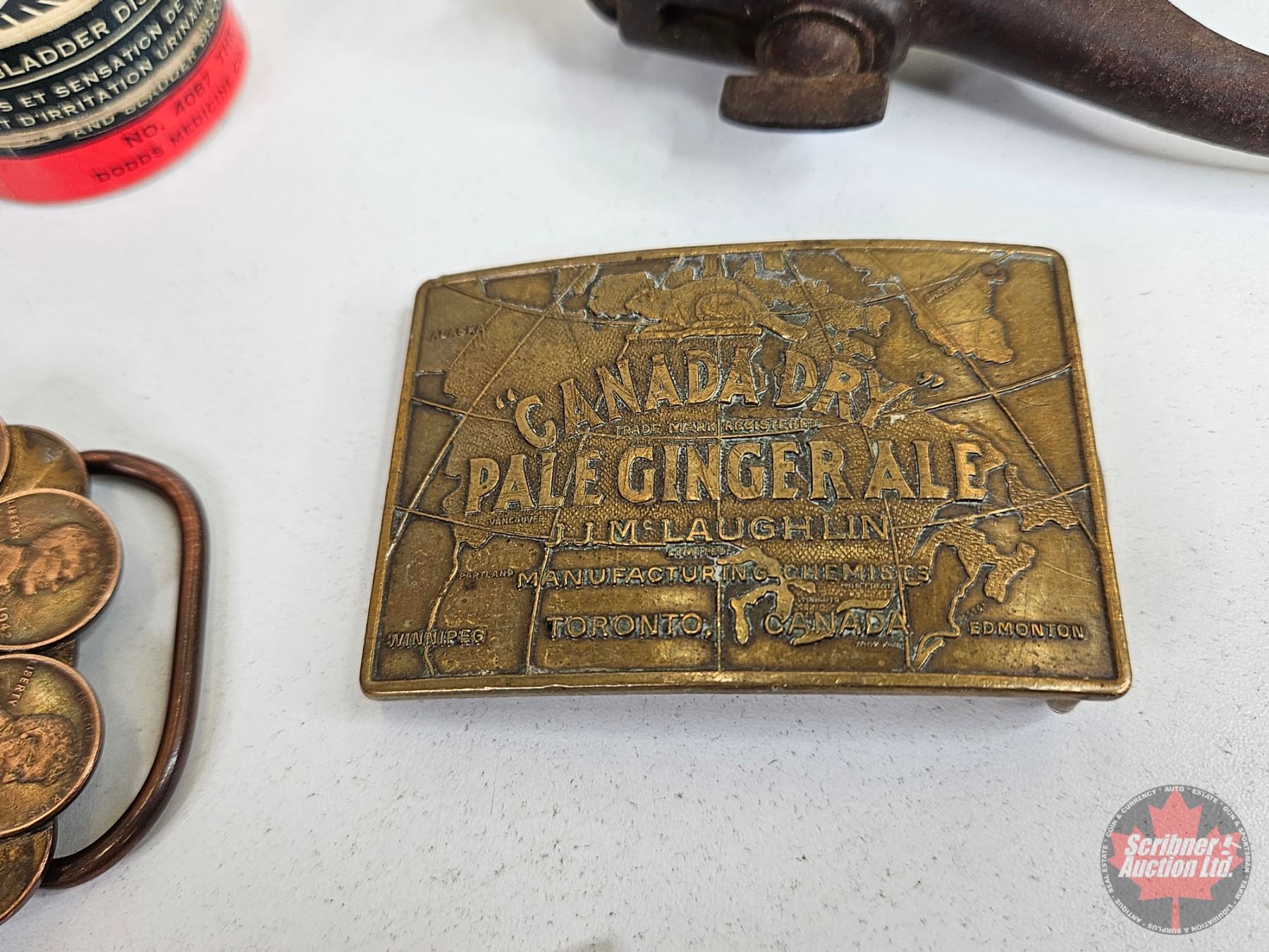 Arnott's Biscuits Tin; Mustache Mug; Pocket Knife; Belt Buckles; LIghter; Saw Set; etc