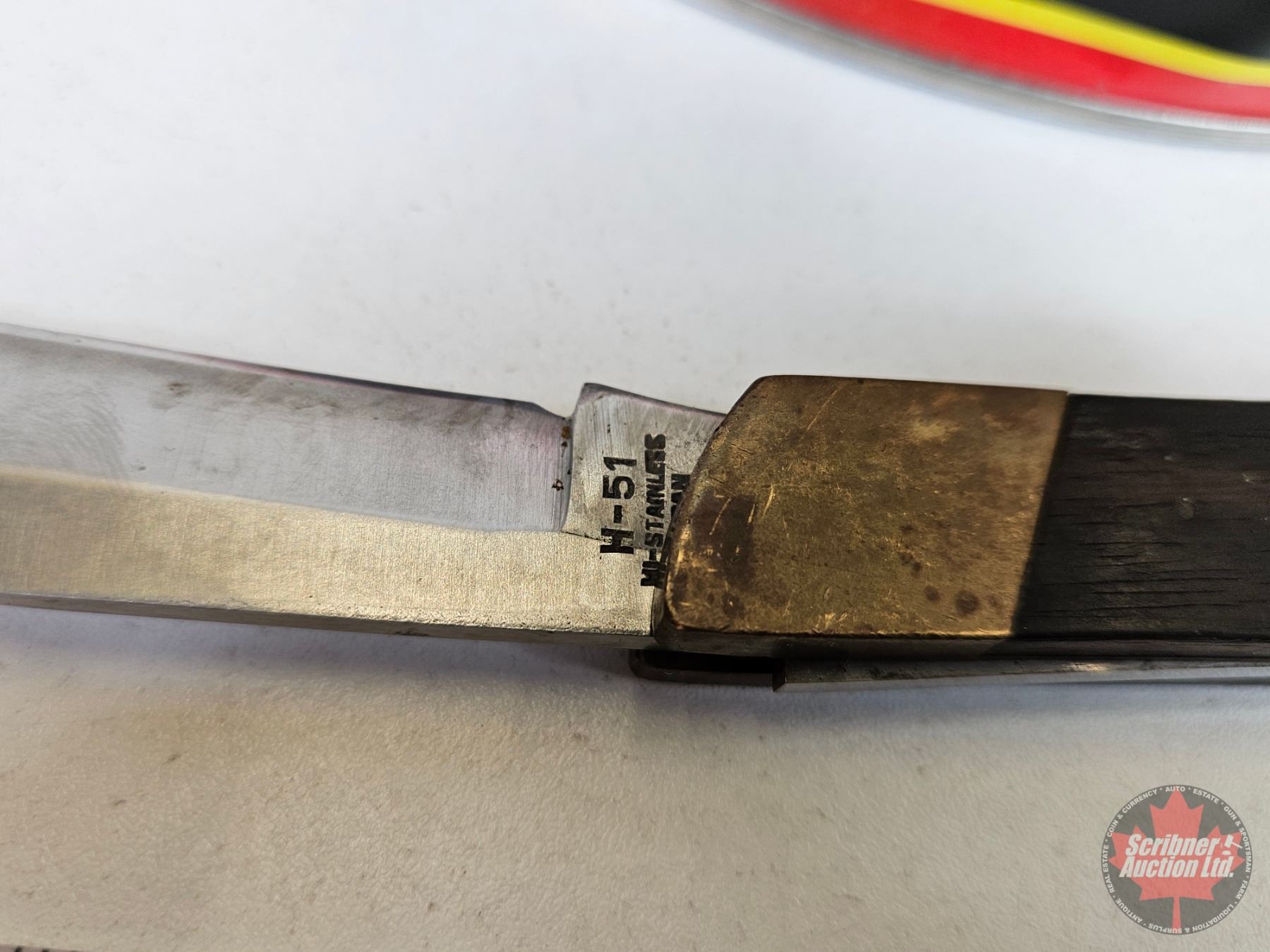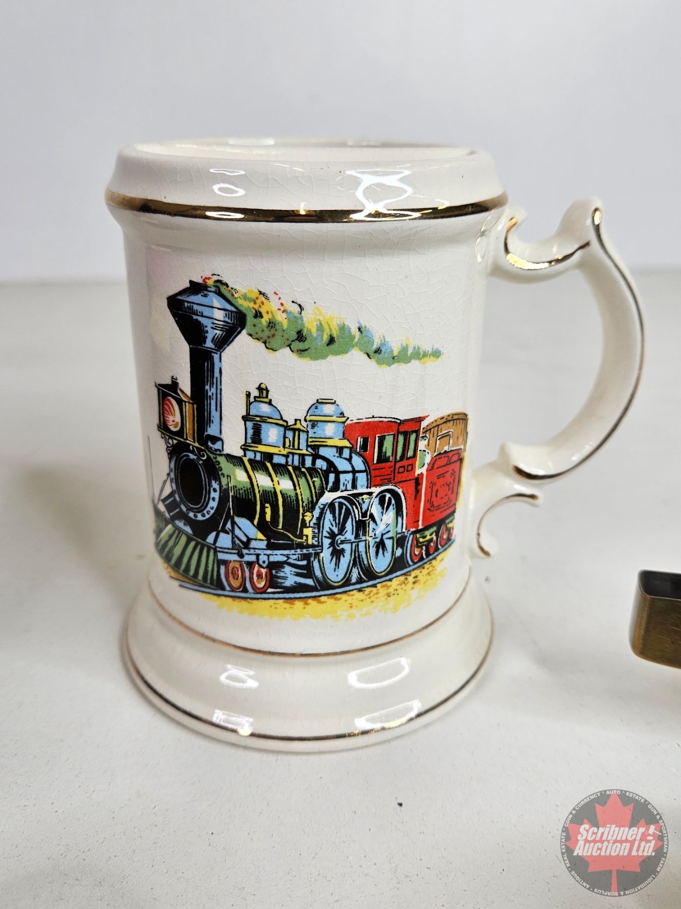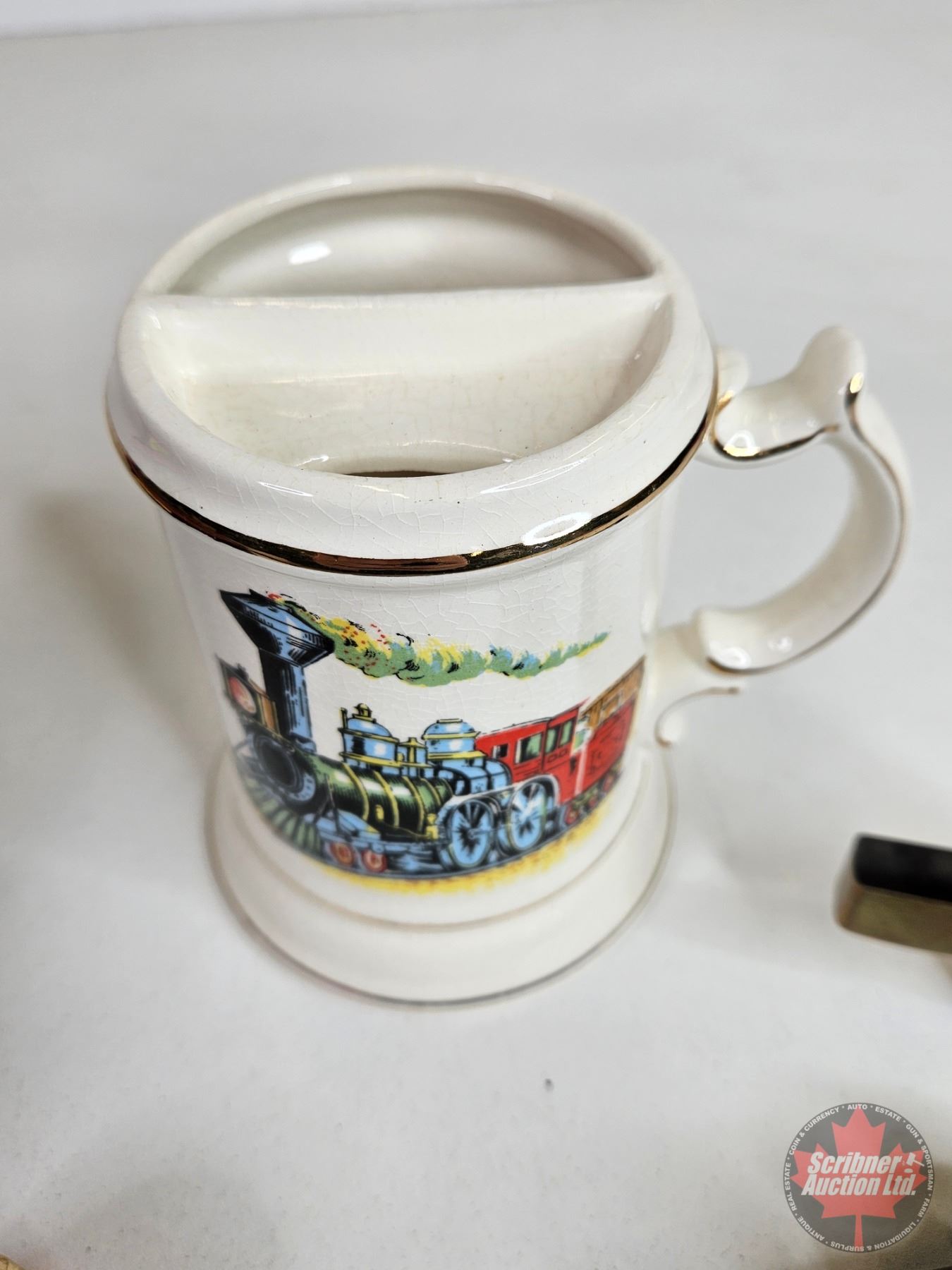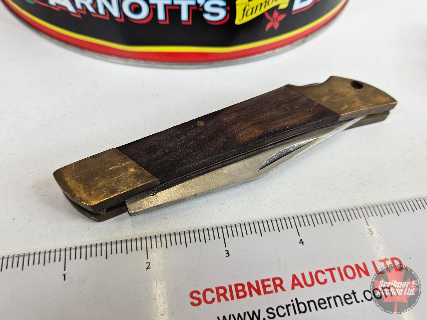 Arnott's Biscuits Tin; Mustache Mug; Pocket Knife; Belt Buckles; LIghter; Saw Set; etc