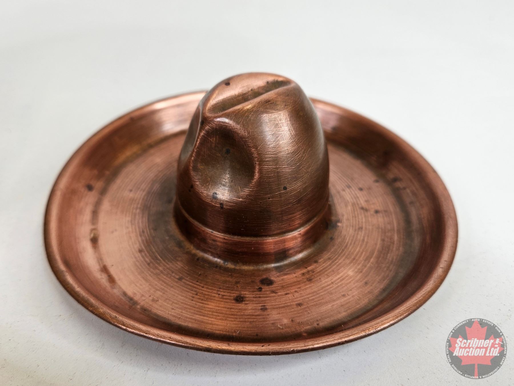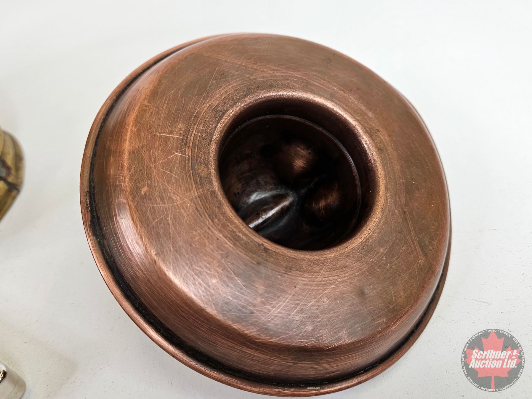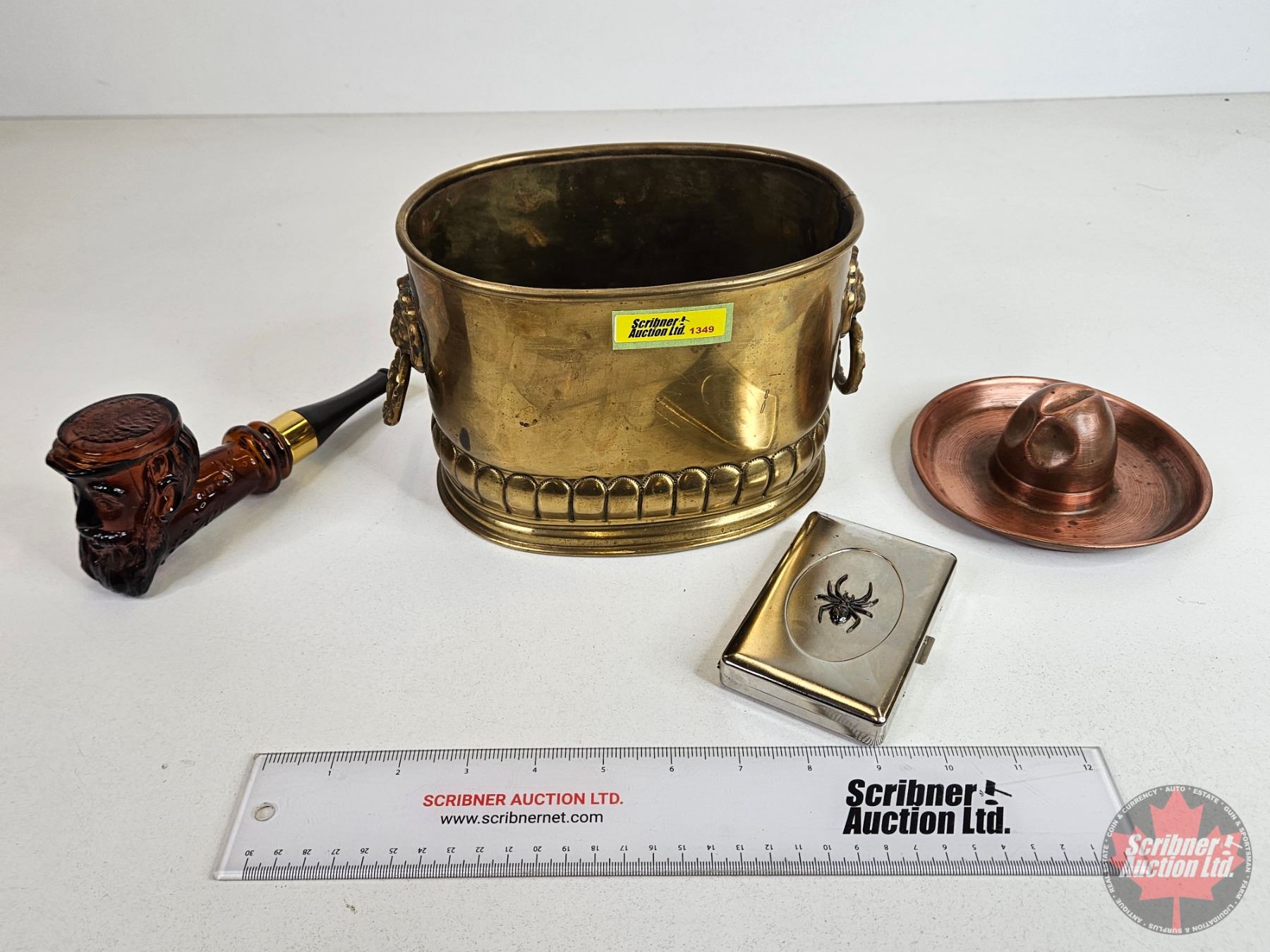 Collector Combo: Brass Lion Head Jardiniere, Avon Pipe, Coppercraft Hat Ashtray, Cigarette Case