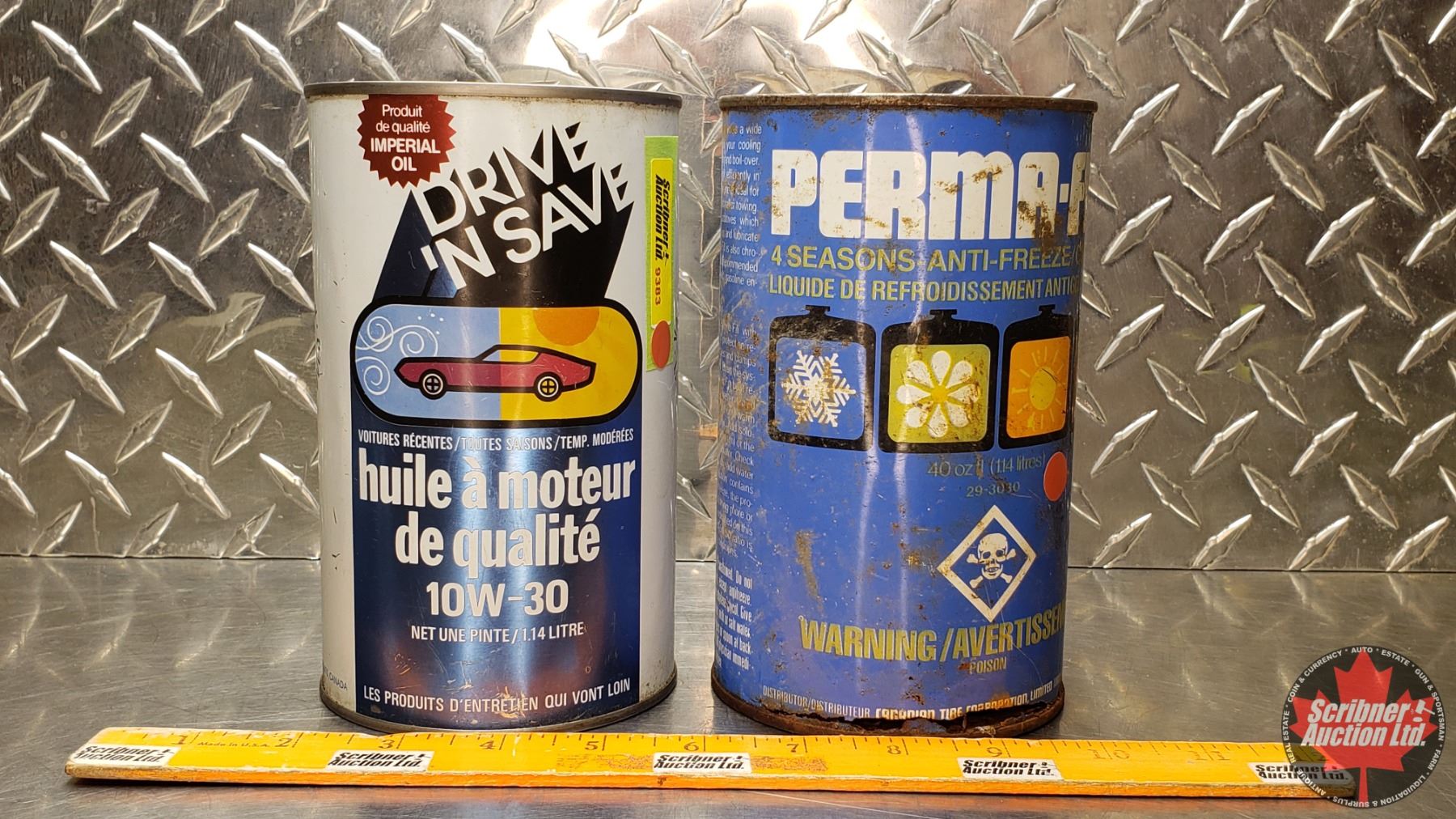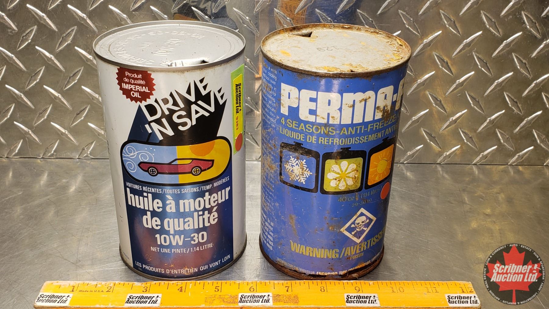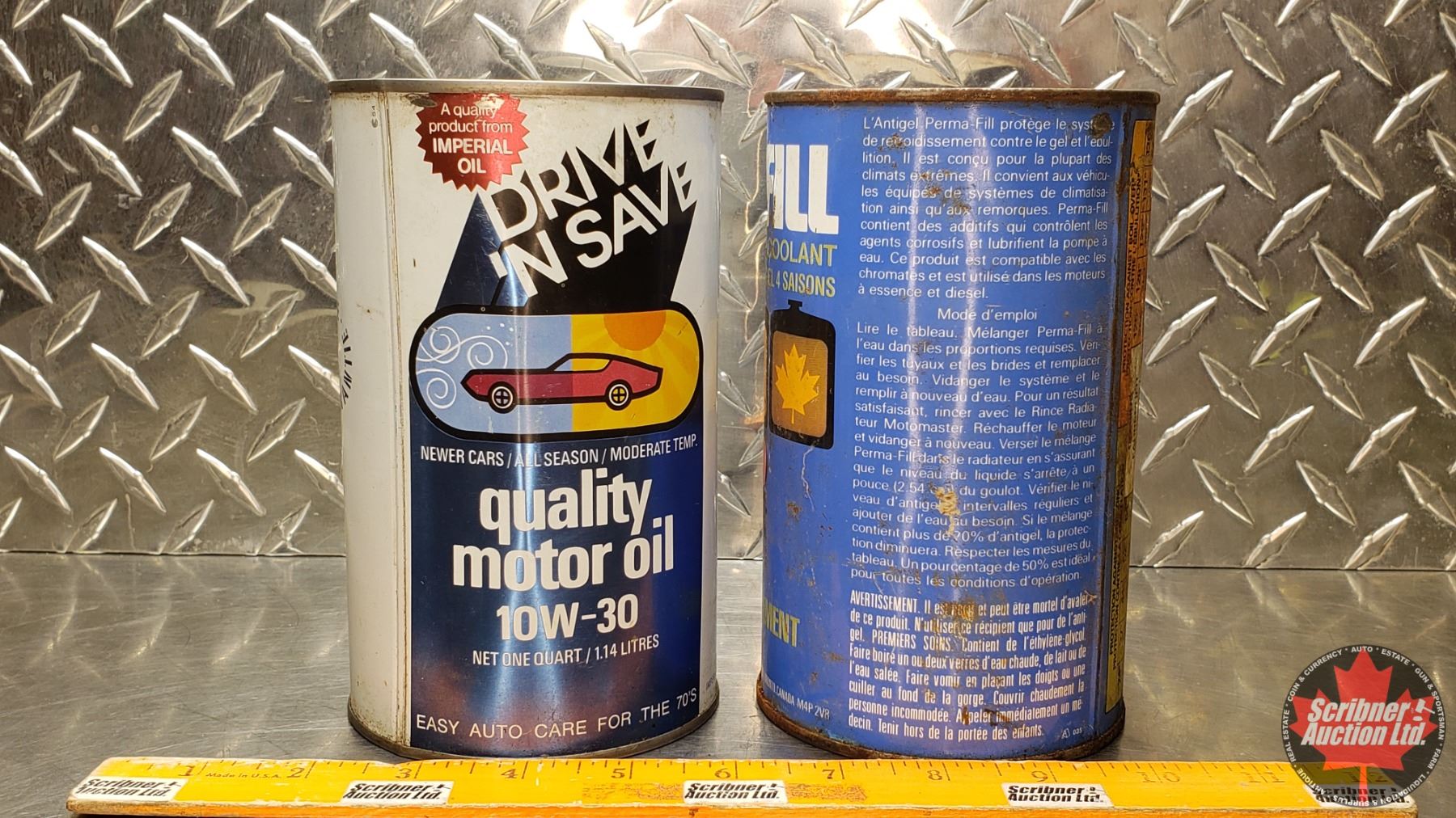 Collector Combo : Drive 'N Save Oil Tin & Perma-Fill Antifreeze Tin (6-1/2"H) (SEE PICS!)