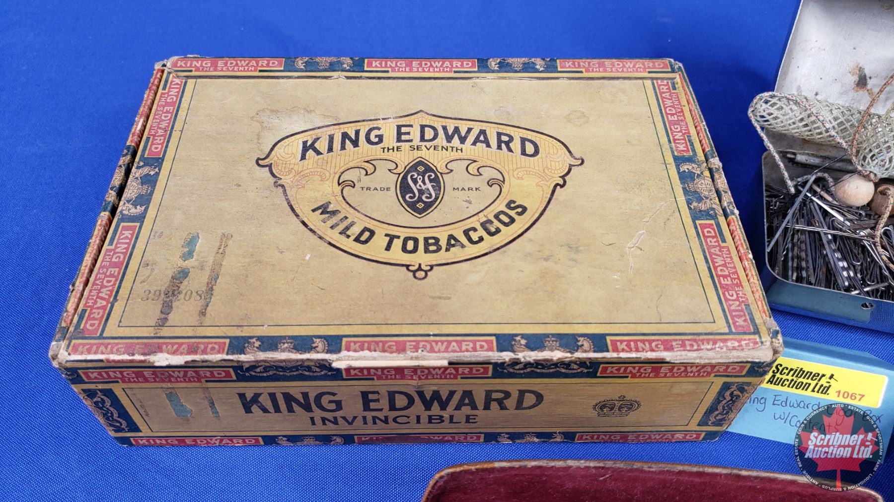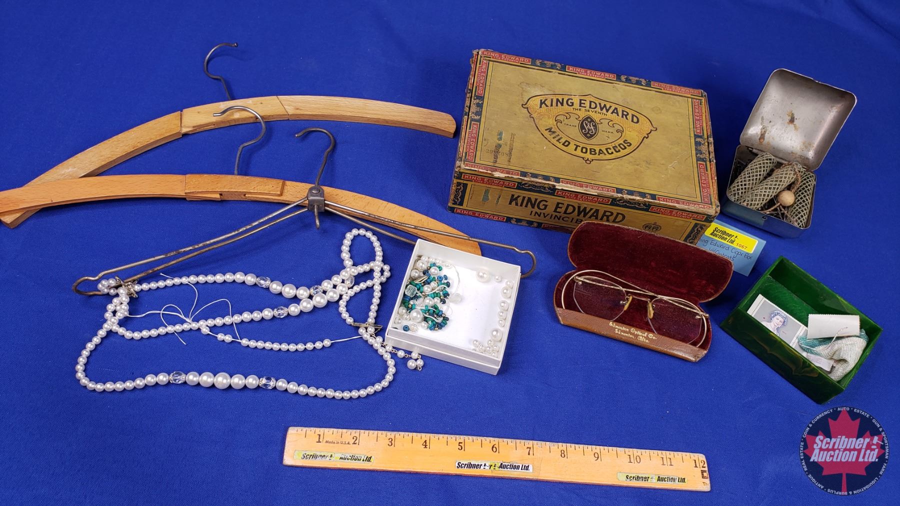 Collector Combo : King Edward Cigar Box; Wood Hangers; Variety Jewelry; Spectacles; Phots; etc (Box Measures: 2-1/2"H x 9"W x 6"D) (SEE PICS!)