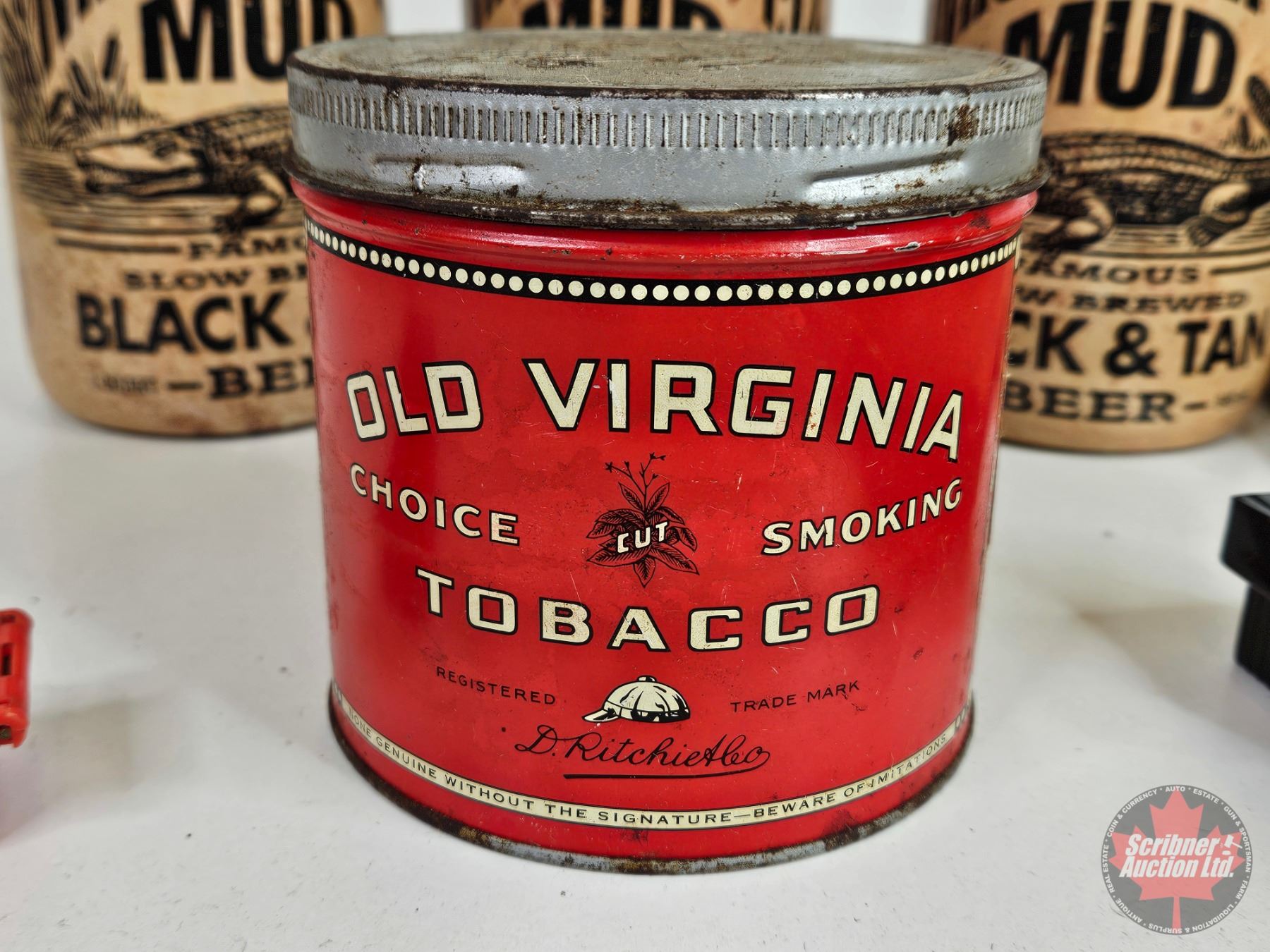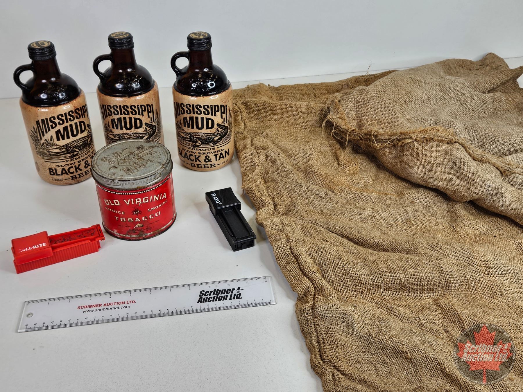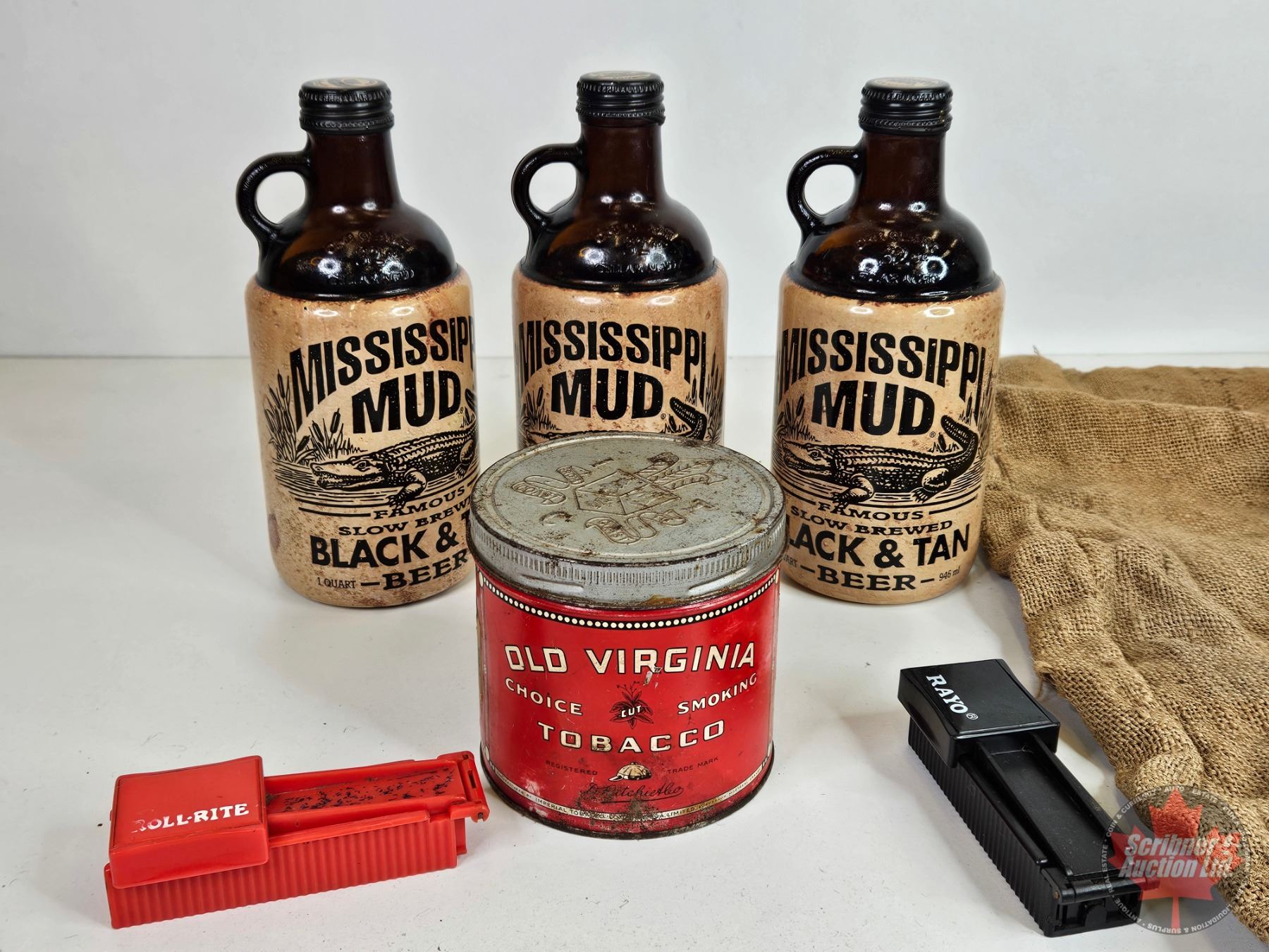 Collector Combo: Mississippi Mud Jugs (3); Old Virginia Tobacco Tin; Cig Rollers (2); Burlap Sacks (2)