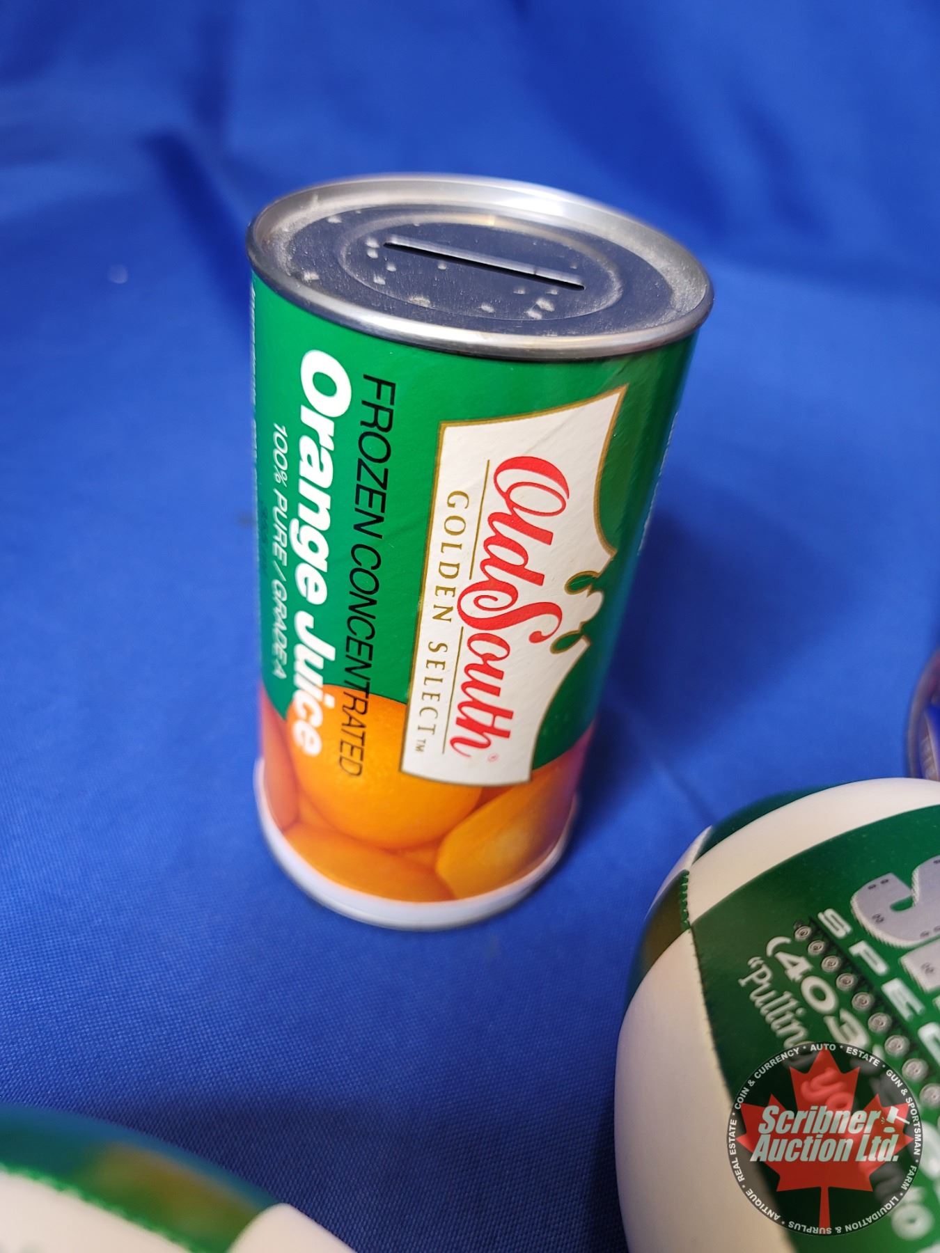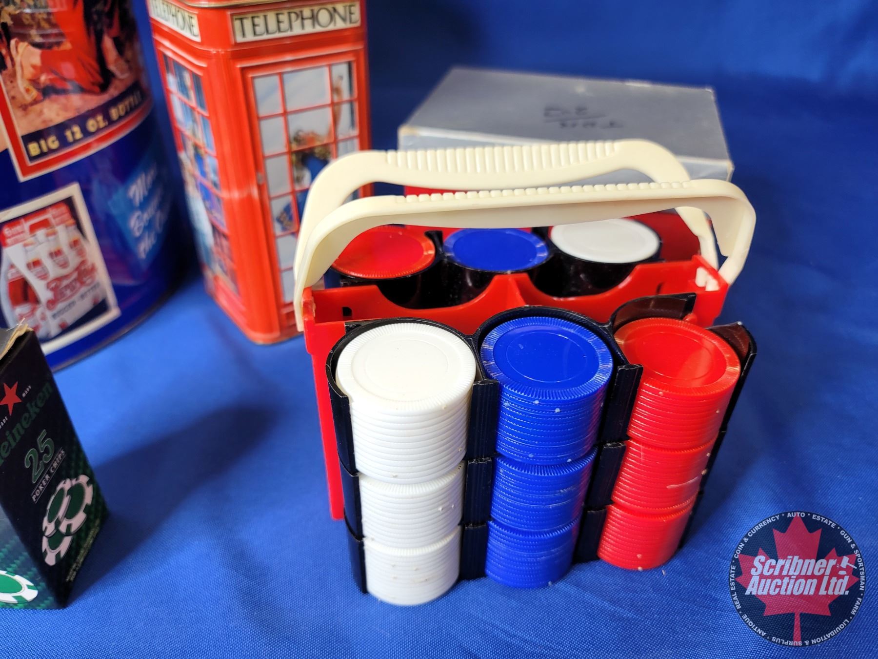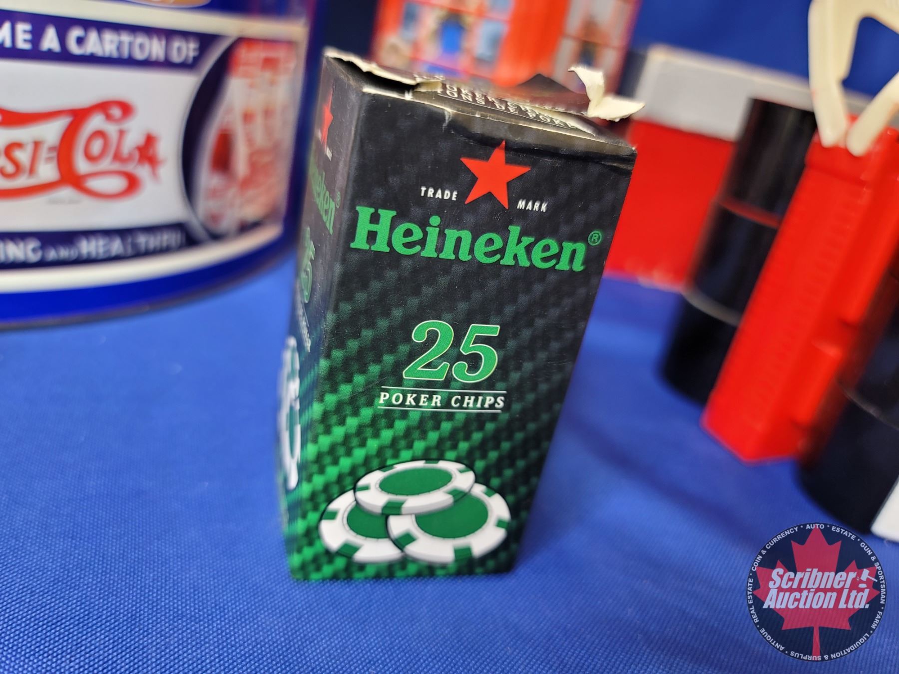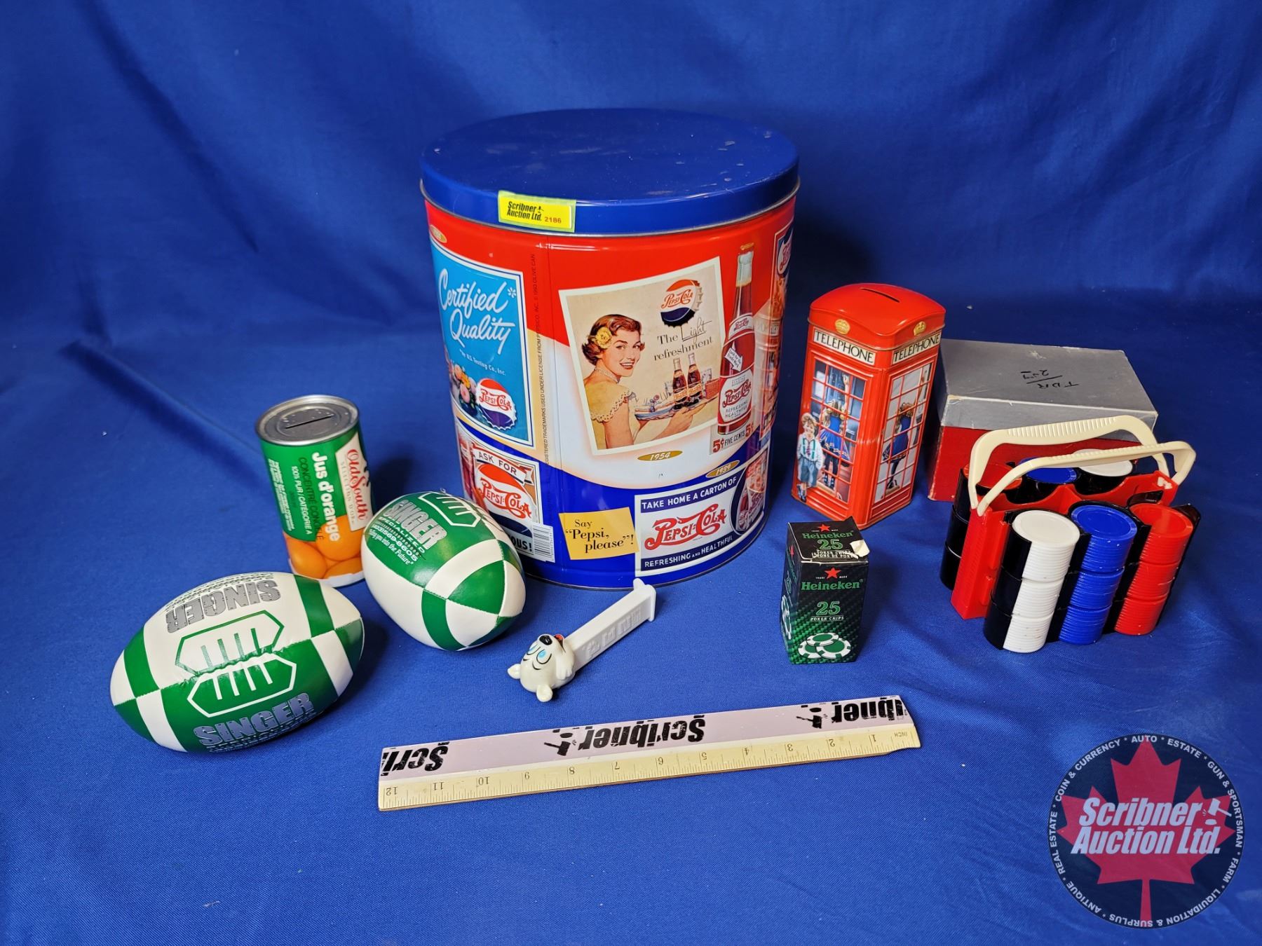 Collector Combo : Pepsi Cannister (c.1993), Foam Footballs (2), Pez Dispenser, Coin Banks (Telephone & Orange Juice) & Heineken Poker Chips (Cannier Measures : 11"H x 10"Dia) (SEE PICS!)