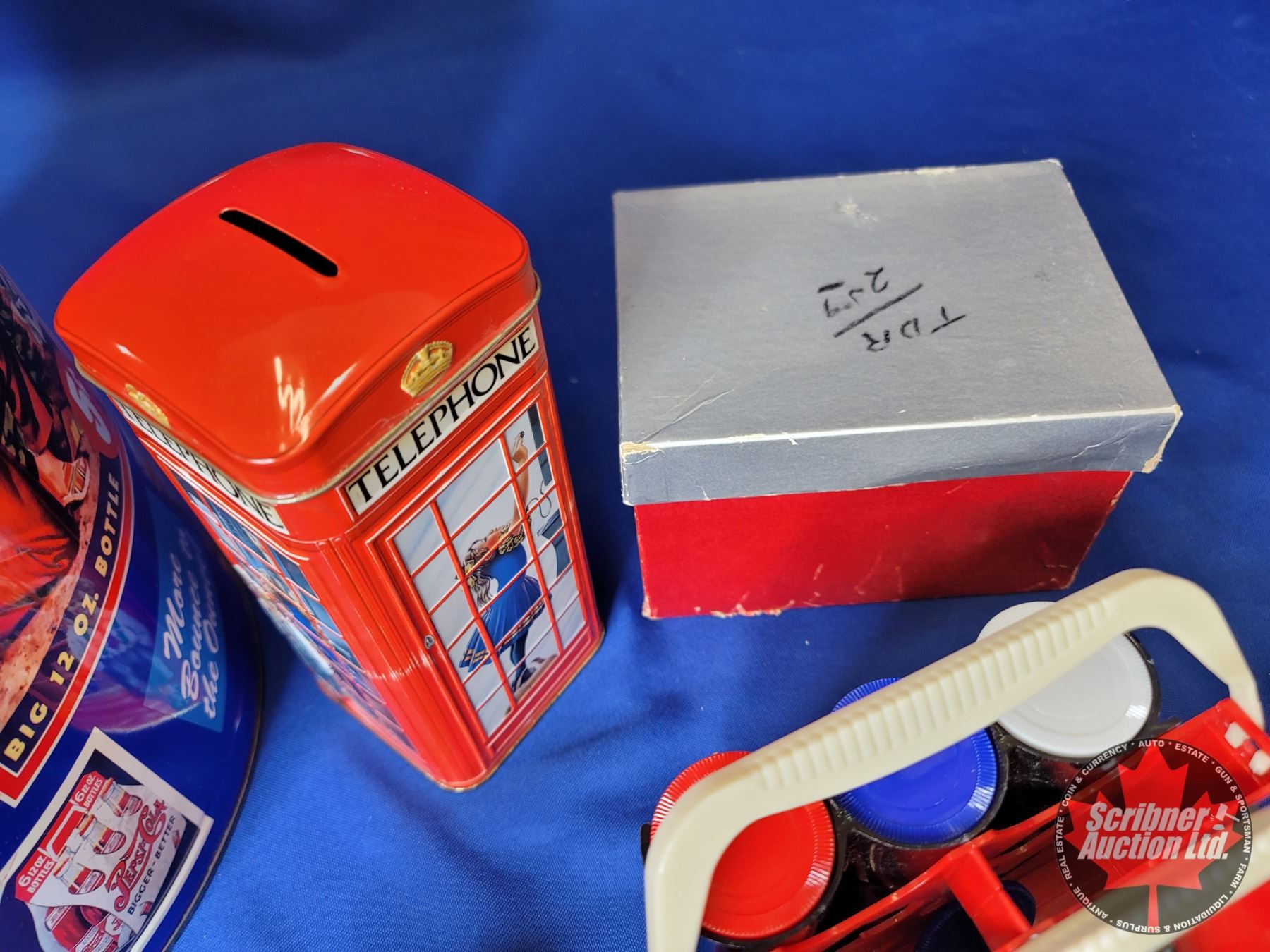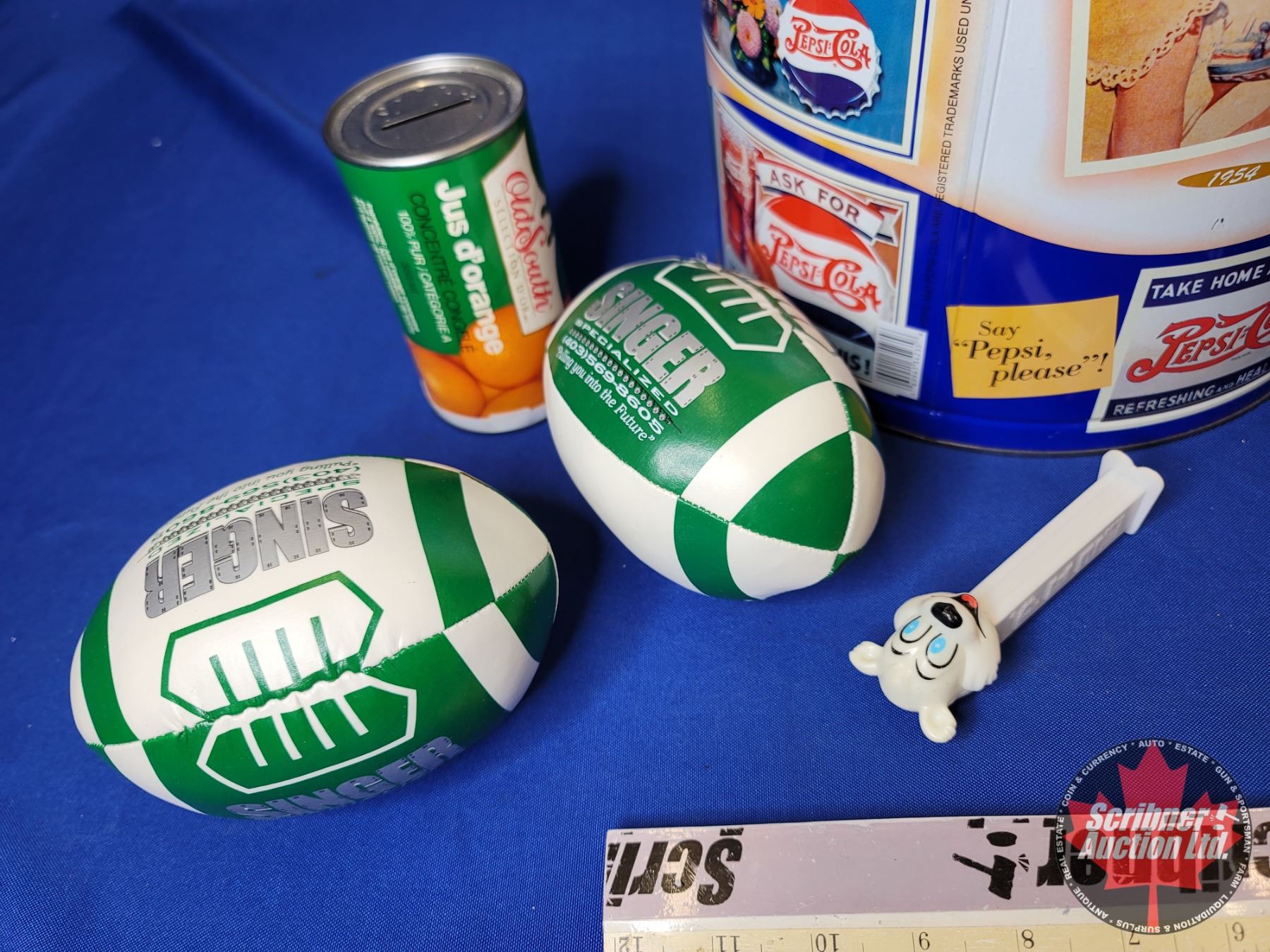 Collector Combo : Pepsi Cannister (c.1993), Foam Footballs (2), Pez Dispenser, Coin Banks (Telephone