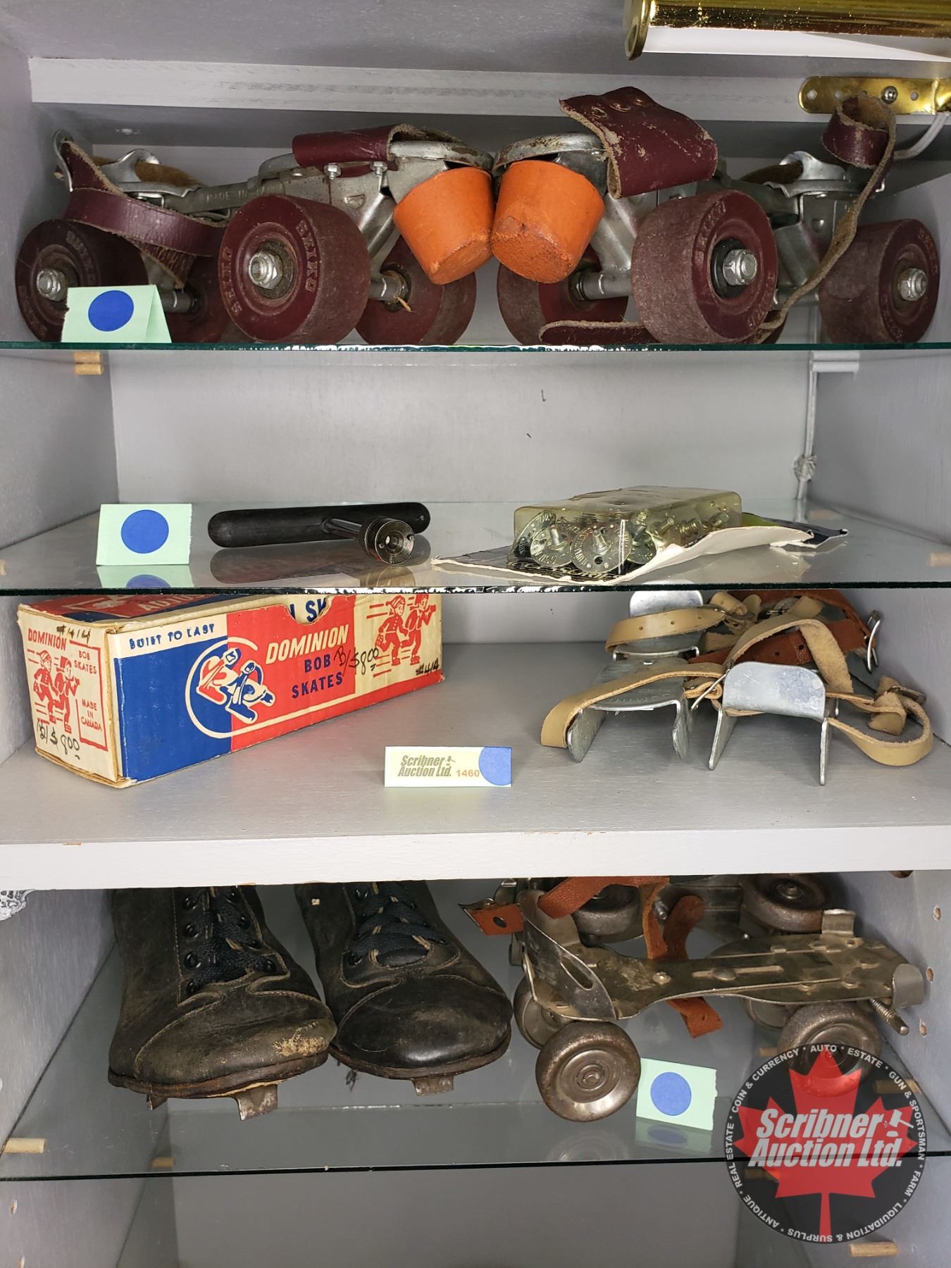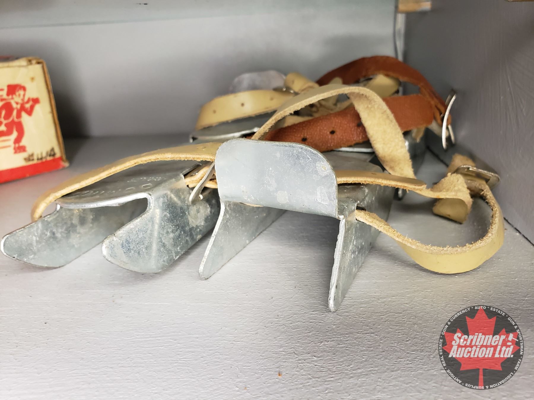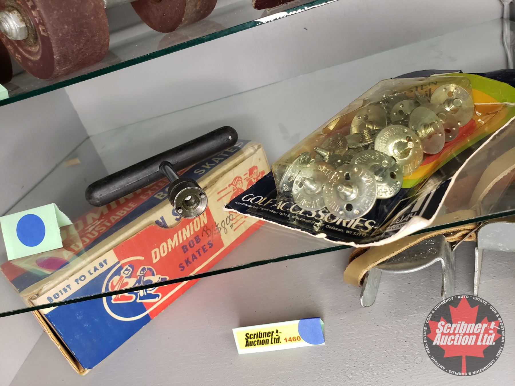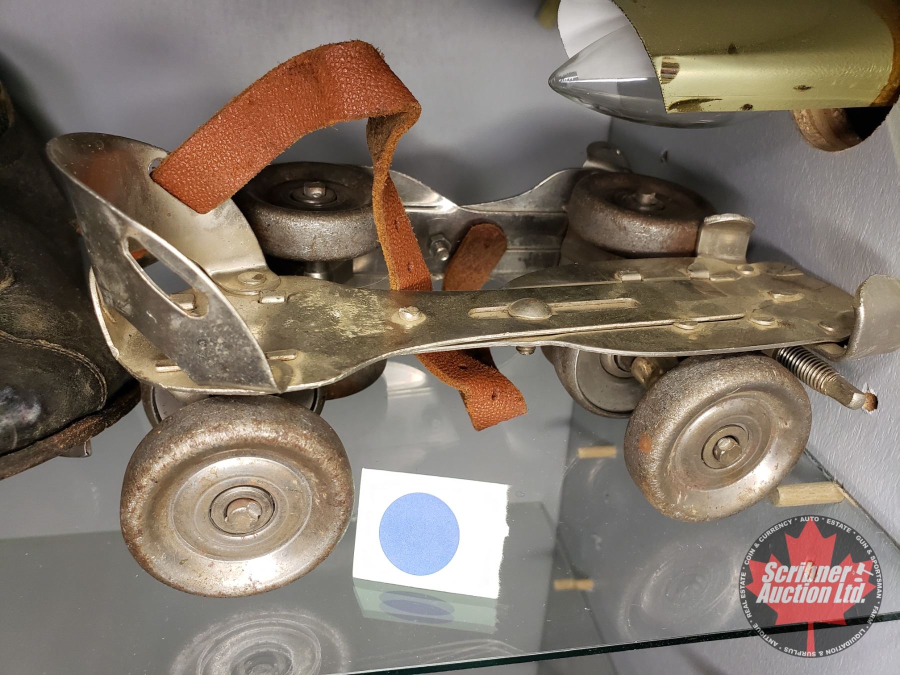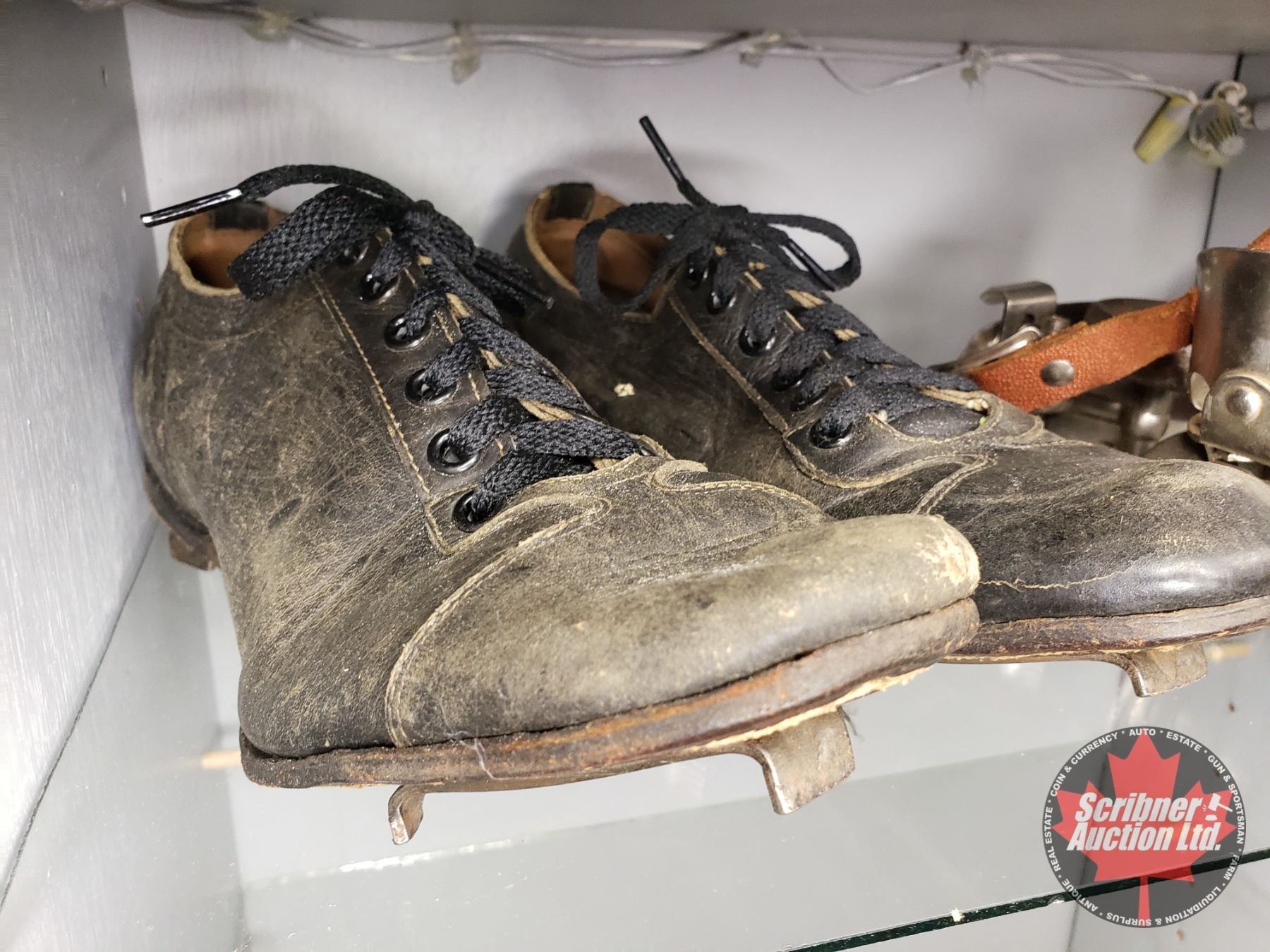 Collector Combo - Sporting Theme: Strap on Roller Skates, Bobskates (2); Golf Spikes w/Tool, 2 Pair Roller Skates, 1 Pair Cleated Leather Shoes (See Pics)