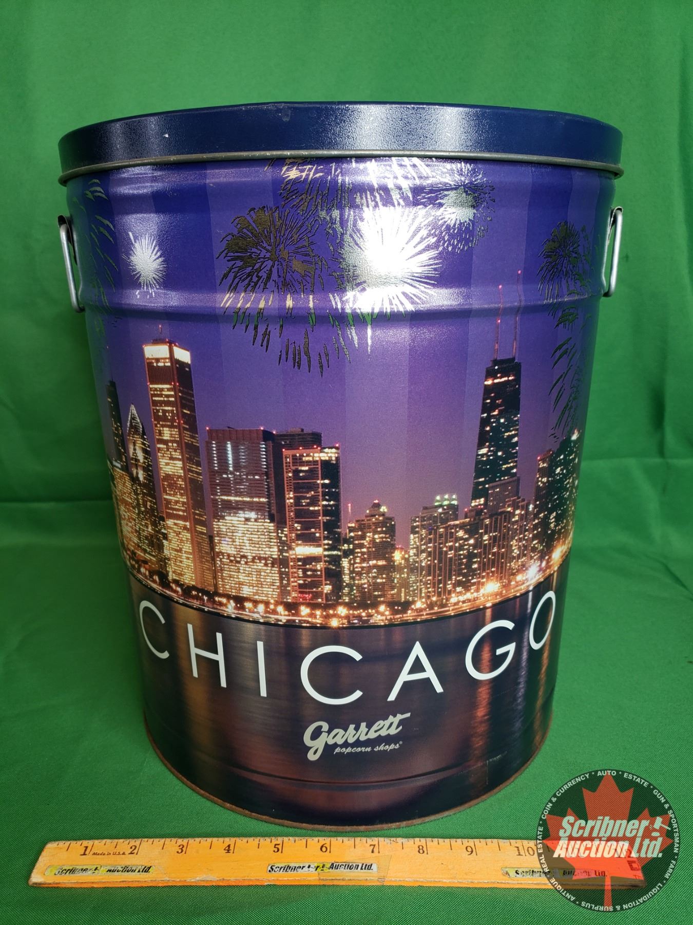 Collector Combo : Tin "Chicago" Popcorn Pail, "Taxi Tours" Wall Clock & "Martinis!" Novelty Tin Sign (Pail Measures : 14-1/4"H x 12-1/4"Dia) (SEE PICS!)