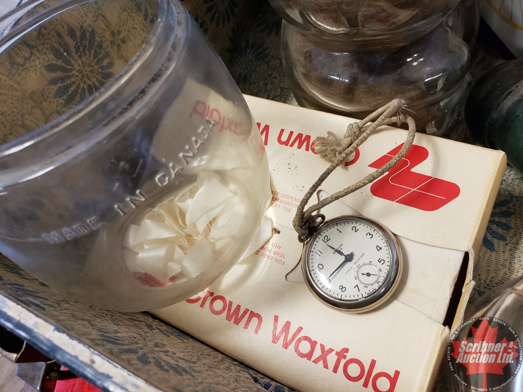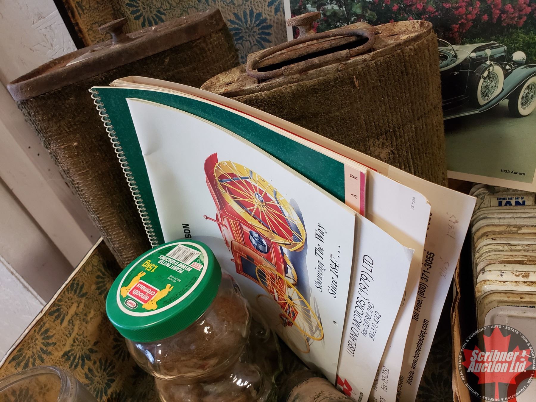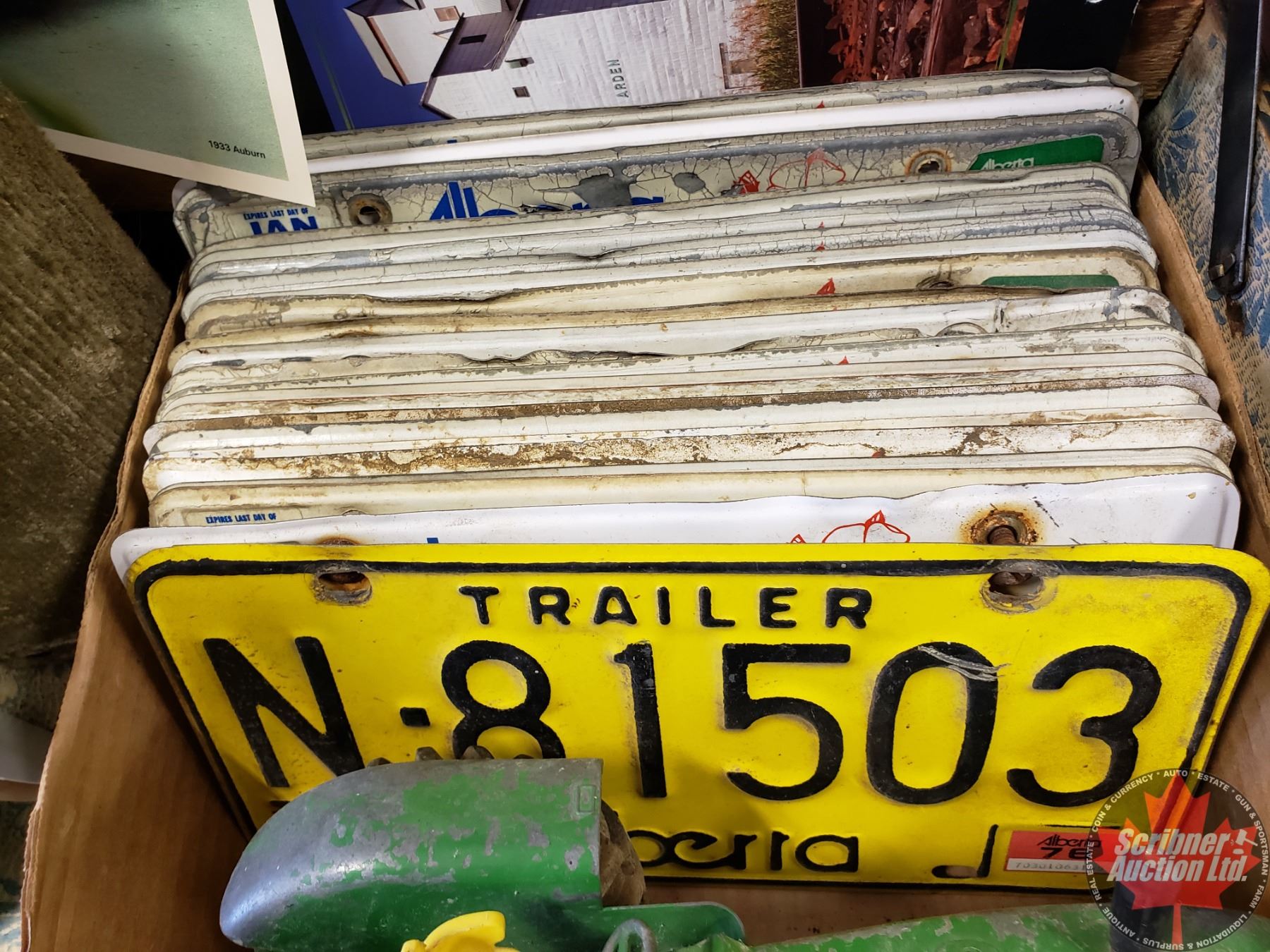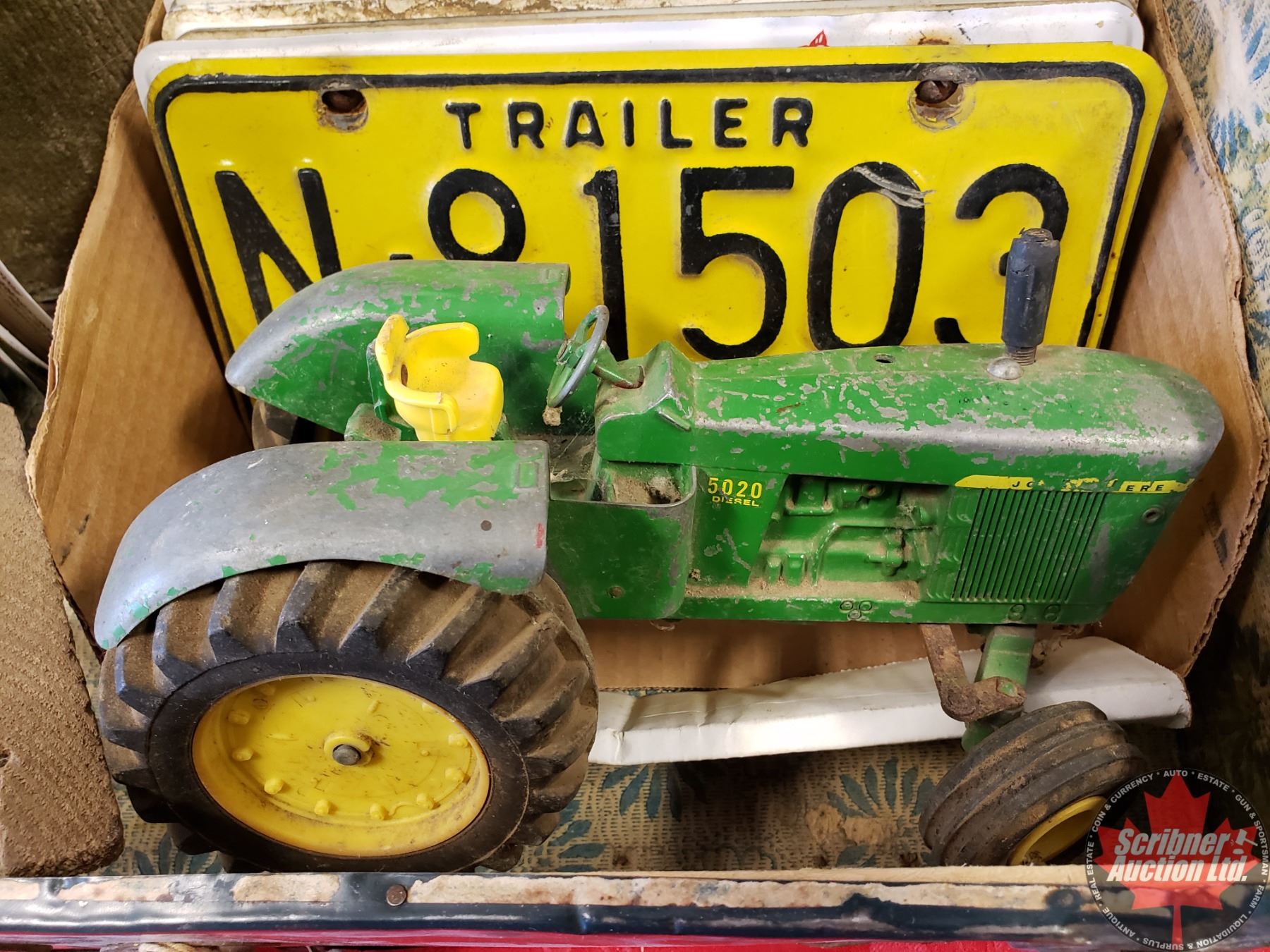Collector Combo - Trunk Lot - Hardshell Suitcase/Trunk, Variety of License Plates, JD 5020 Tractor, Foot Warmers (2), Pocket Watch, Jars, Insulator, Calendars, etc. (Must See Pics)