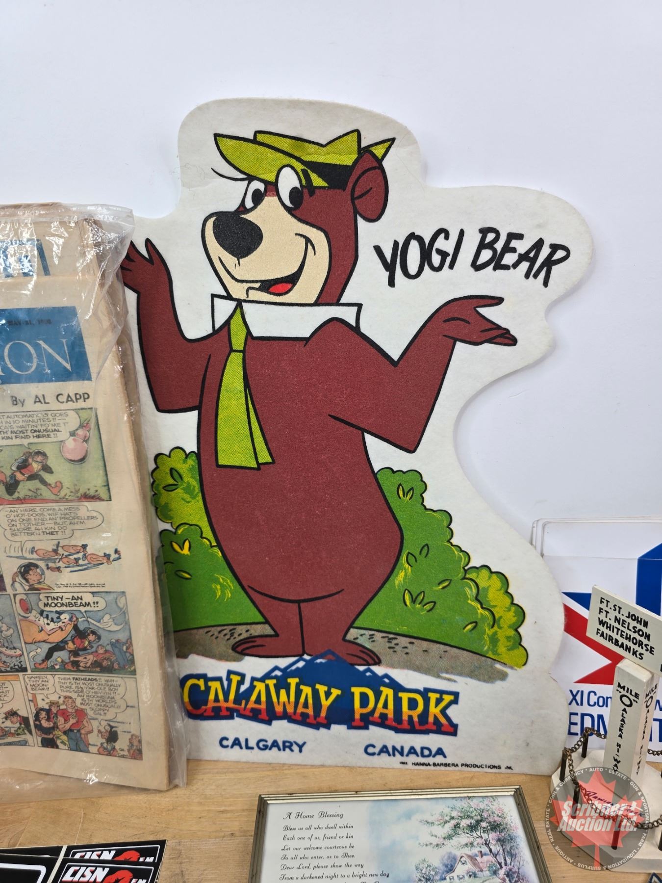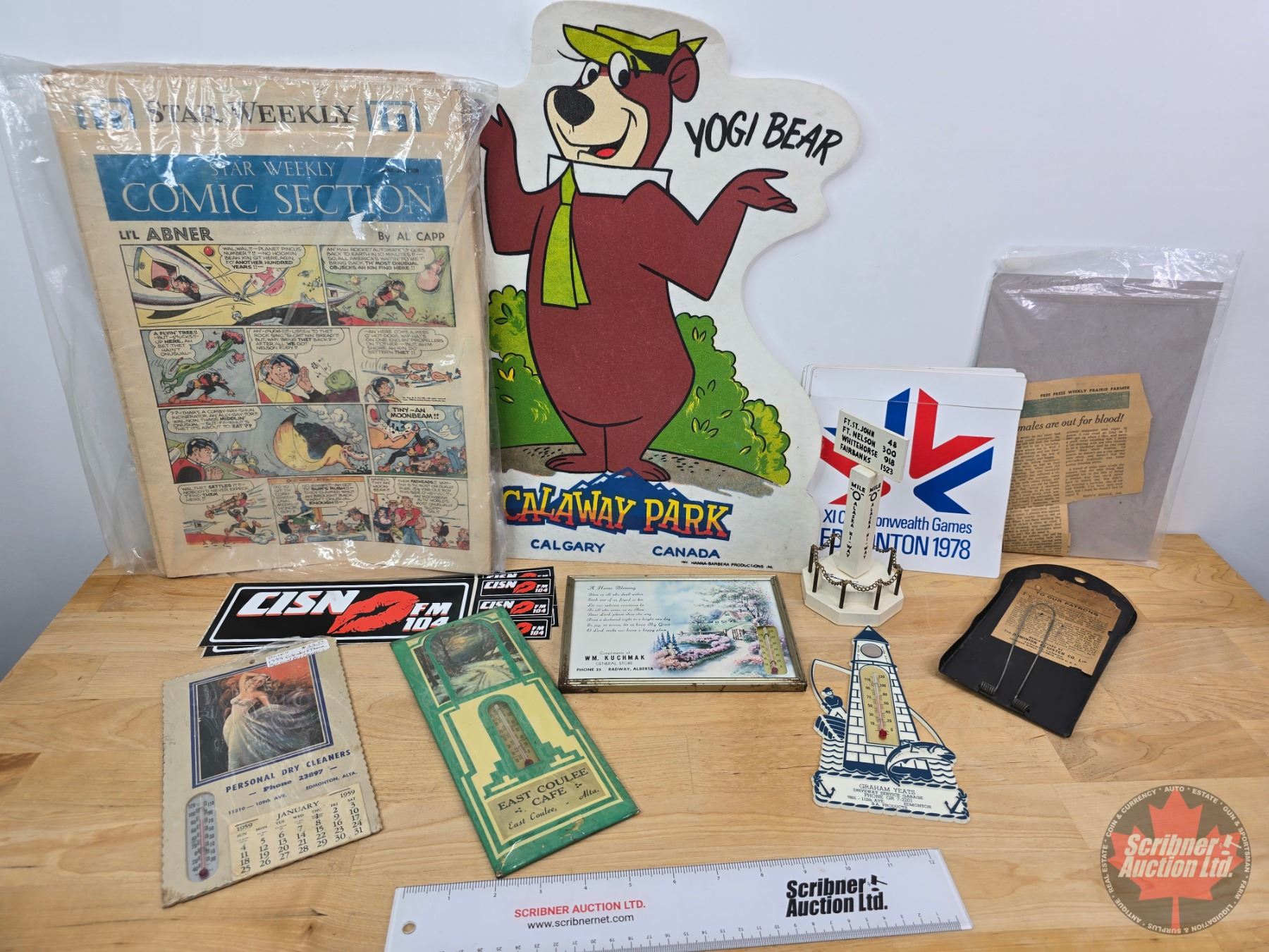 Collector Combo (Variety Items) : Calaway Park Yogi Bear Felt Display; Advertising Thermometers; CISN FM Bumper Stickers; Newspapers; Clippings; etc!