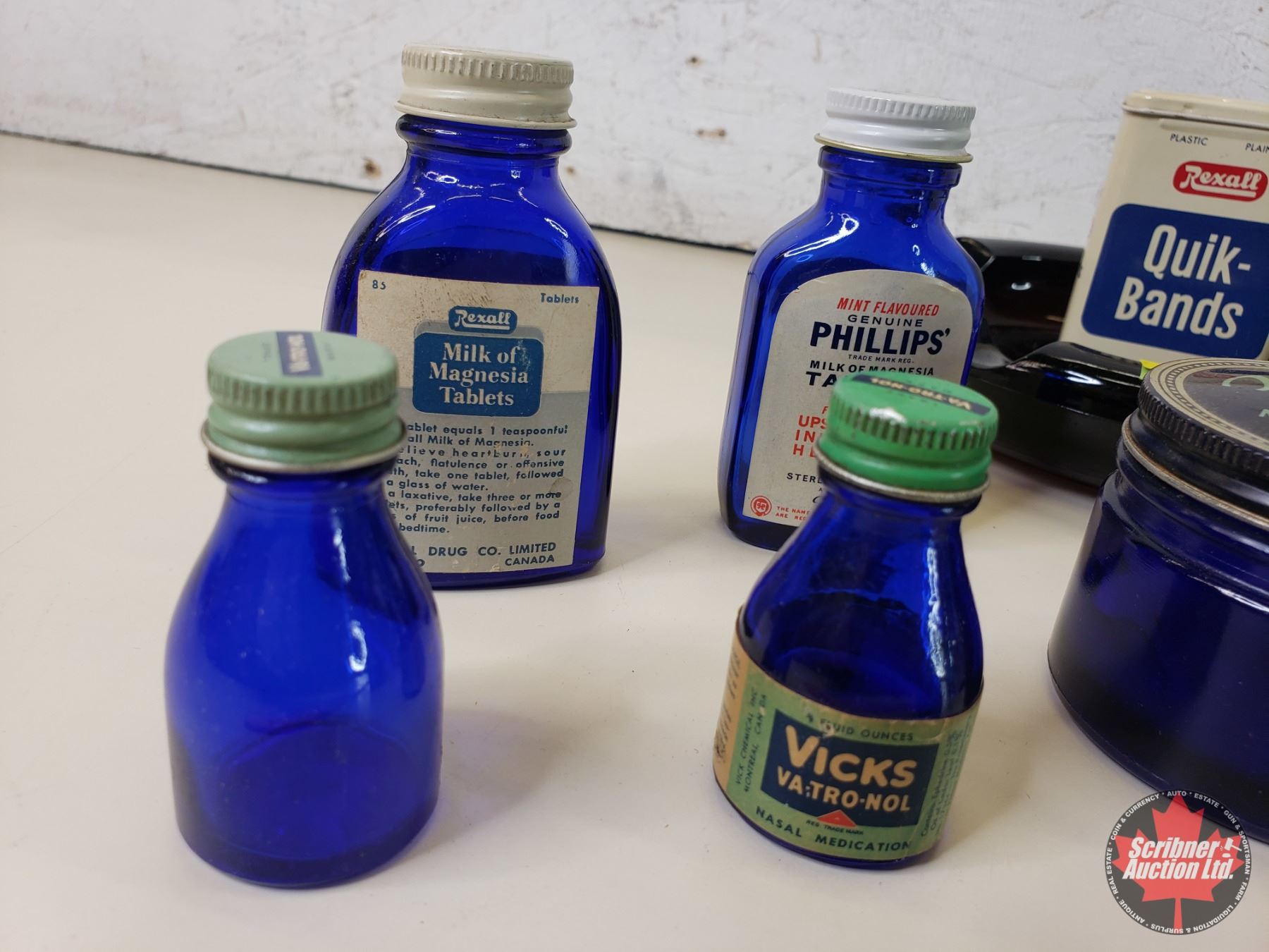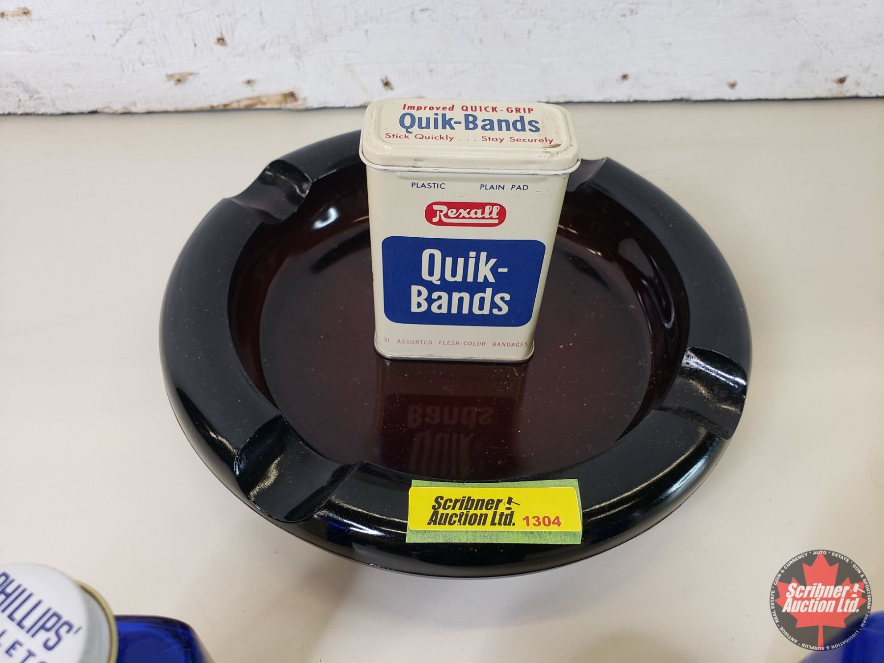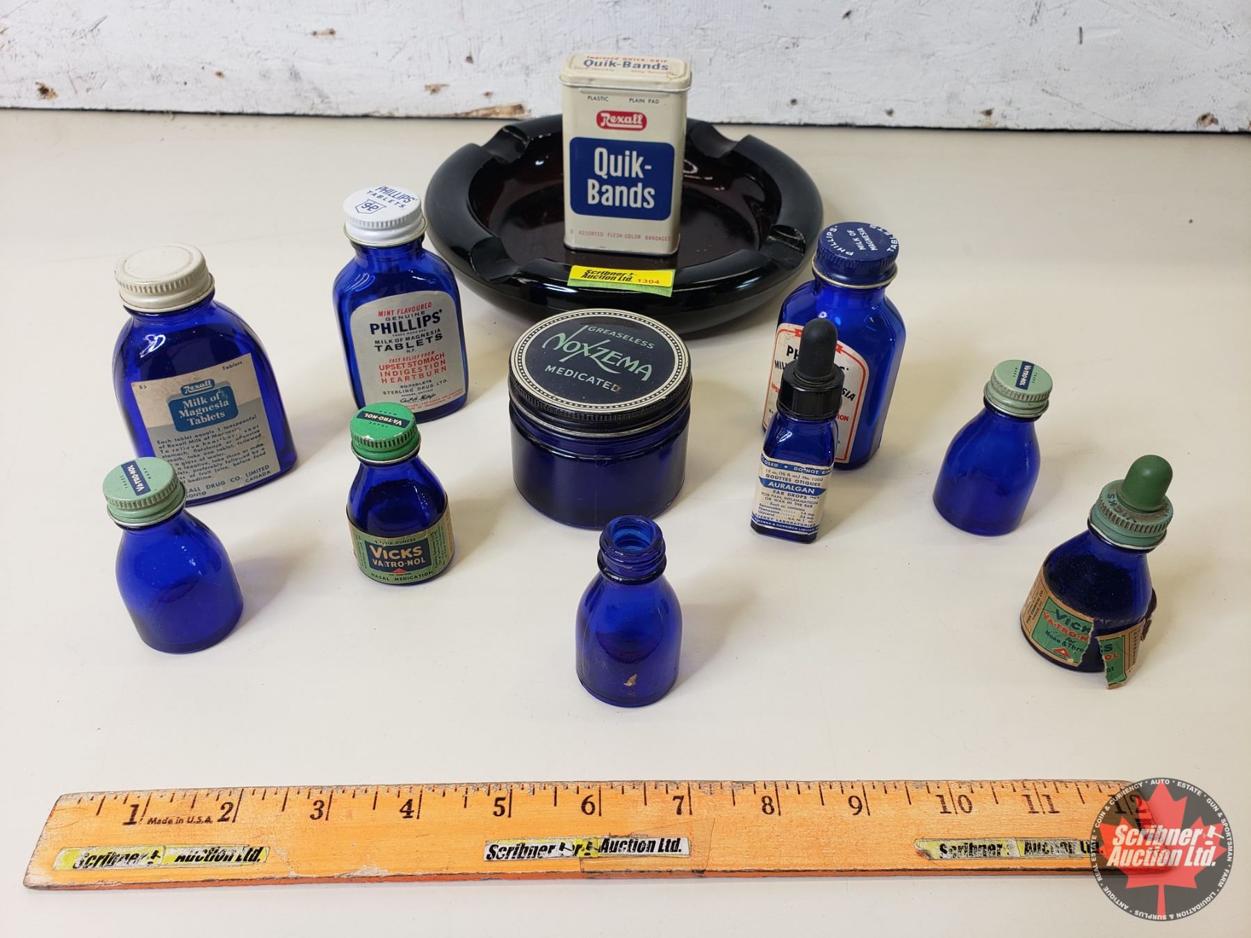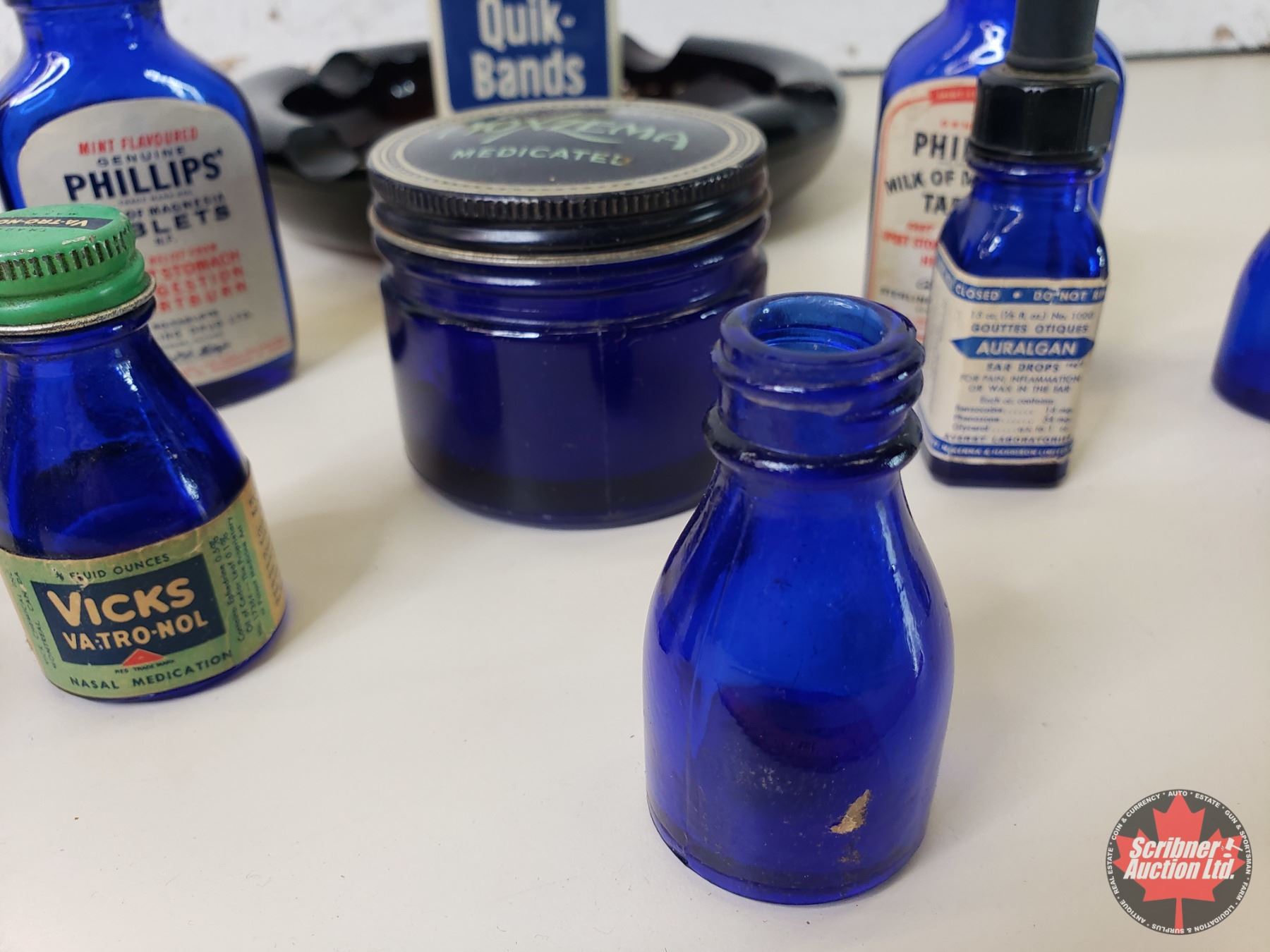 Collector Combo : Variety of Blue Glass Bottles; Noxzema Jar; Quik-Bands Tin & Ashtray (8"Dia) (SEE PICS!)